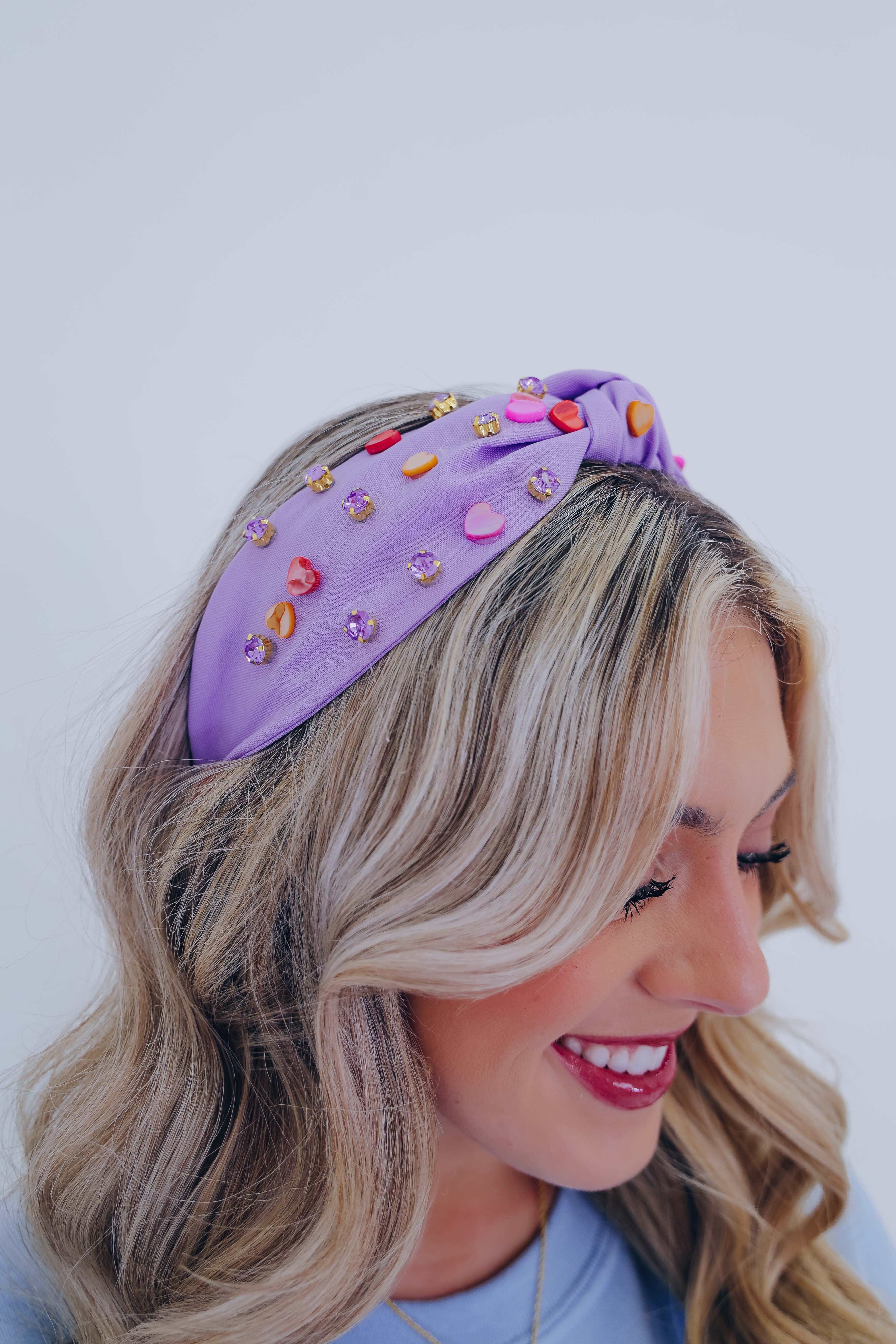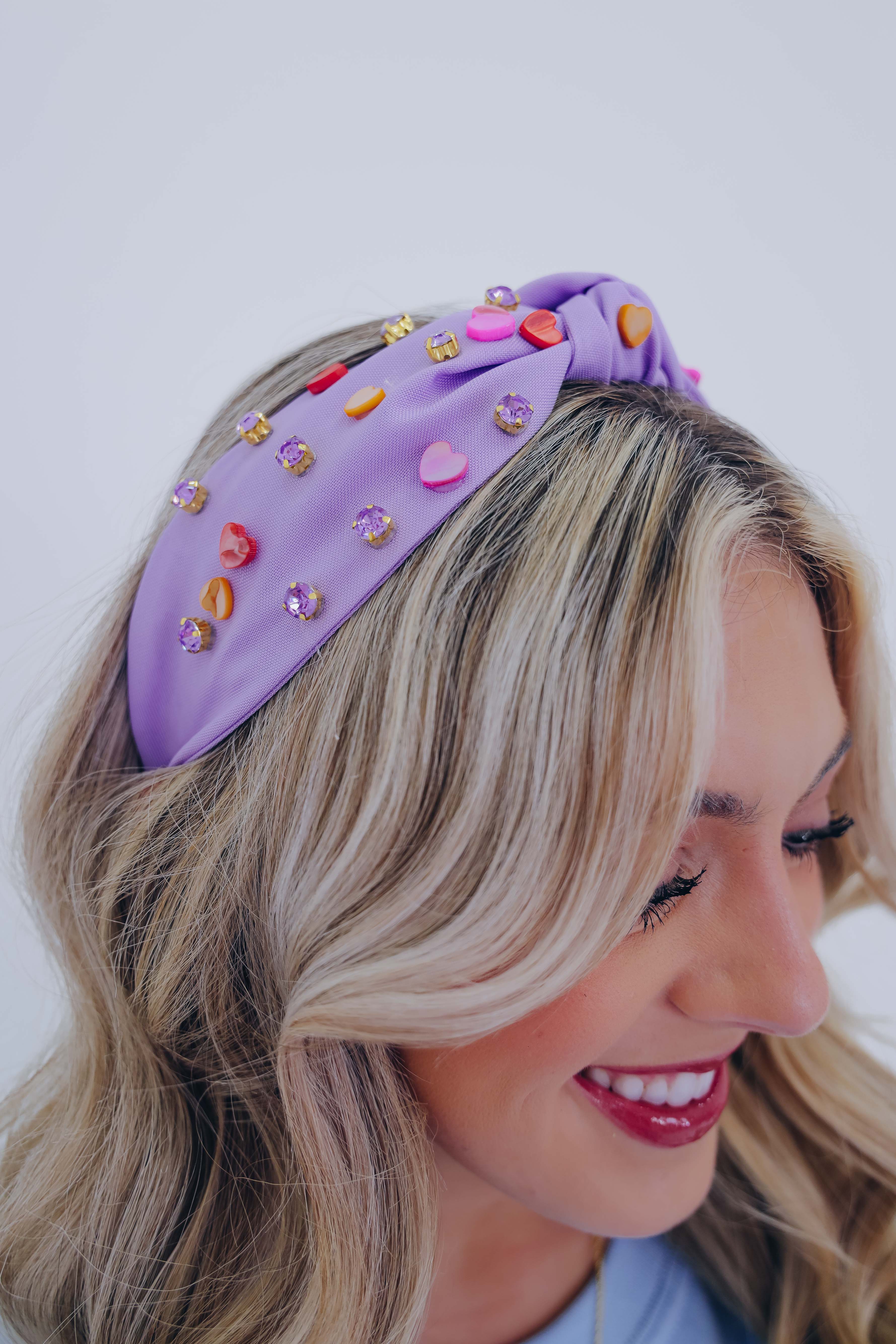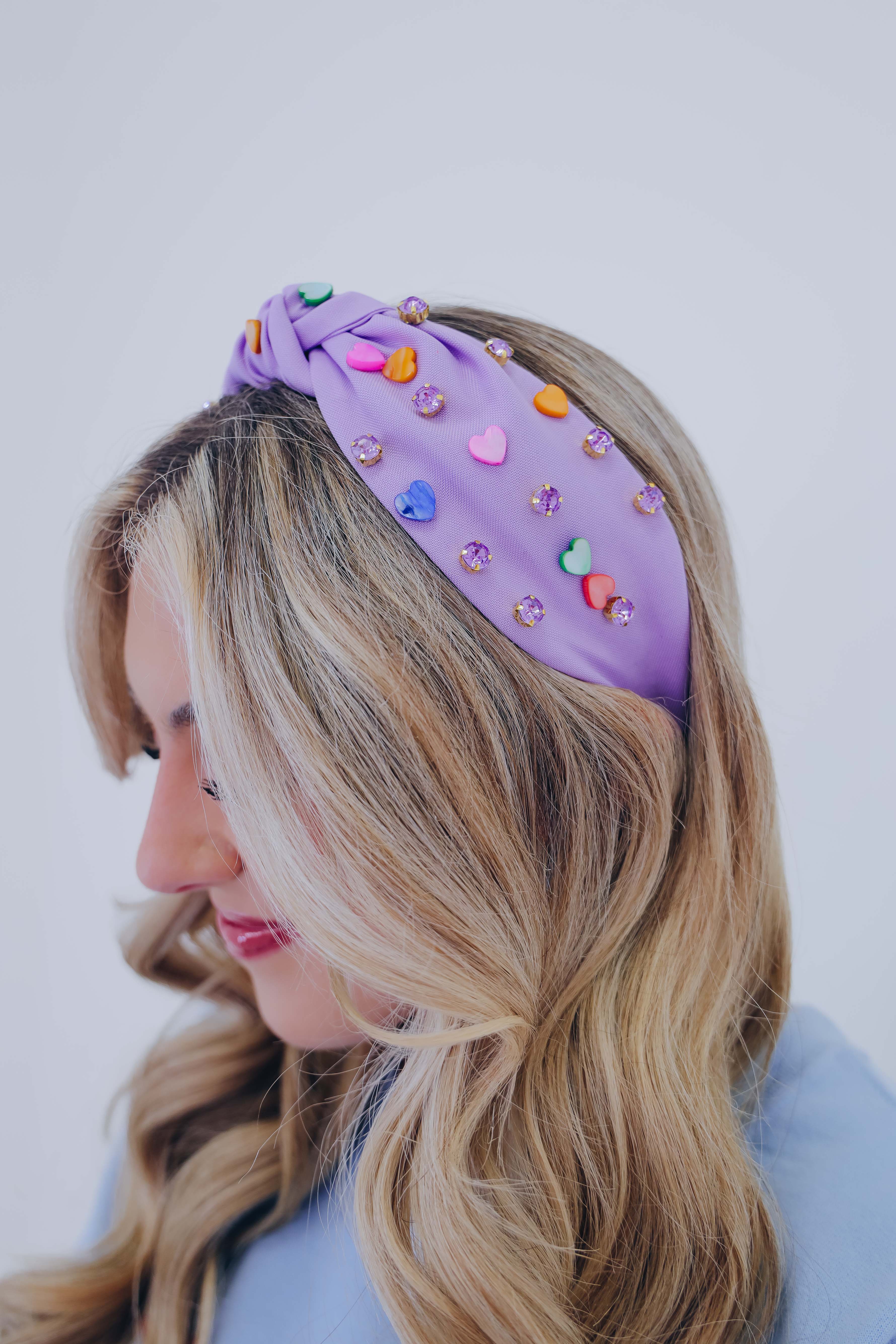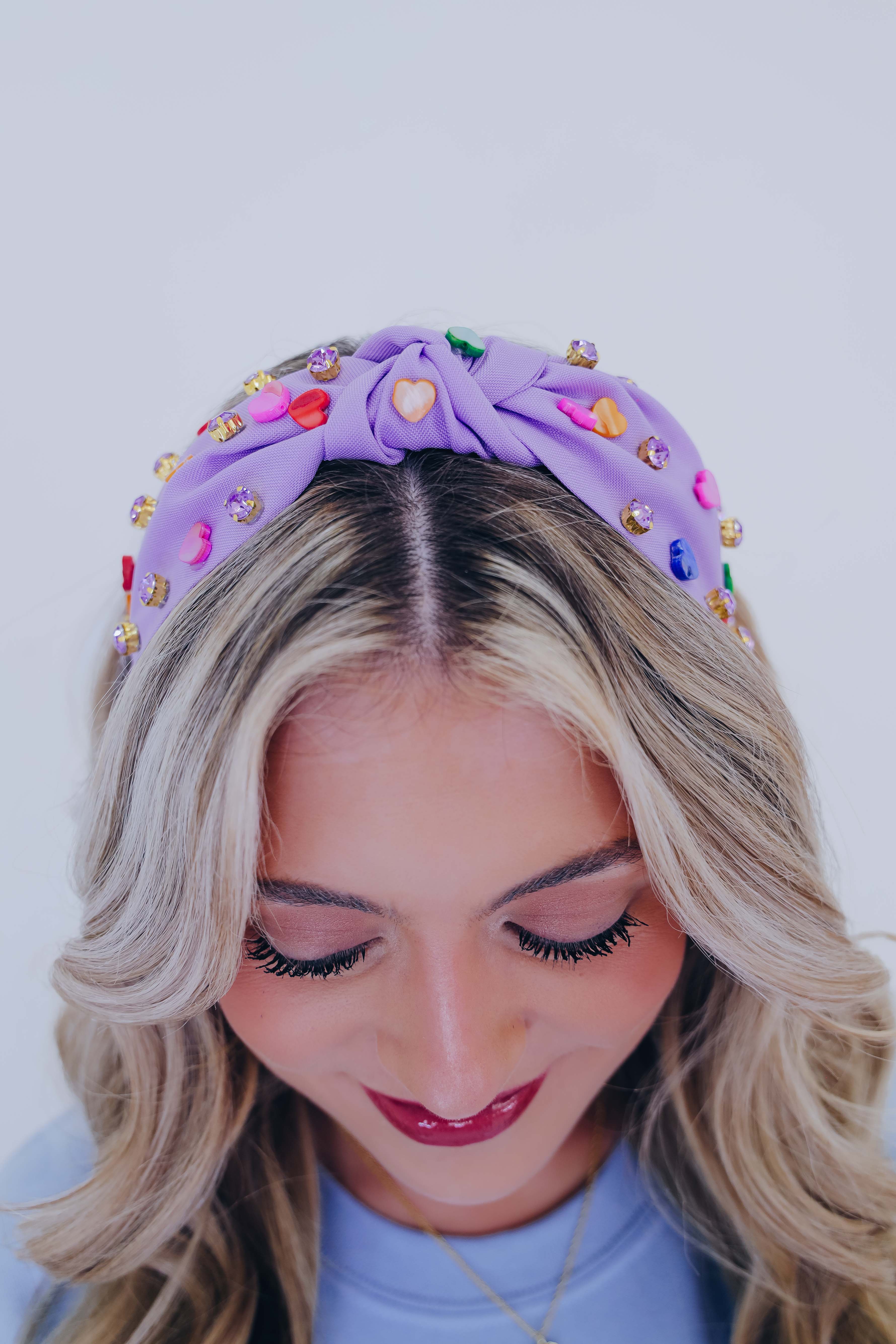 - Featuring a knotted headband adorned with colorful stones and small pearlescent hearts throughout.