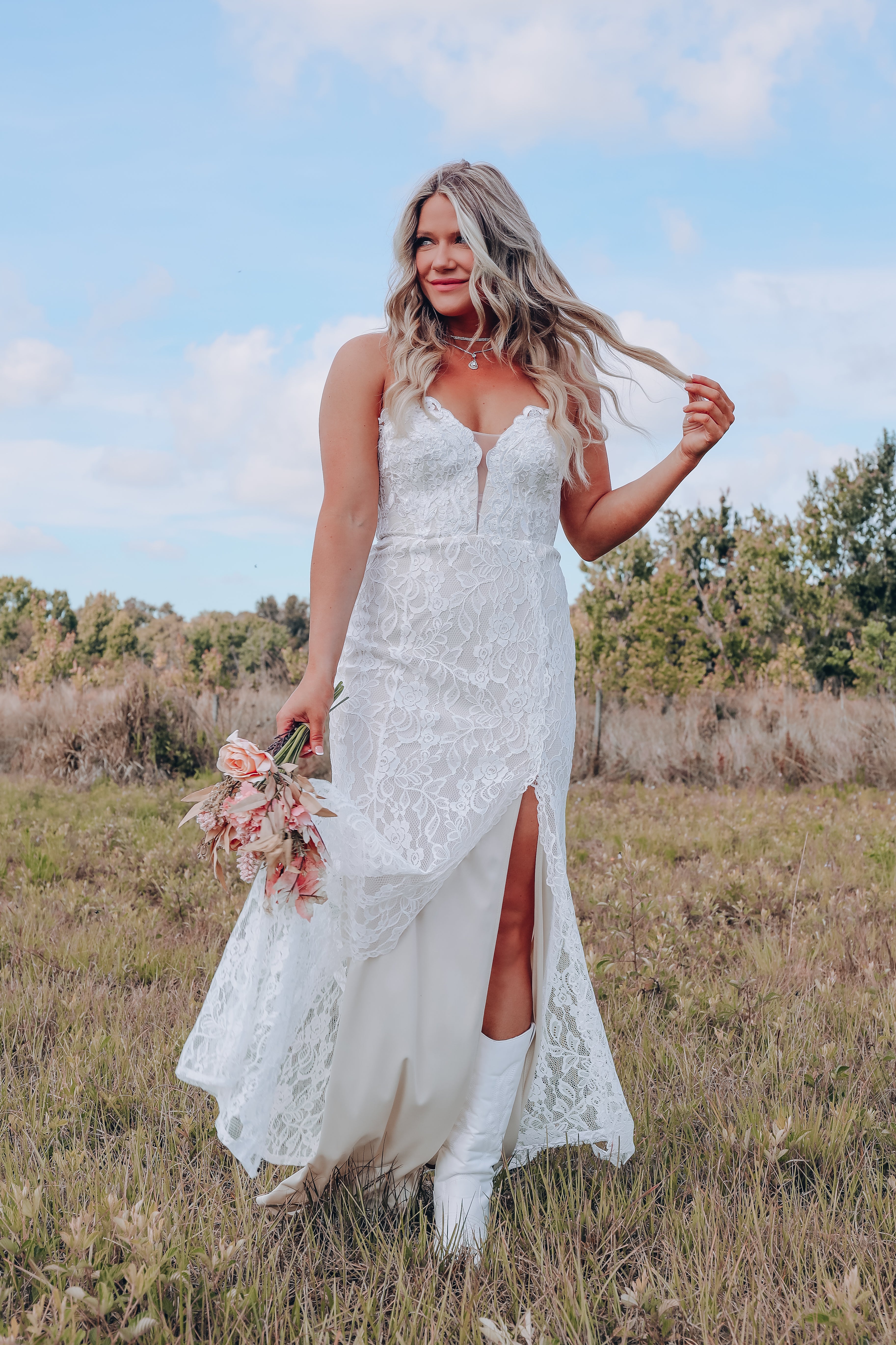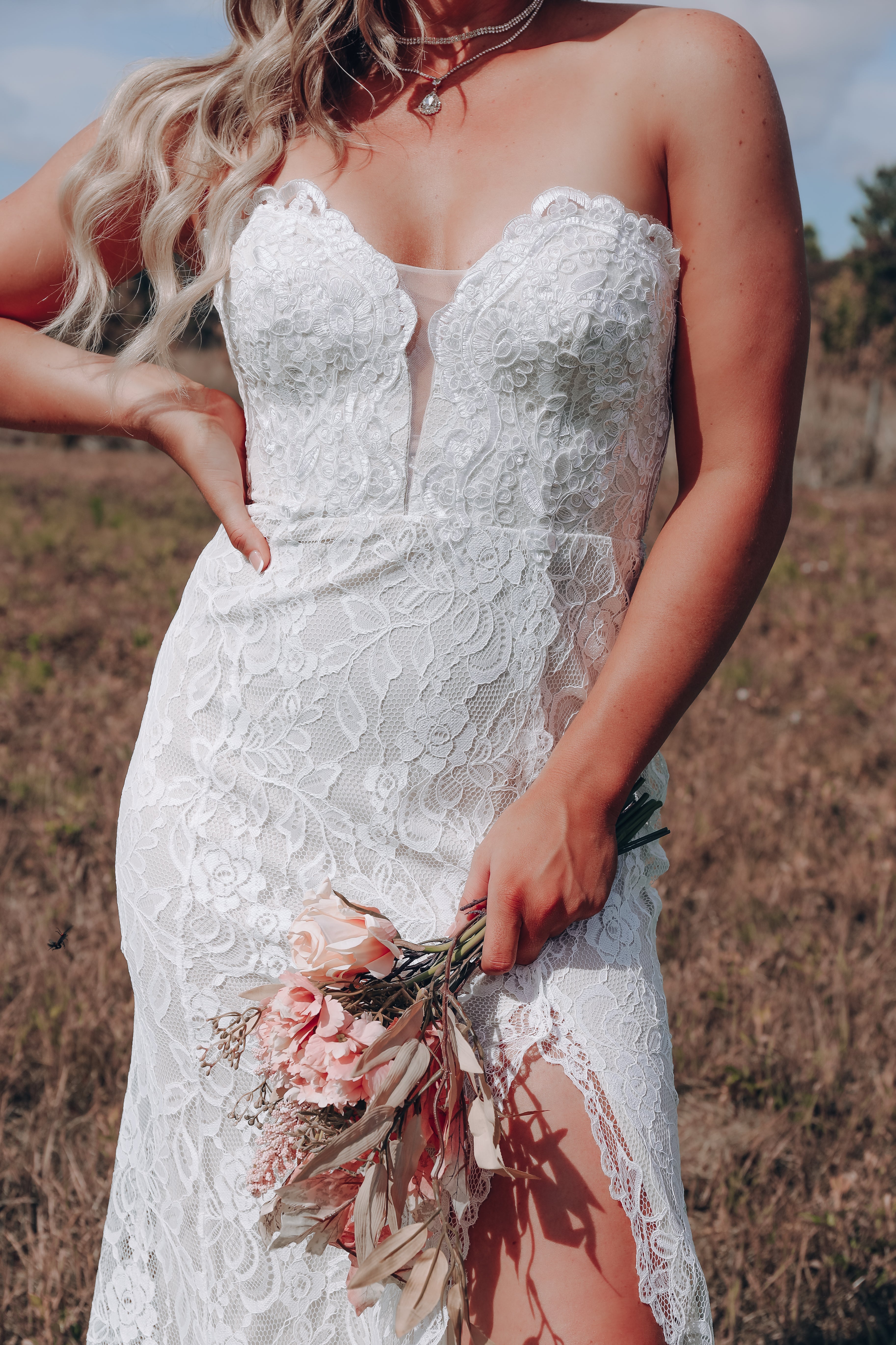 - Having a simple elegant wedding and need the perfect dress? Look no further, our "Lovely In Lace Strapless Maxi Dress" will be a stunner for your special occasion! We added a pop of bling with our Drops of Diamonds Necklace Set - Gold.