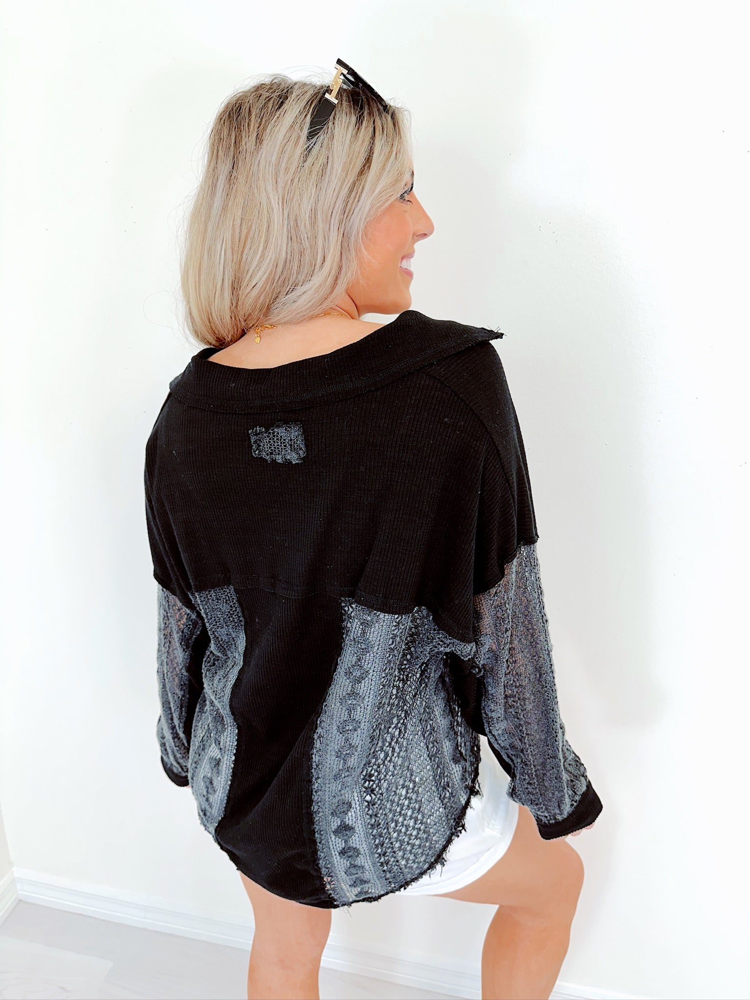 - Features a solid yoke and completely see through body, super soft polyester blend fabric, distressed raw edge detail throughout, knuckle length long sleeves, and a straight hem.