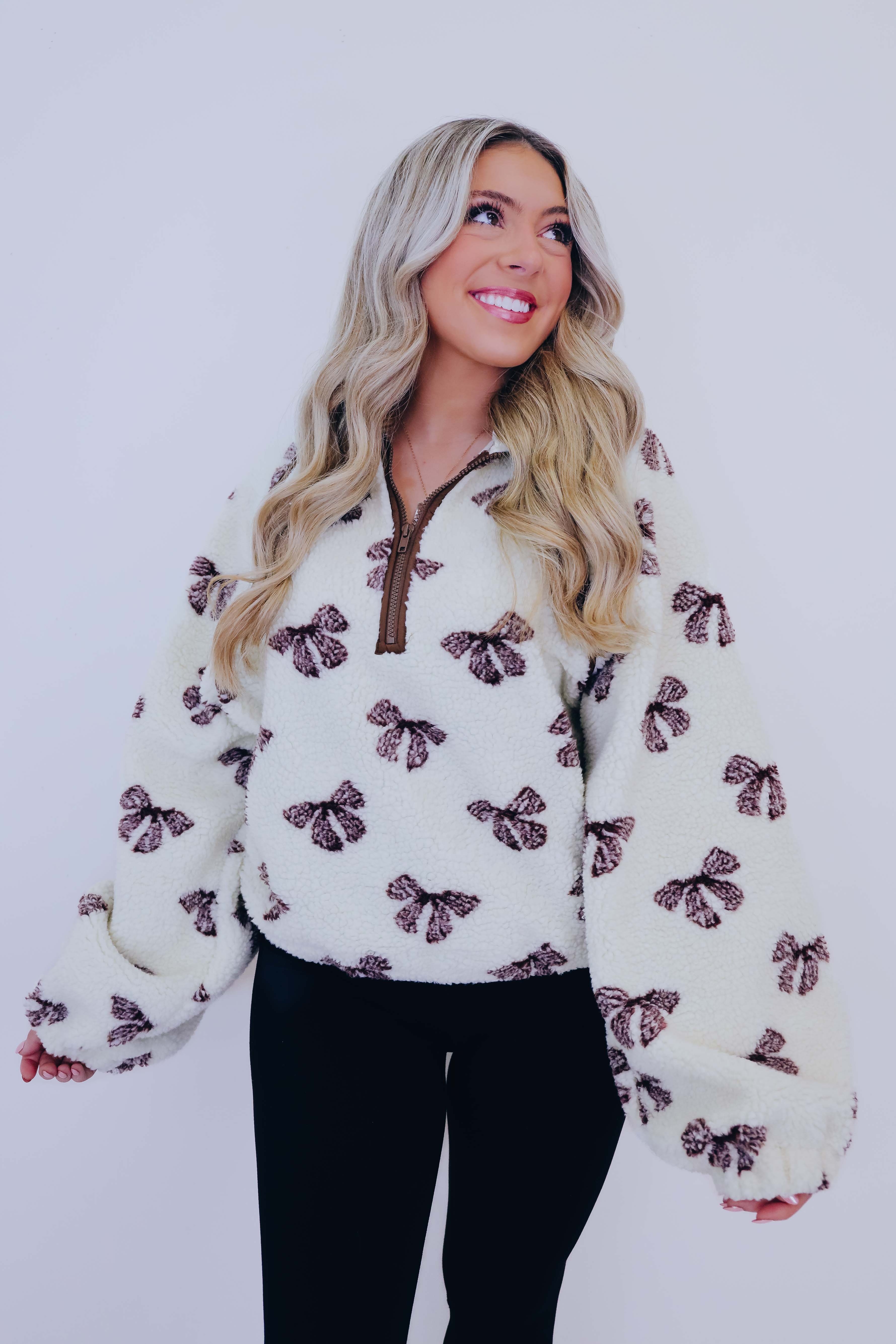 - Our cute Sophie Sherpa Pullover is perfect for any occasion. Its cozy and comfortable silhouette allows for easy styling for the perfect winter OOTD. With its trendy bow print, it's a must have addition to your winter wardrobe.