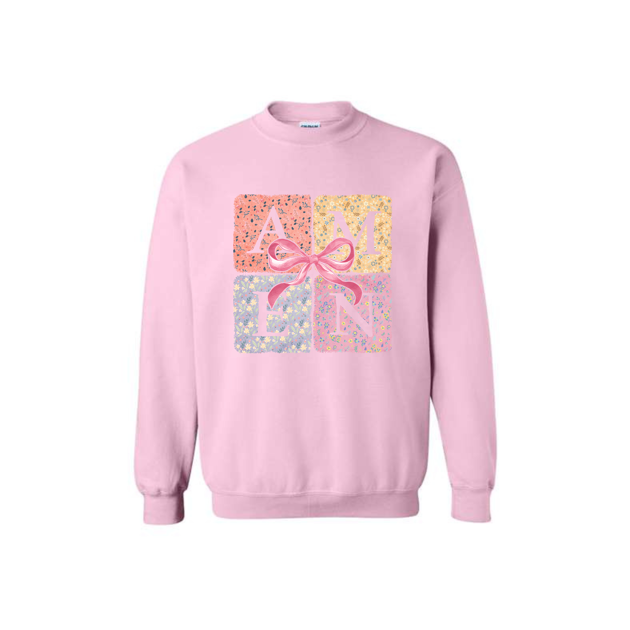 Features a Gildan poly-blend base, crew neck, long sleeves graphics include a a floral patch quilt design spelling AMEN in the squares.