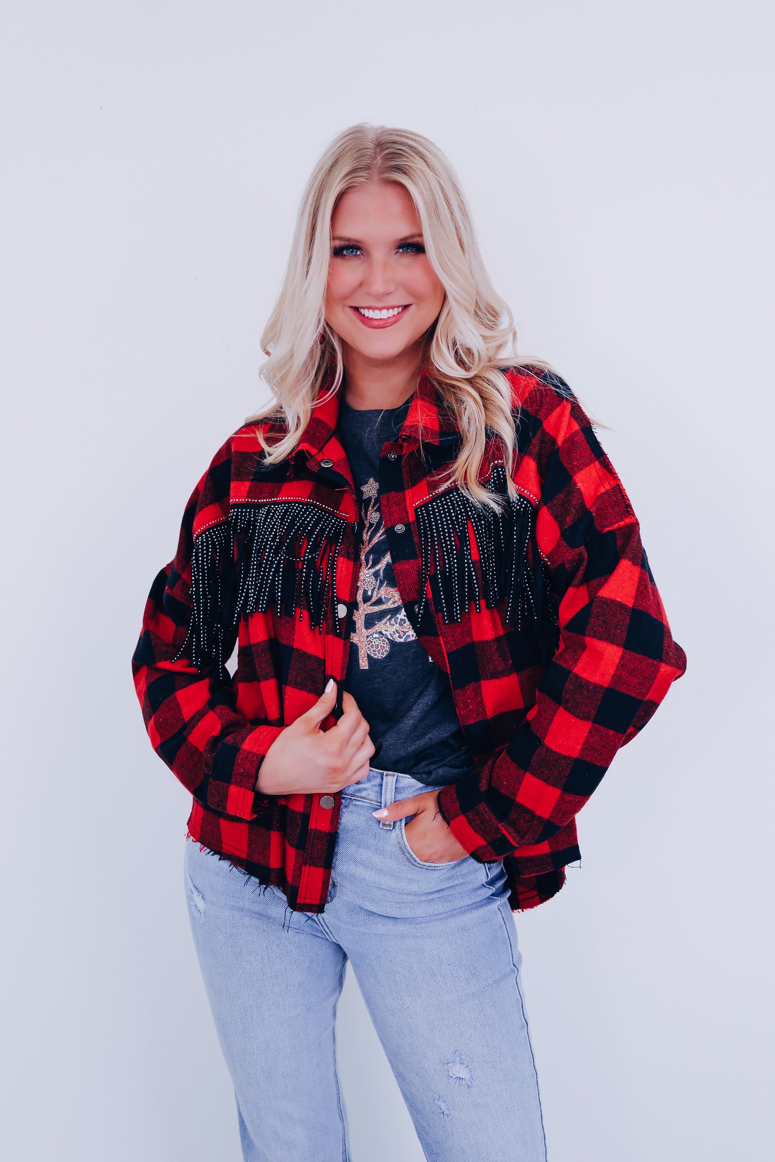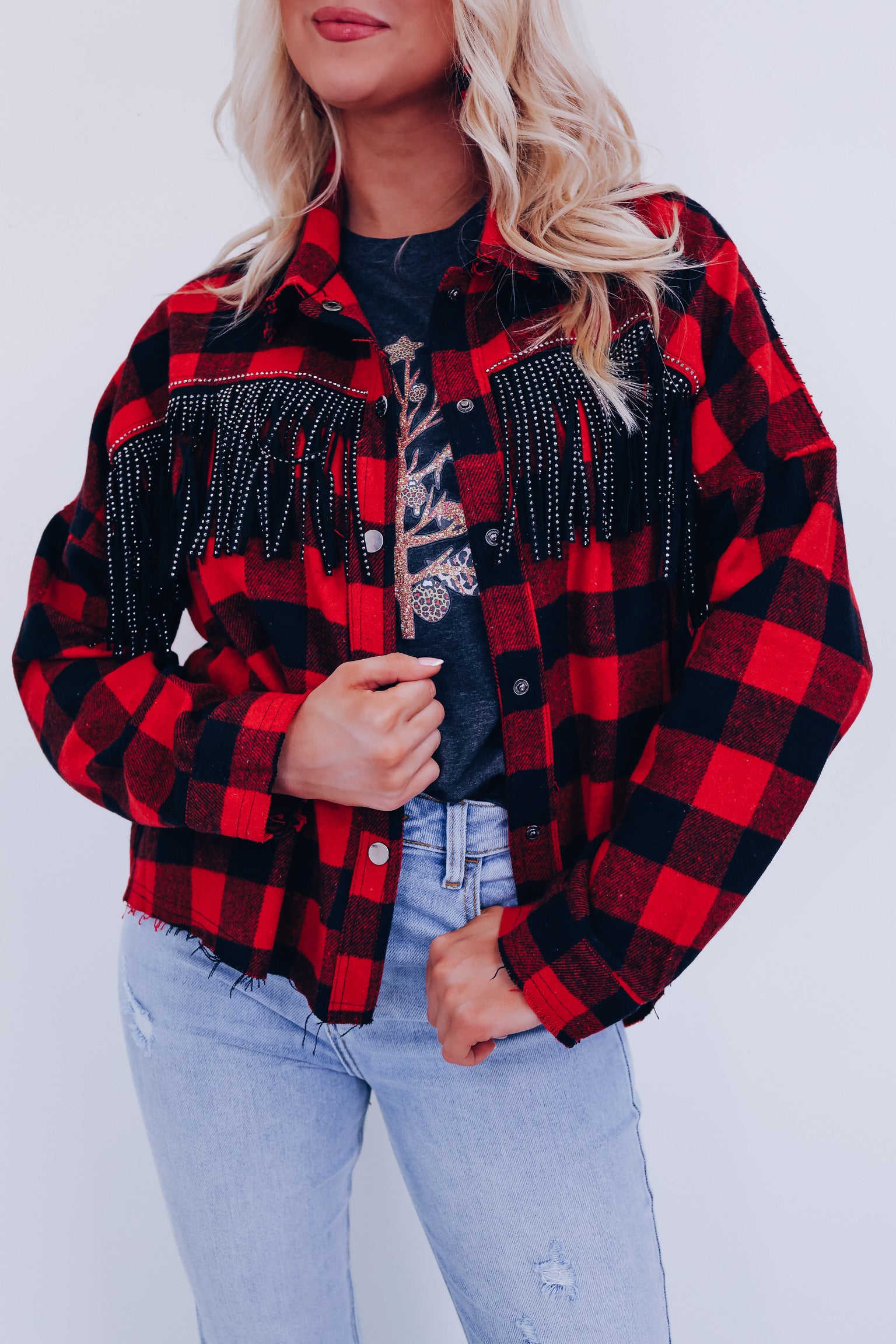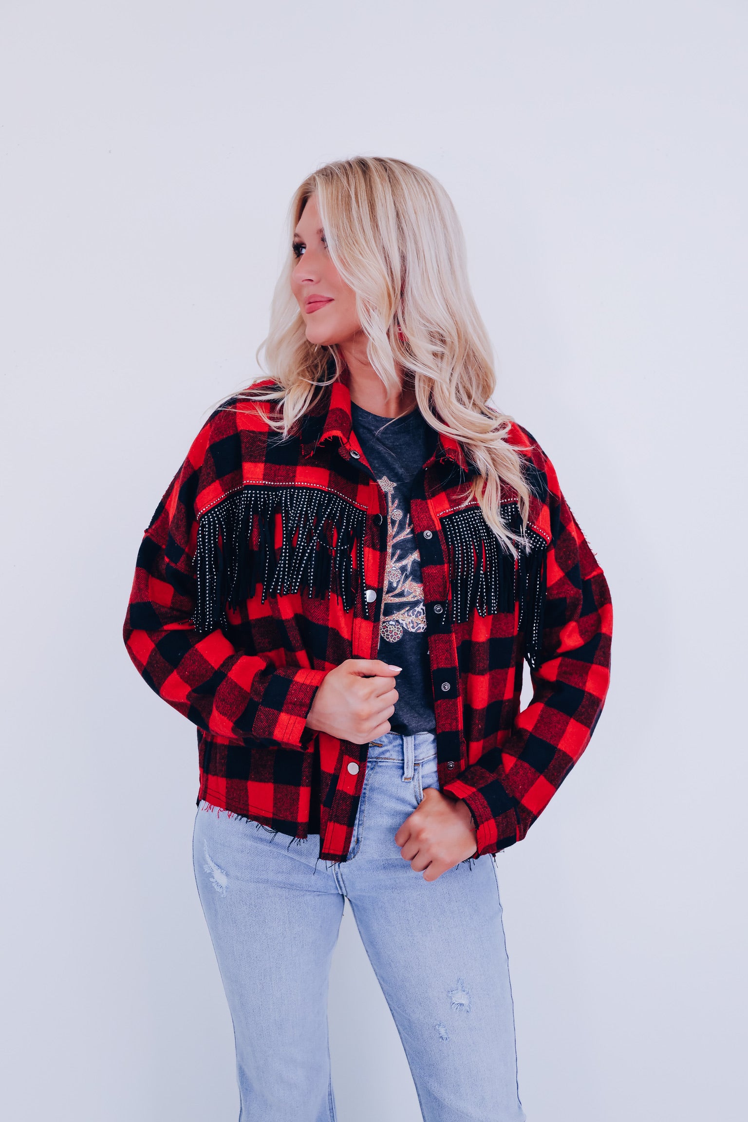 - Features a red plaid fabric, collared button down front, drop shoulder, long sleeves with button cuffs, rhinestone fringe across the front yoke, a raw edge and reverse seam detail throughout, and a raw edge cropped hem.
