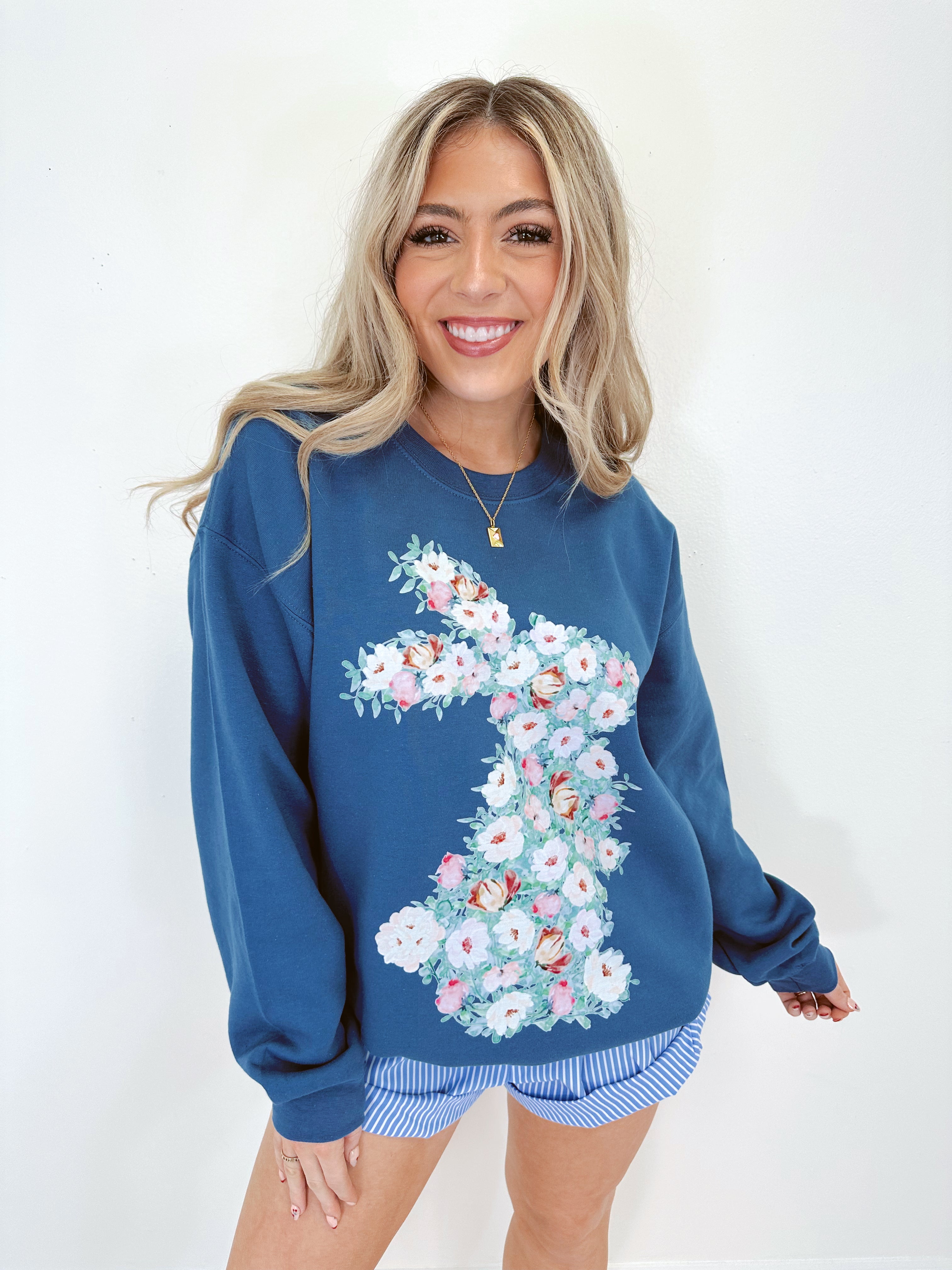 - Features a Gildan poly-cotton base, crew neck, long sleeves, graphics include a floral bunny facing the side and standing on her hind legs.