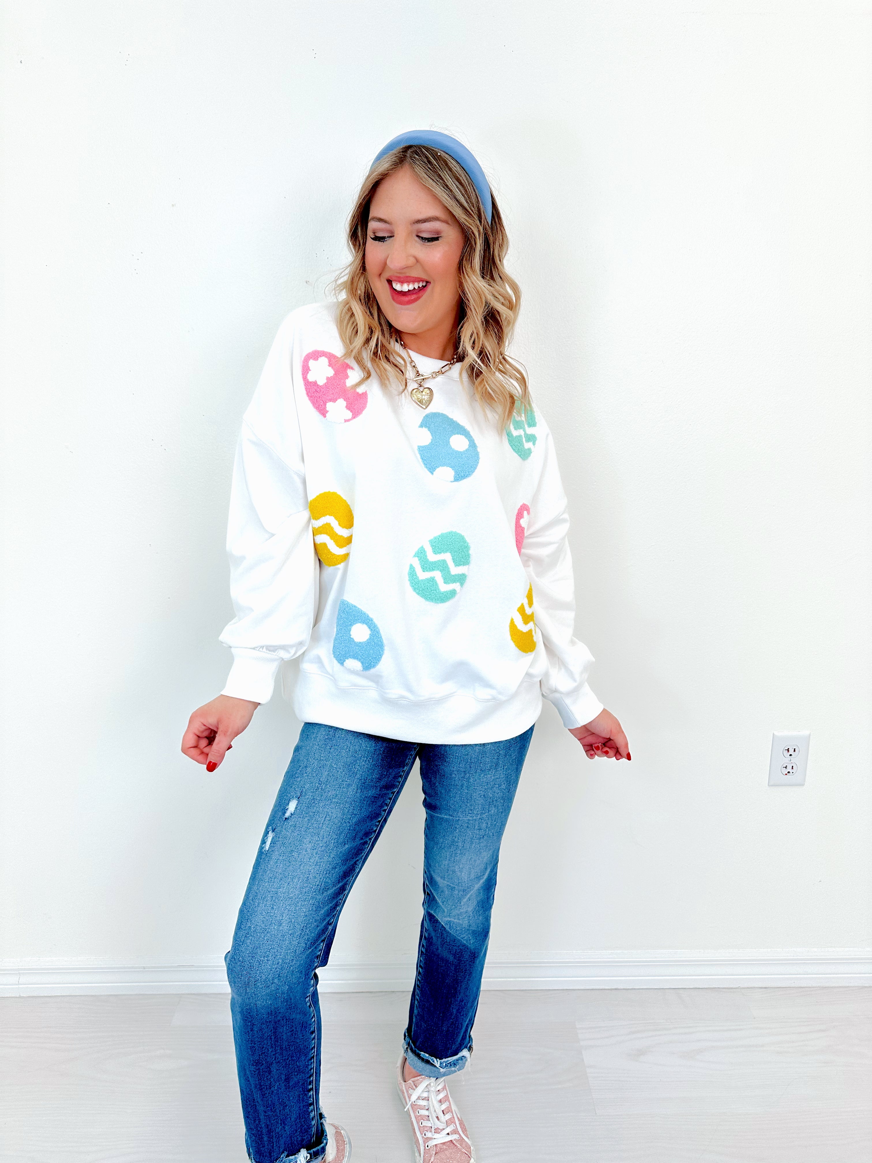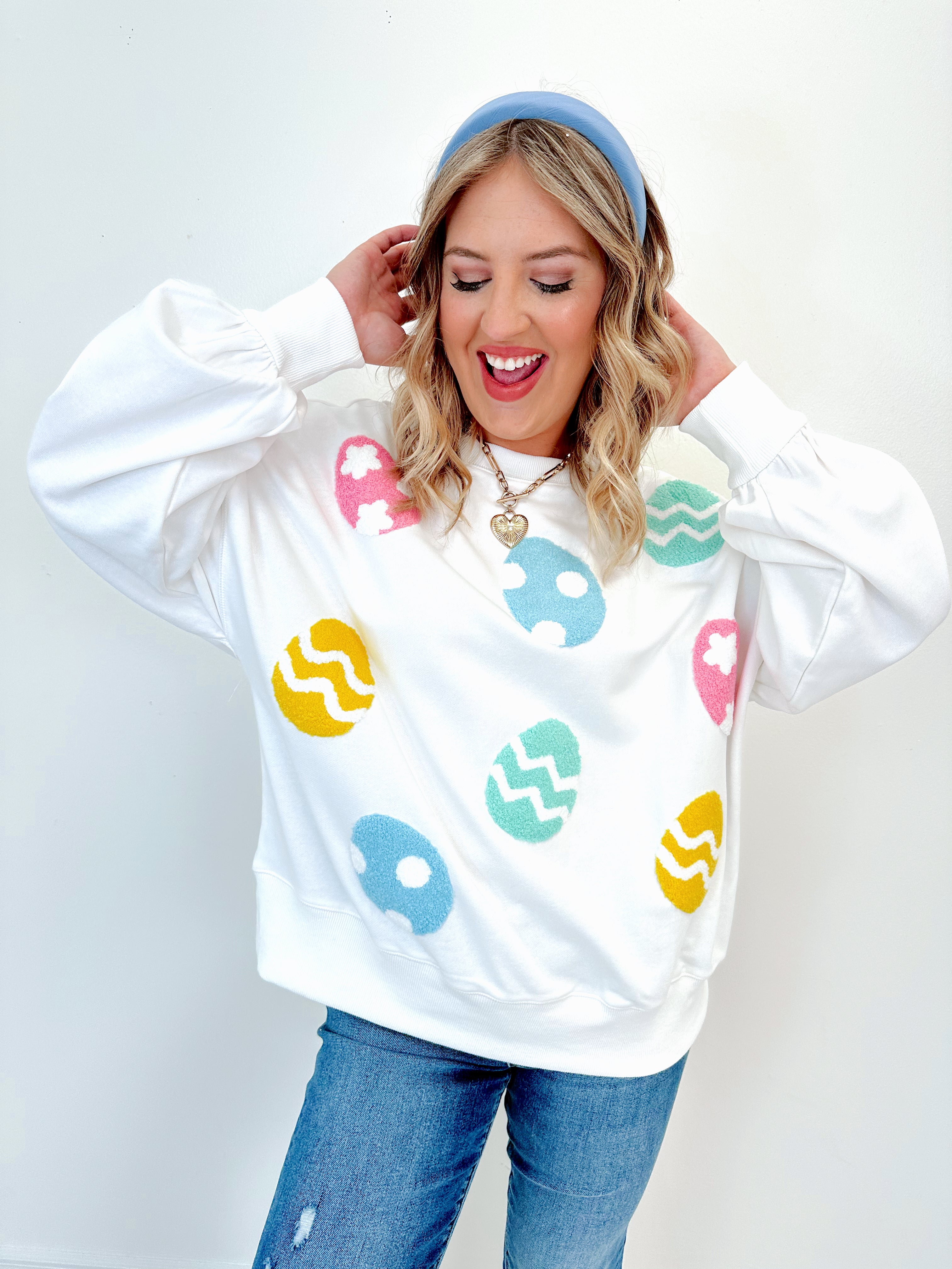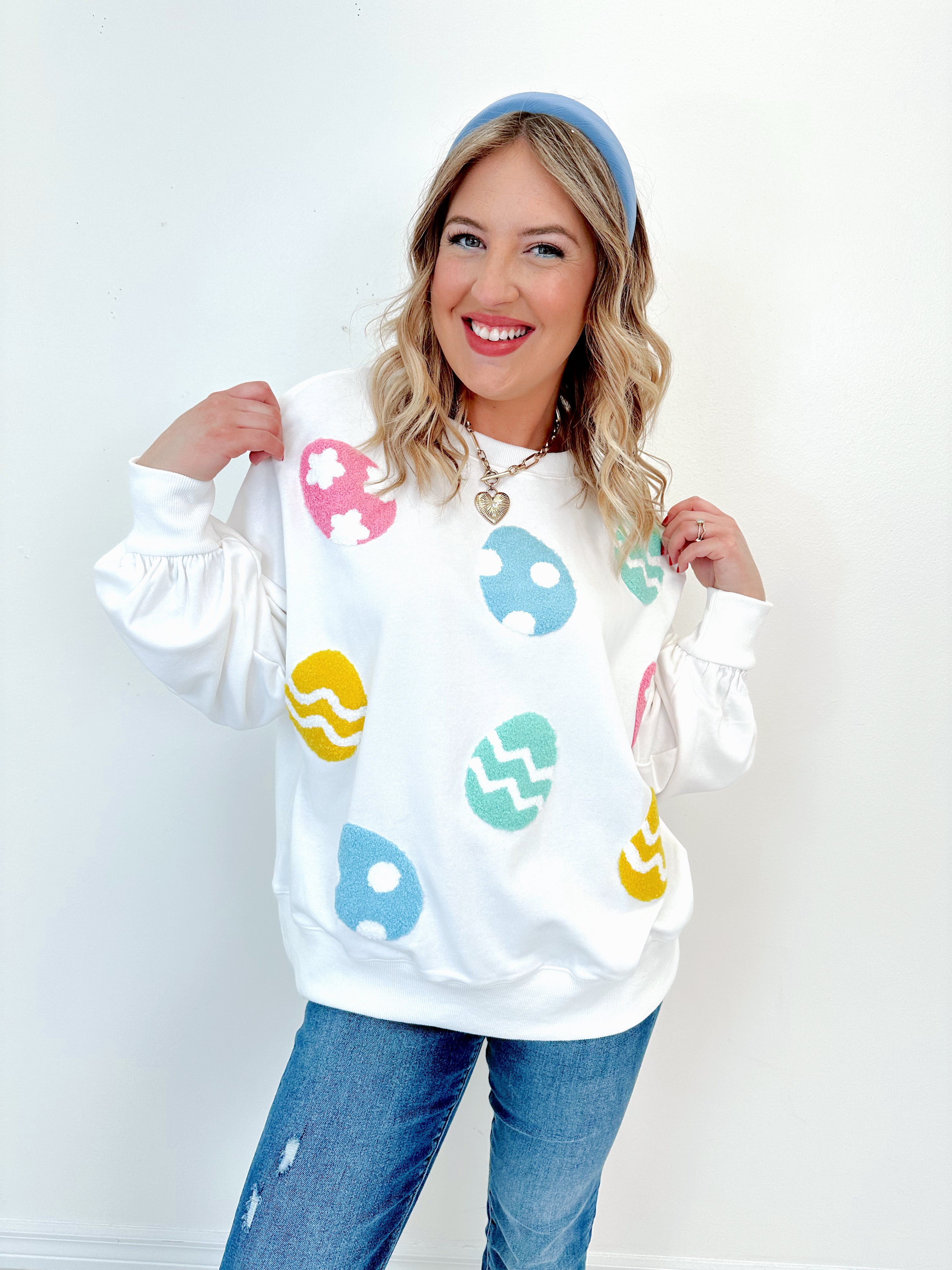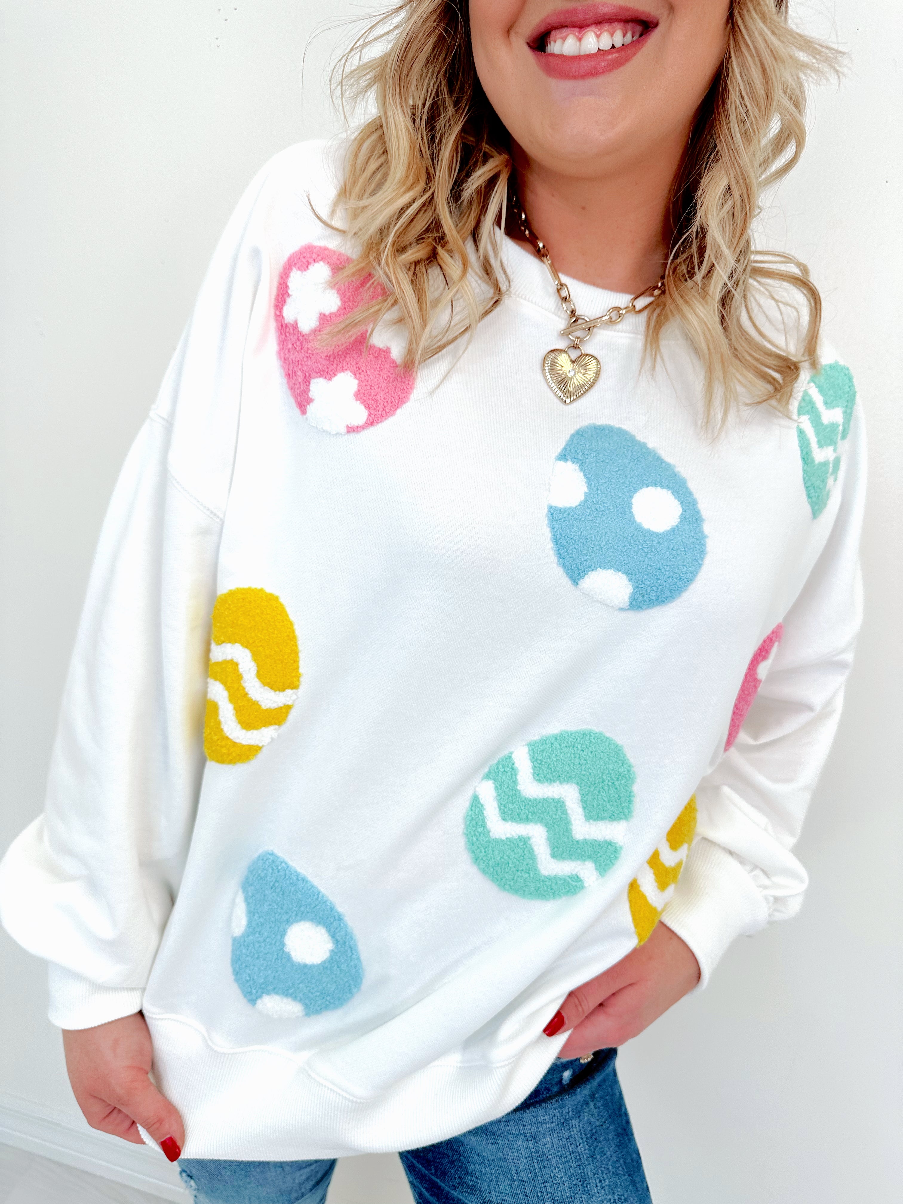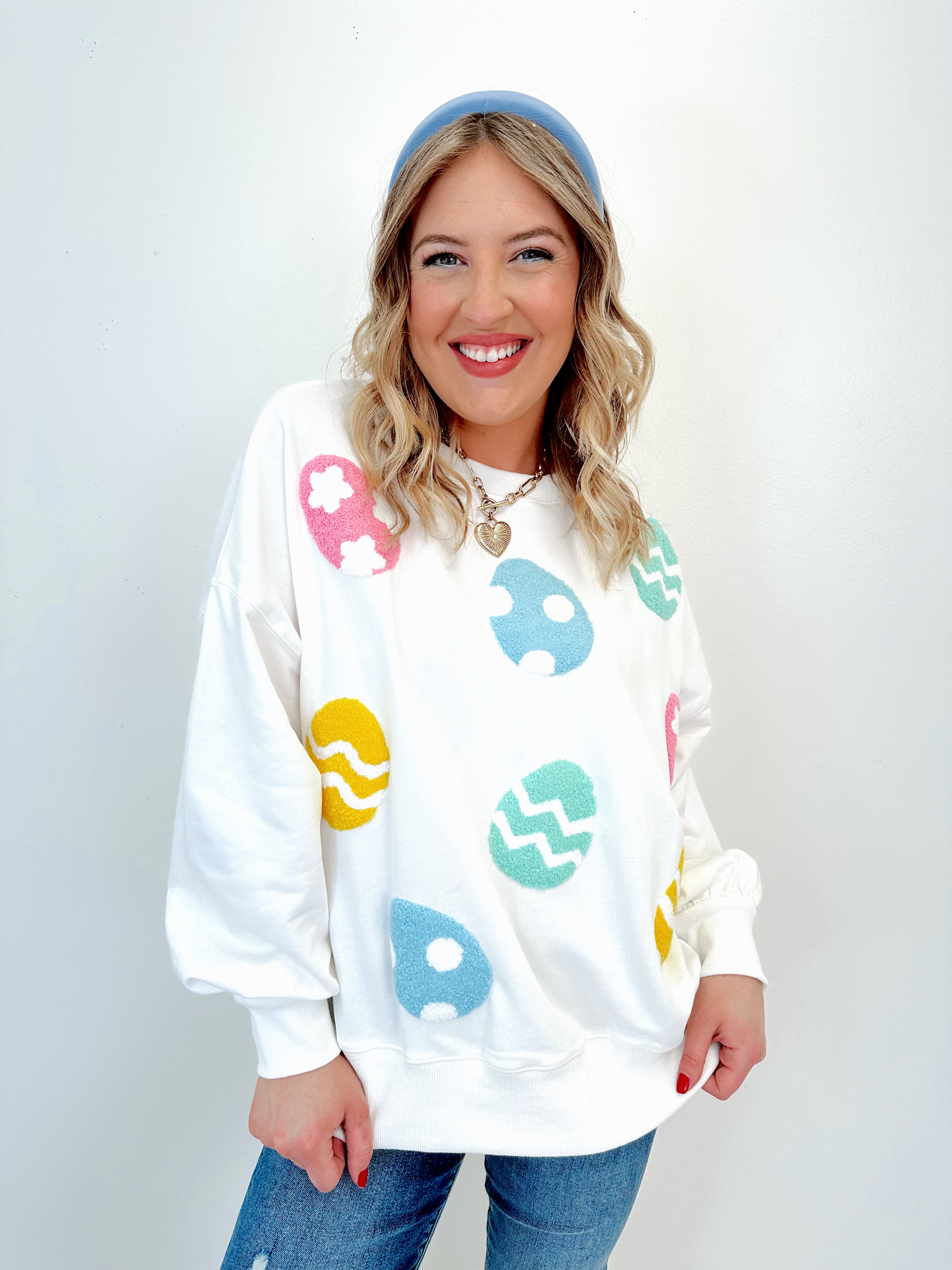 - Hop into the Easter spirit with this sweet and sassy sweatshirt! Our comfy Easter Egg Chenille Patch Sweatshirt is perfect for a family Easter egg hunt!