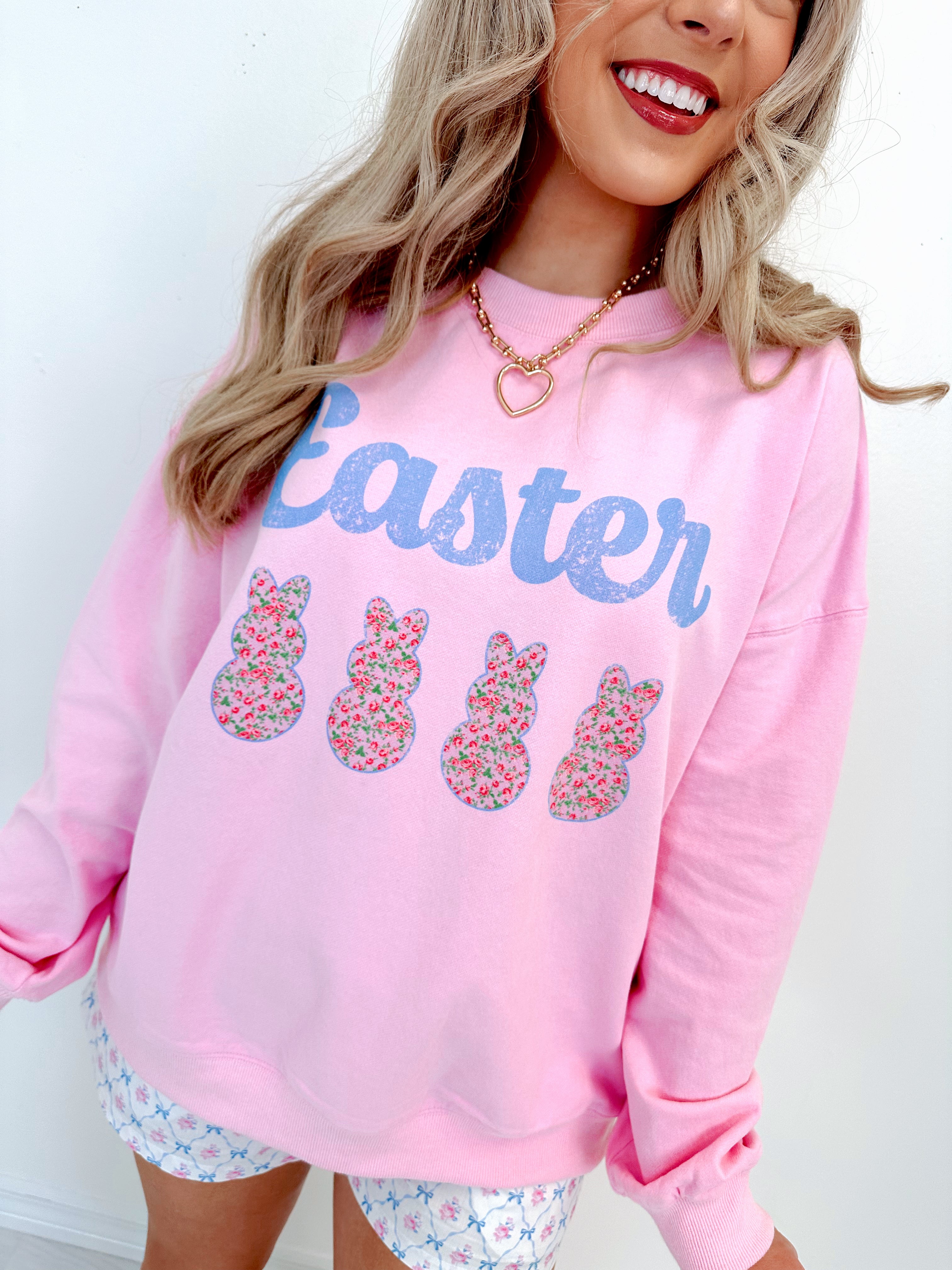 - Features a super soft fabric, crew neck, full length sleeves with ribbed cuff, a ribbed banded hem, and pastel floral peep like bunnies below a cursive graphic of Easter.