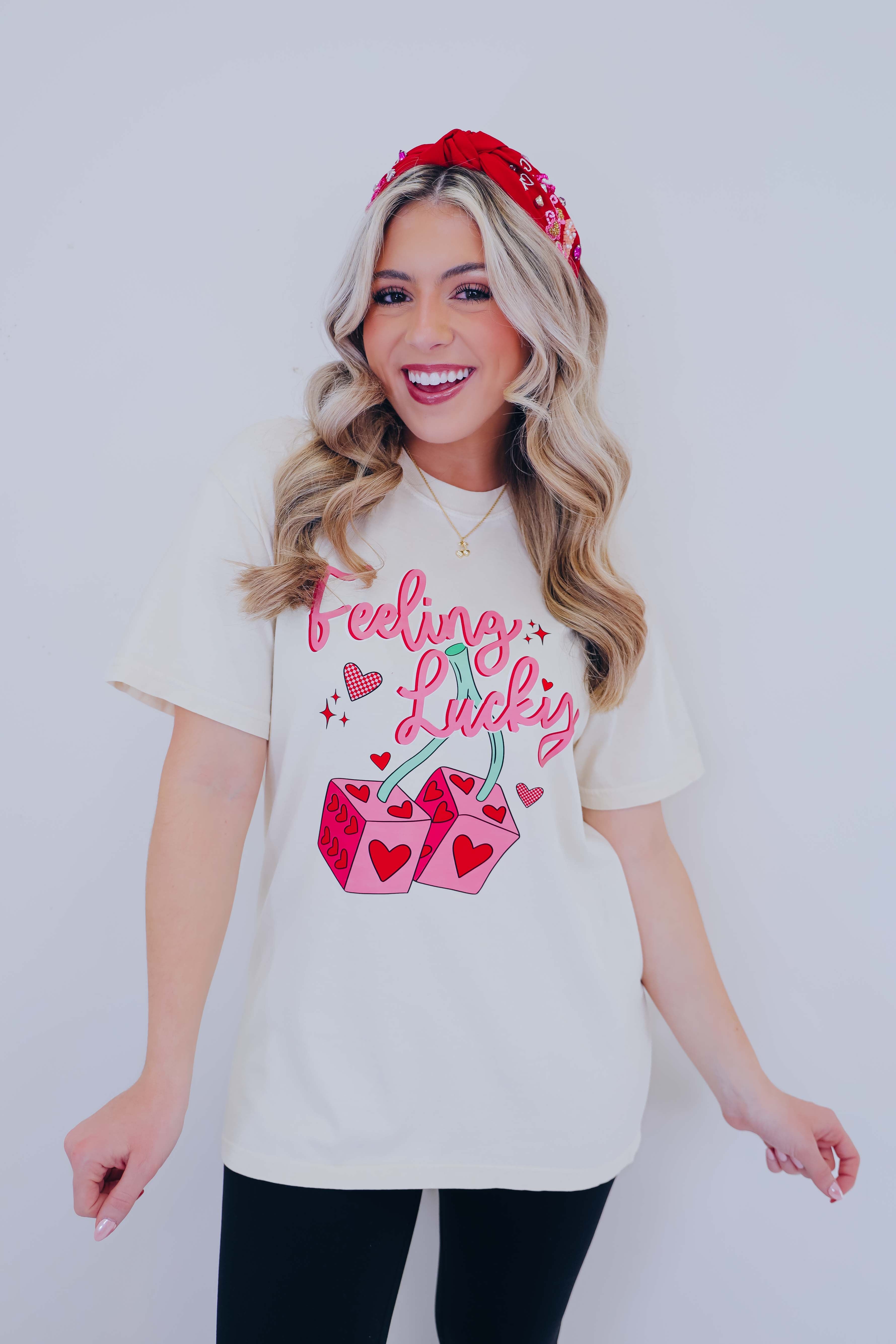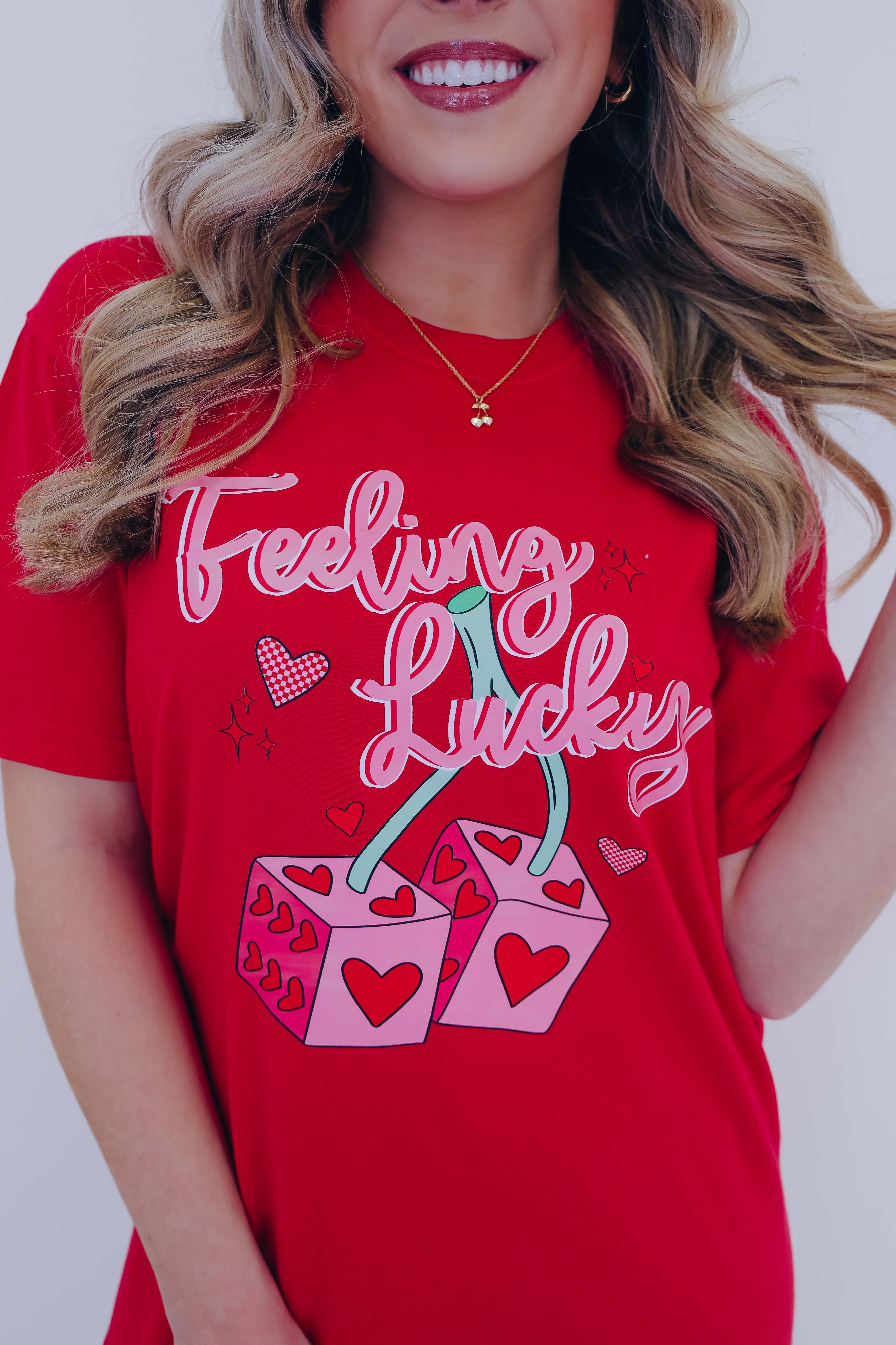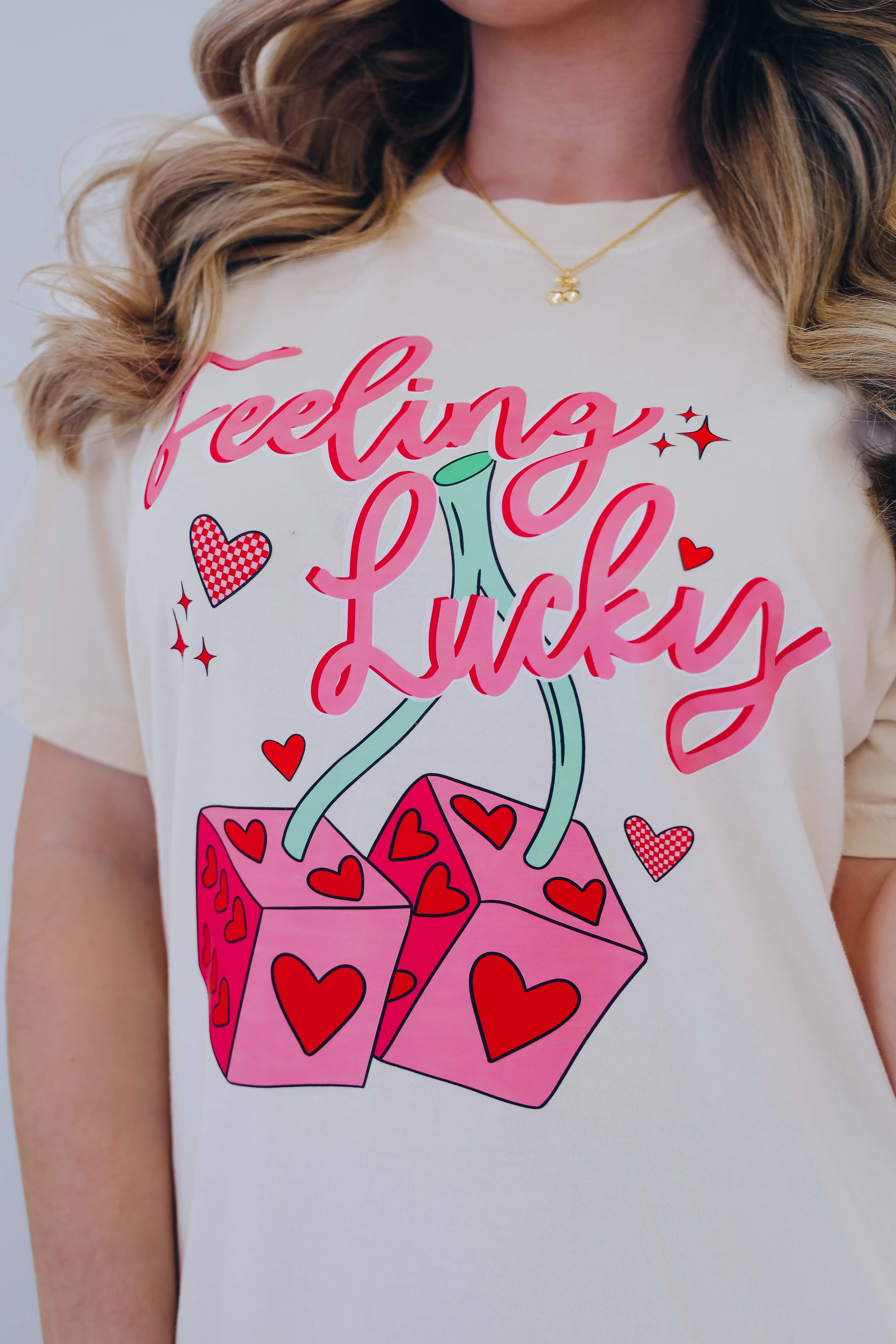 - Features a comfort color or gildan cotton tee, crew neck, short sleeves, graphics include "Feeling Lucky" in an outlined cursive font above a pair of square heart adorned dice hanging from a cherry stem amongst stars and hearts.