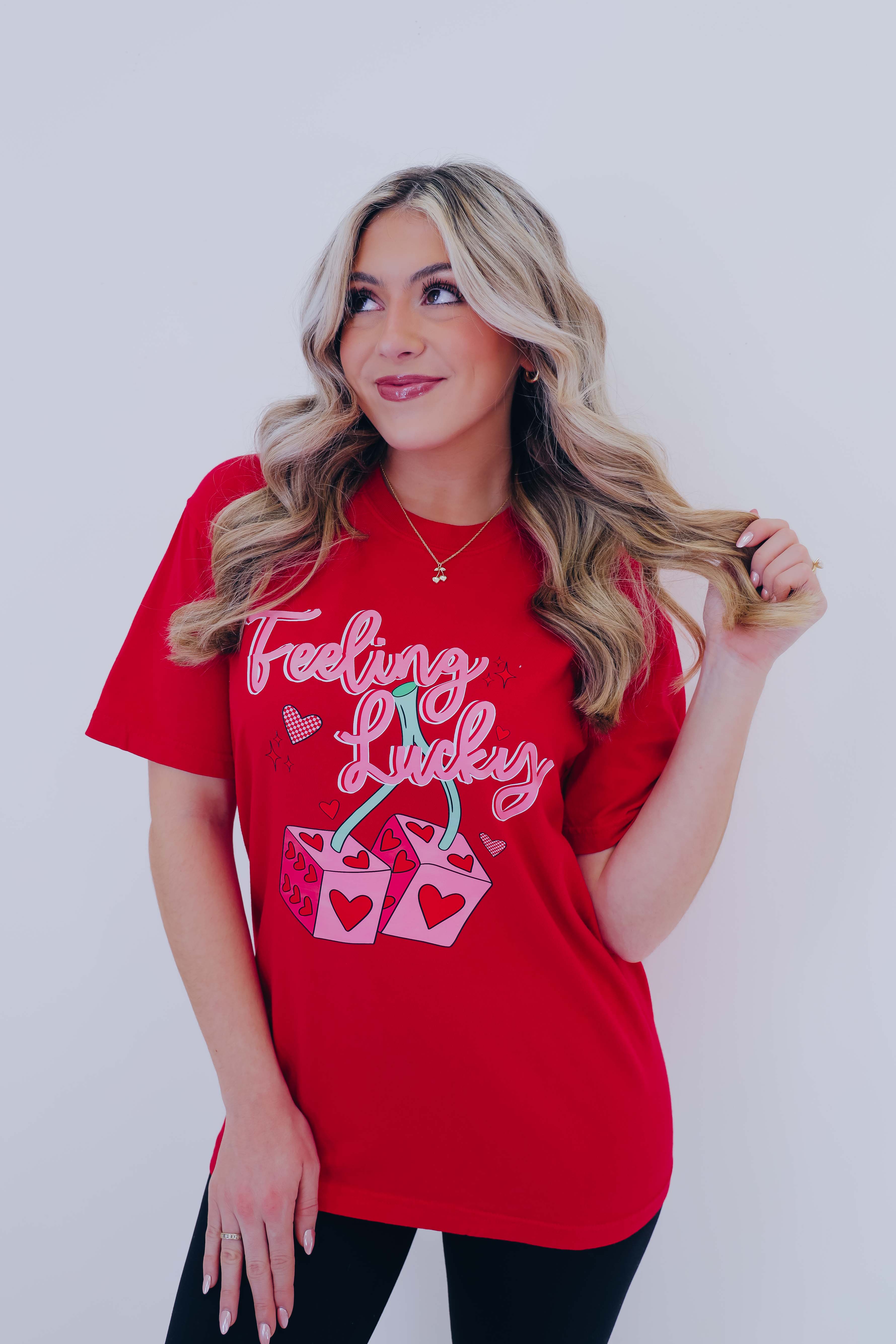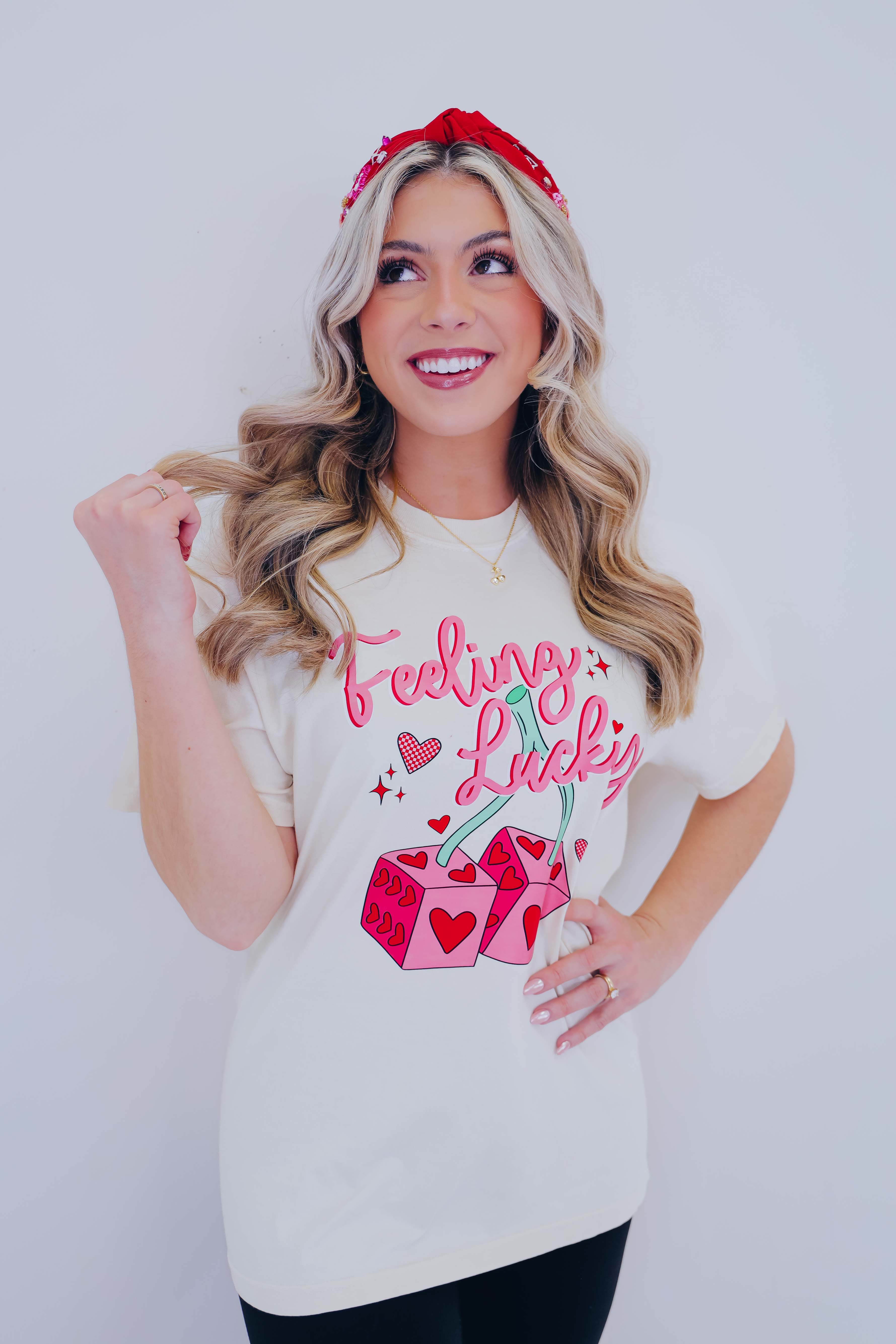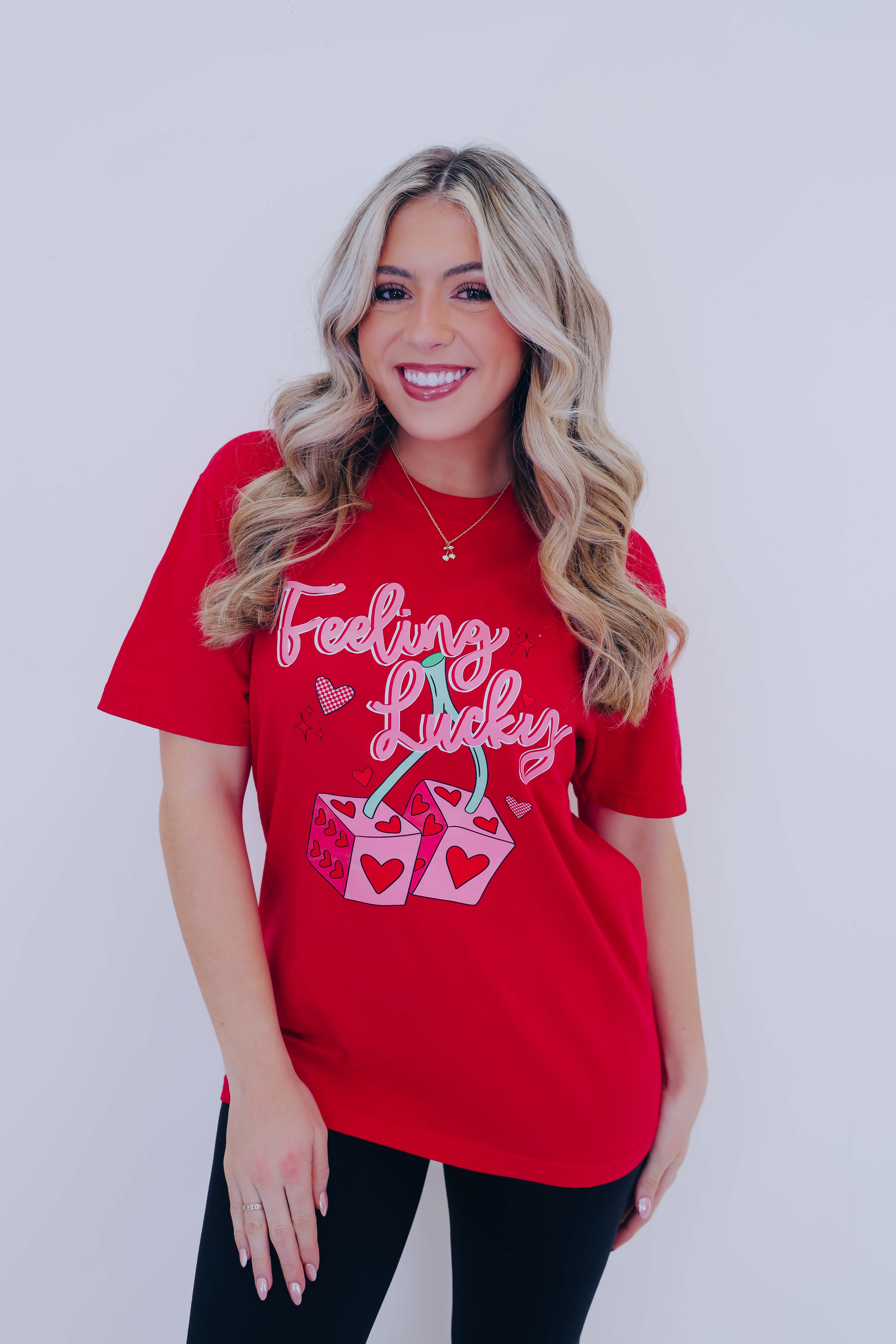 - Features a comfort color or gildan cotton tee, crew neck, short sleeves, graphics include "Feeling Lucky" in an outlined cursive font above a pair of square heart adorned dice hanging from a cherry stem amongst stars and hearts.