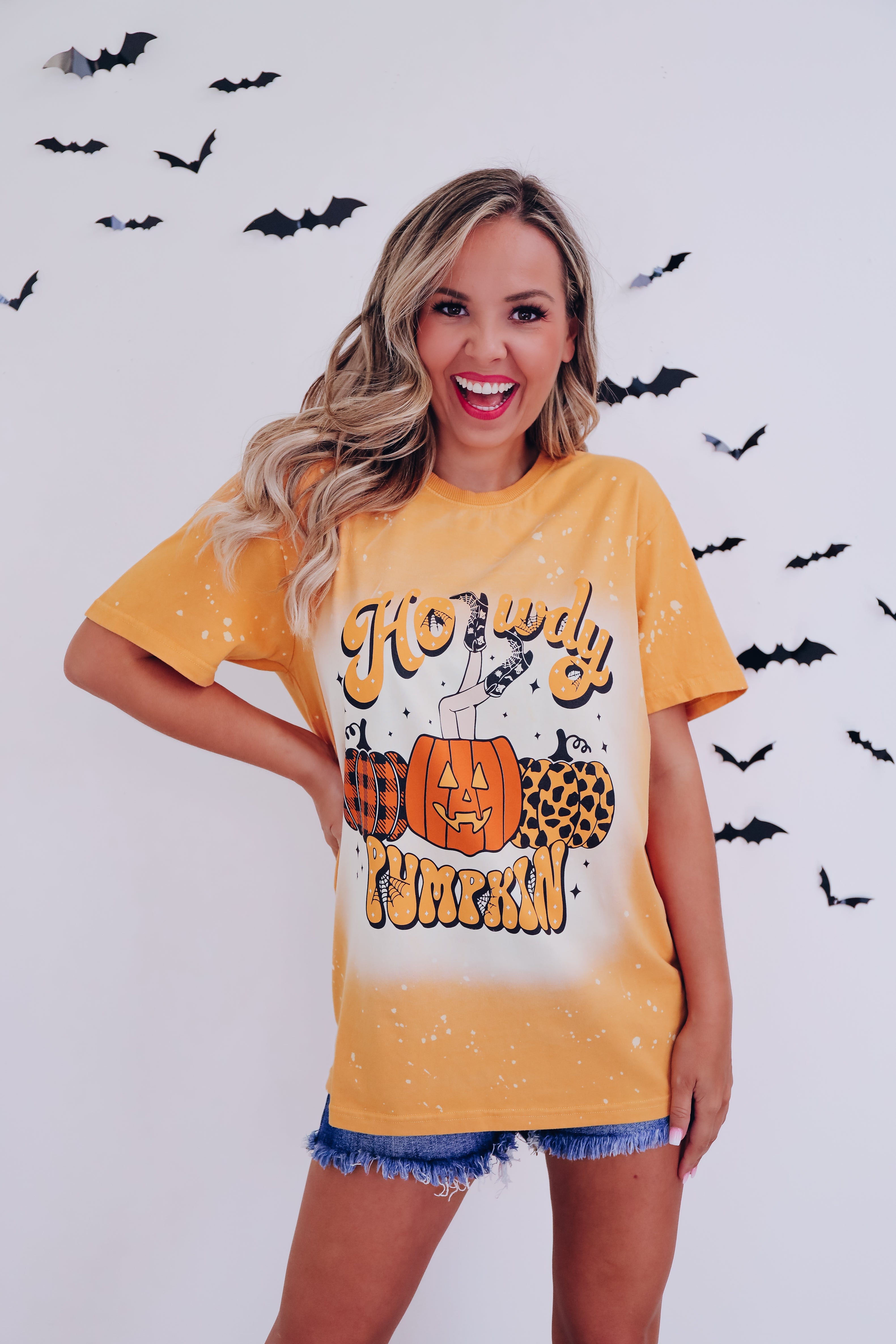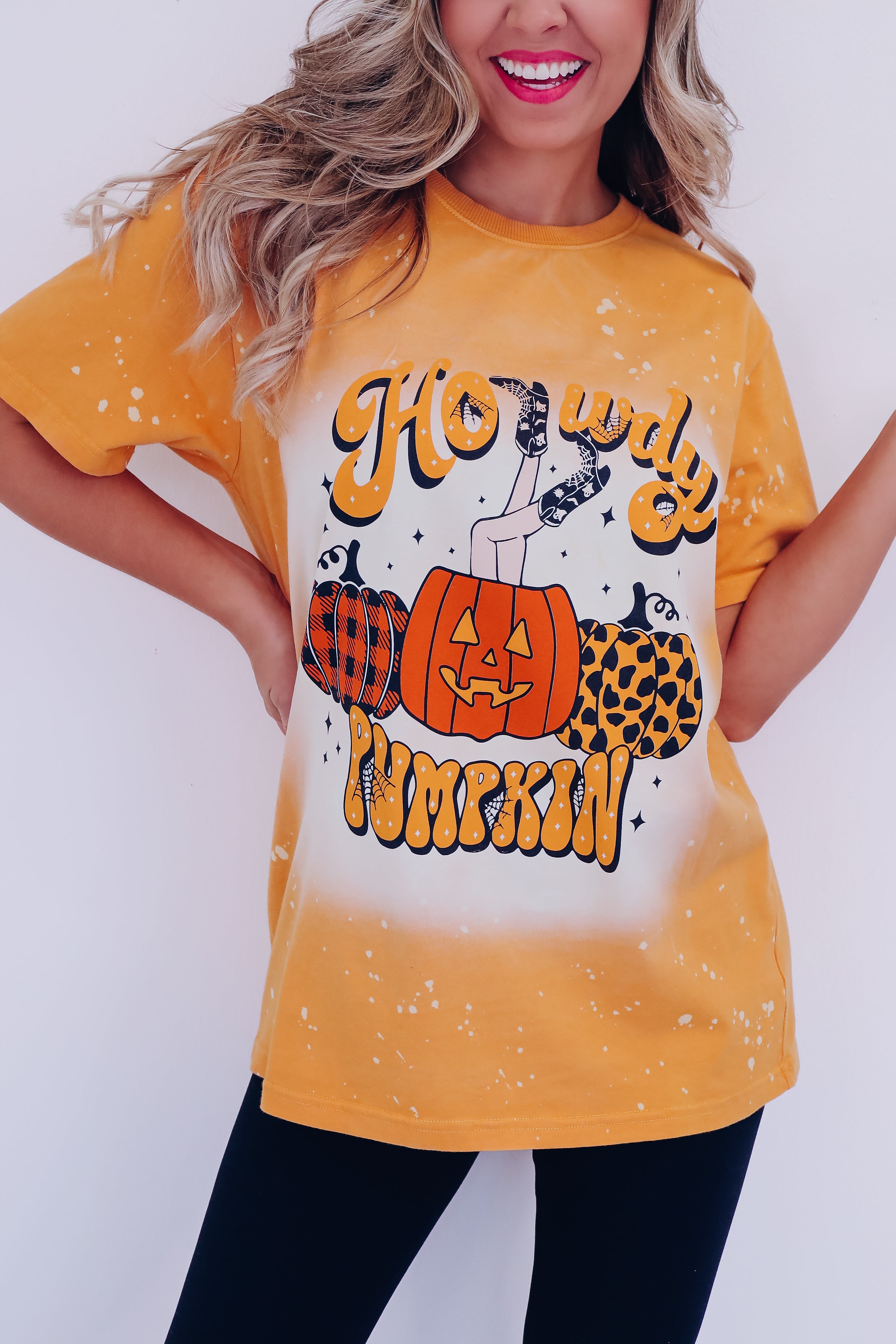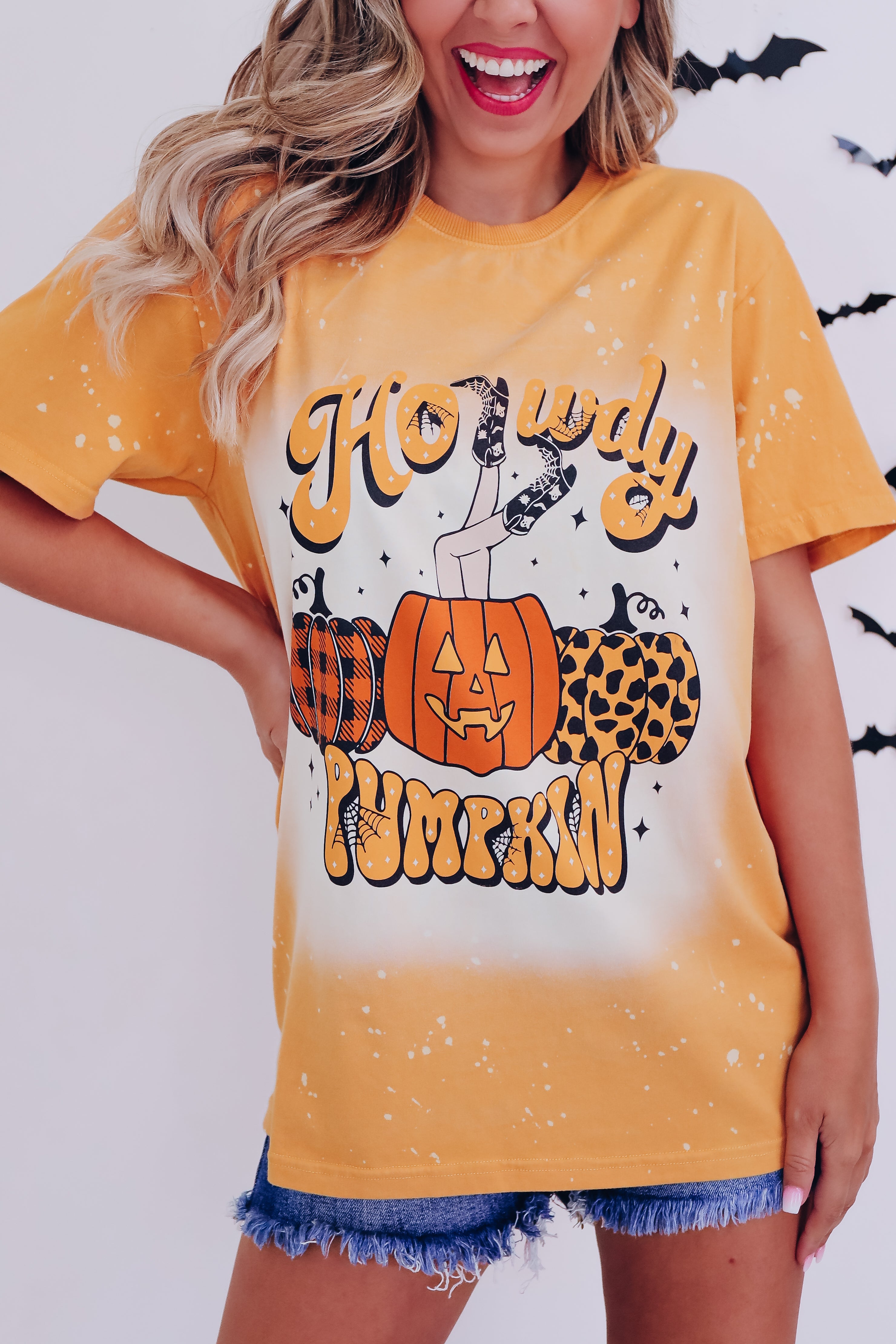 - Features a bleach washed mustard cotton base, a crew neck, short sleeves, with black, orange, and mustard graphics of 3 trendy printed pumpkins, the center one is topped with kicking cowgirl boots, and a spooky vibe font saying "Howdy Pumpkin"