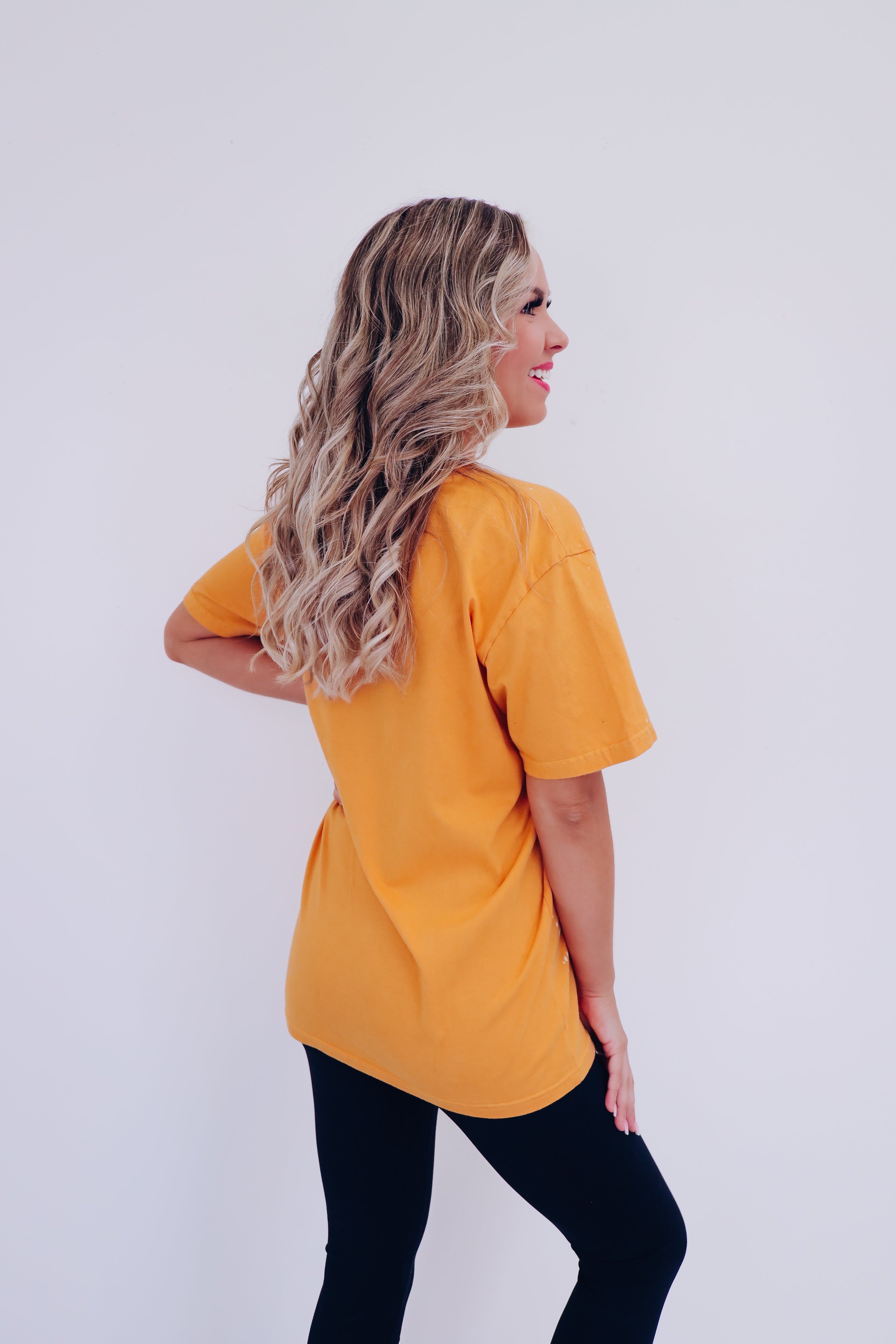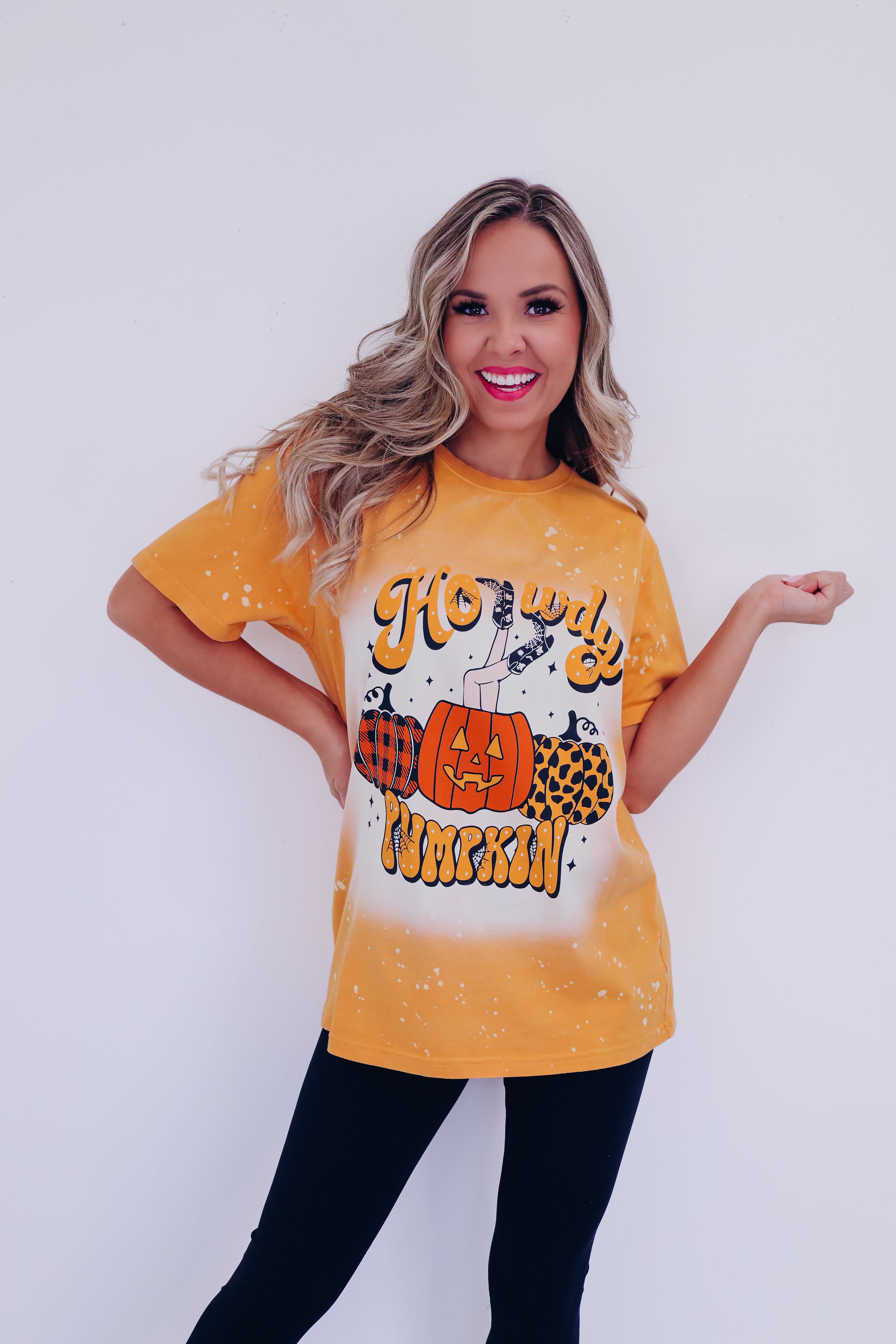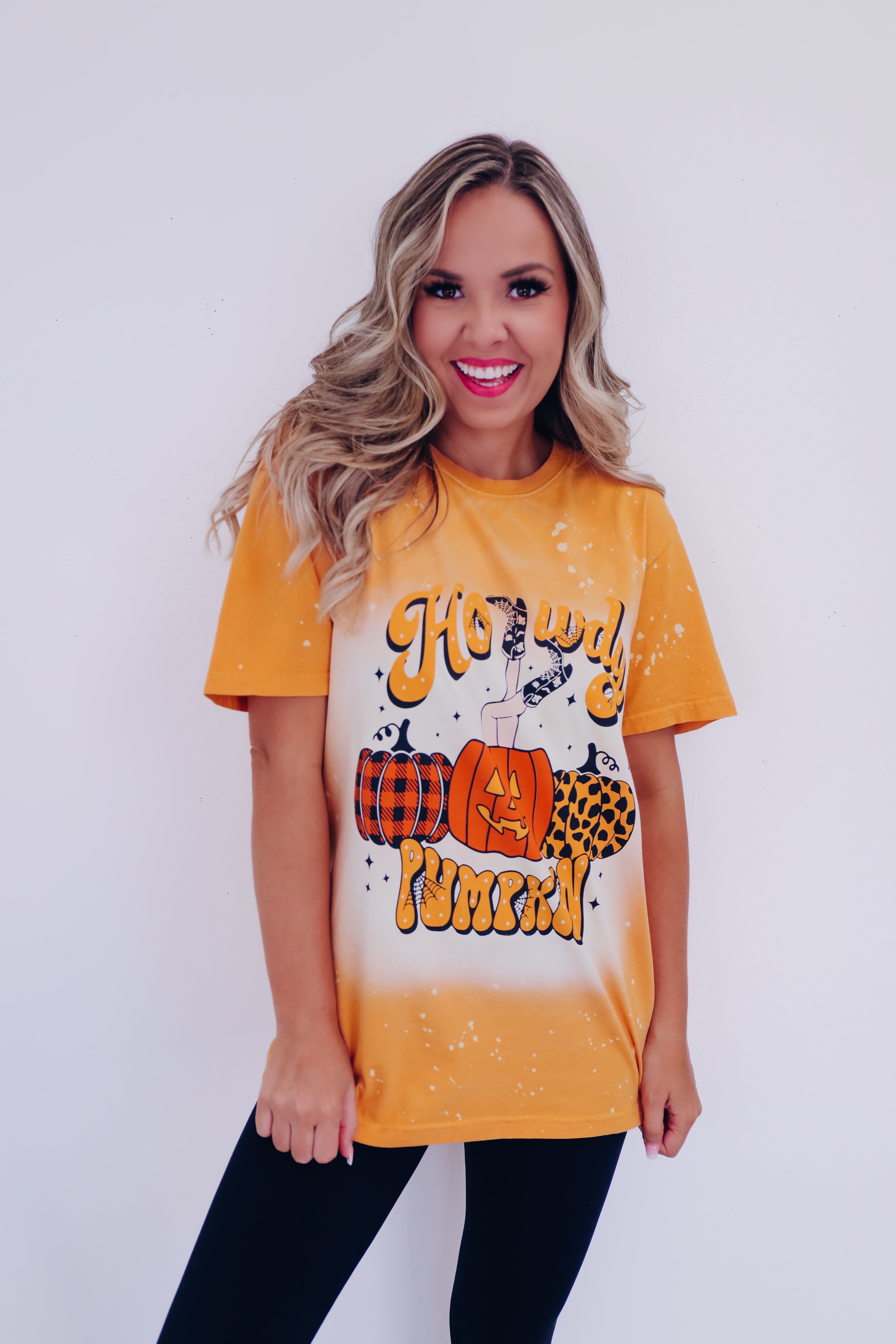 - Features a bleach washed mustard cotton base, a crew neck, short sleeves, with black, orange, and mustard graphics of 3 trendy printed pumpkins, the center one is topped with kicking cowgirl boots, and a spooky vibe font saying "Howdy Pumpkin"