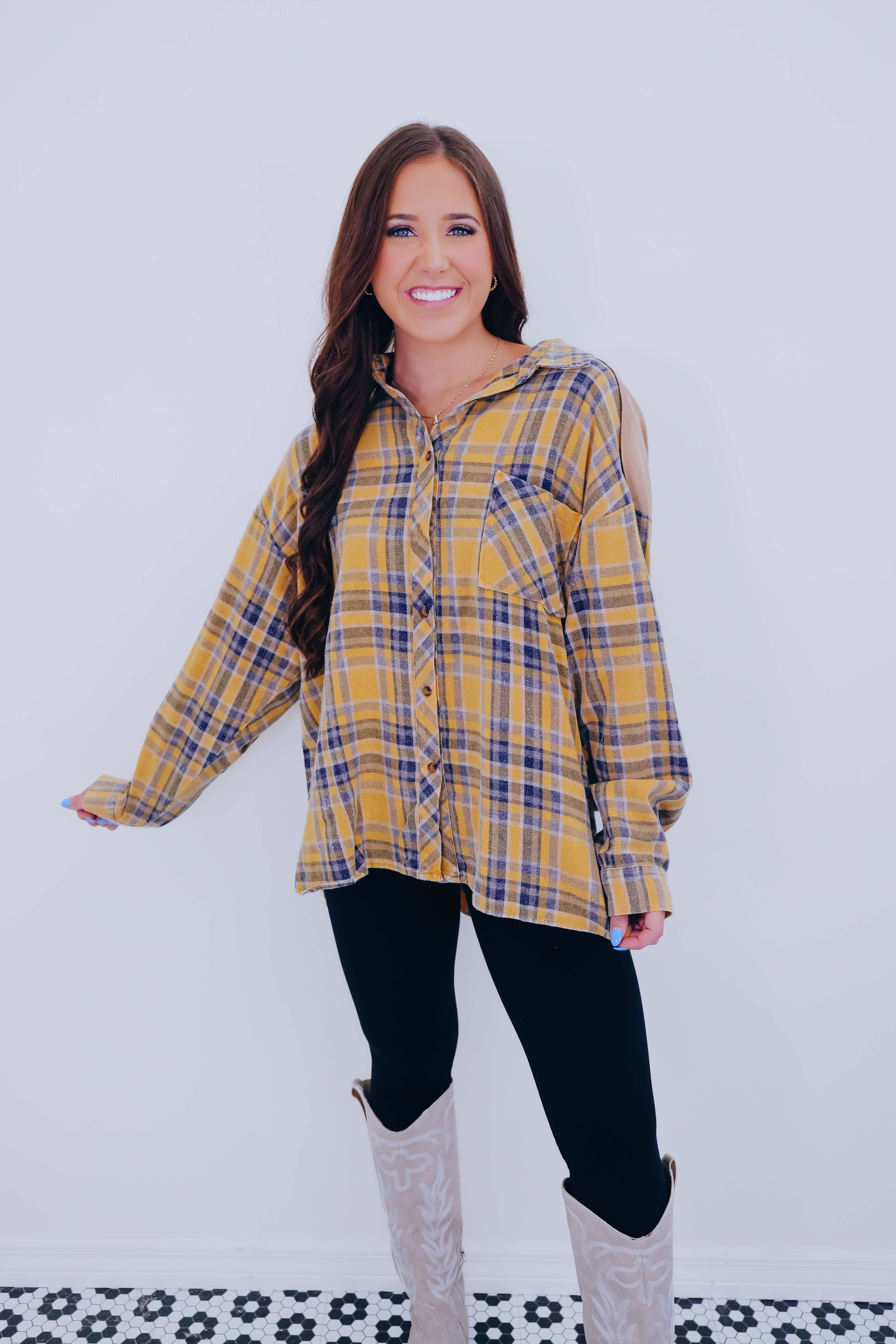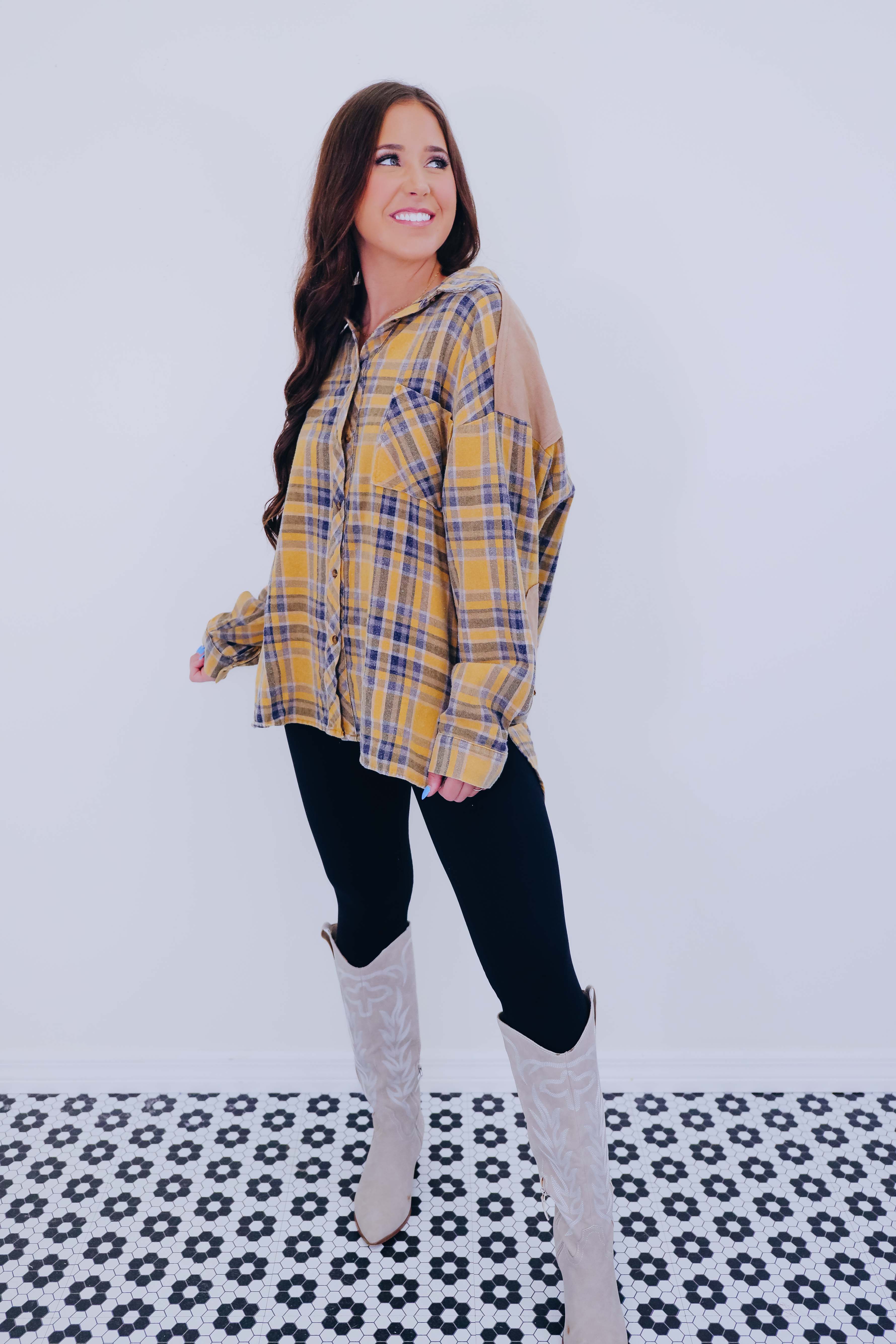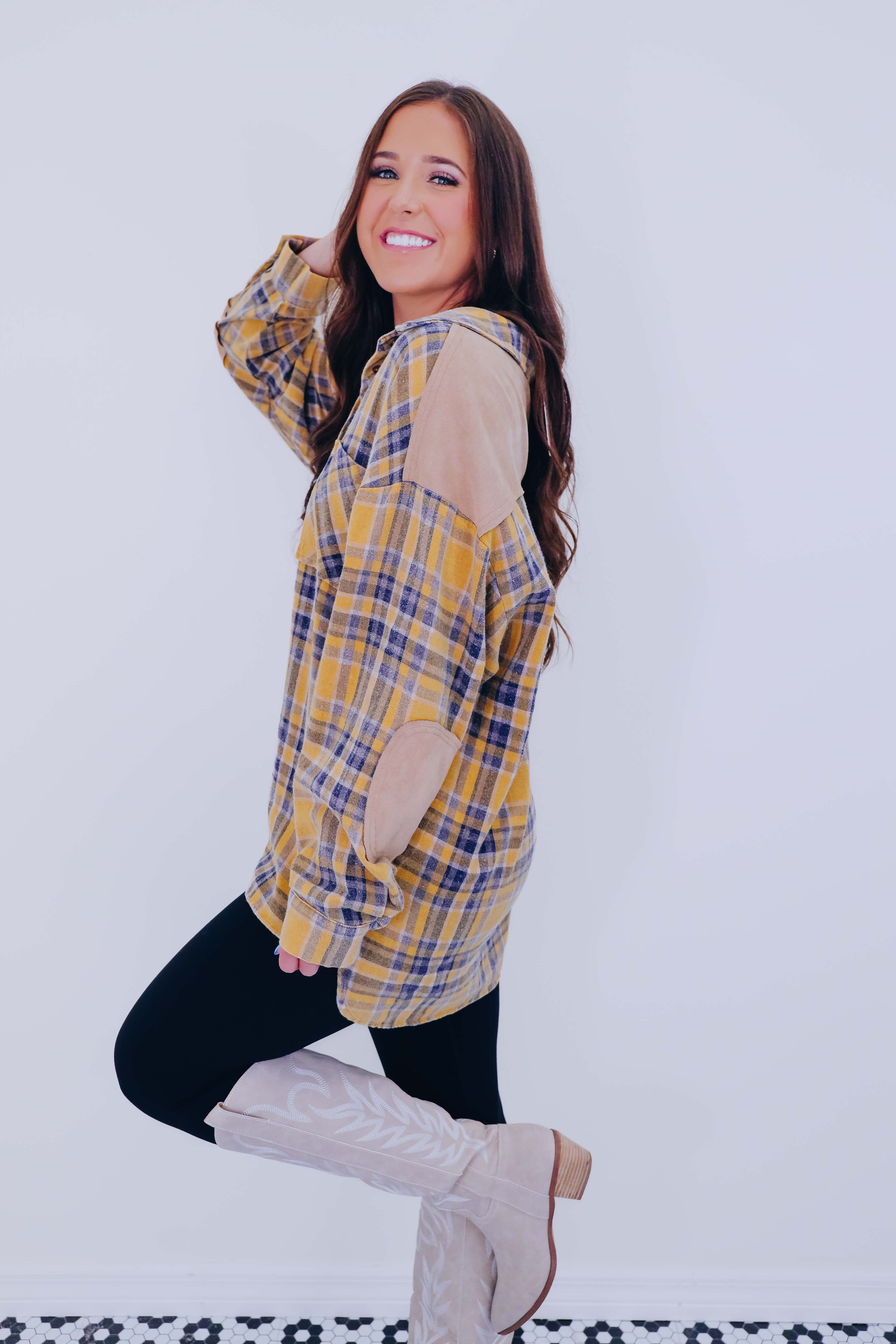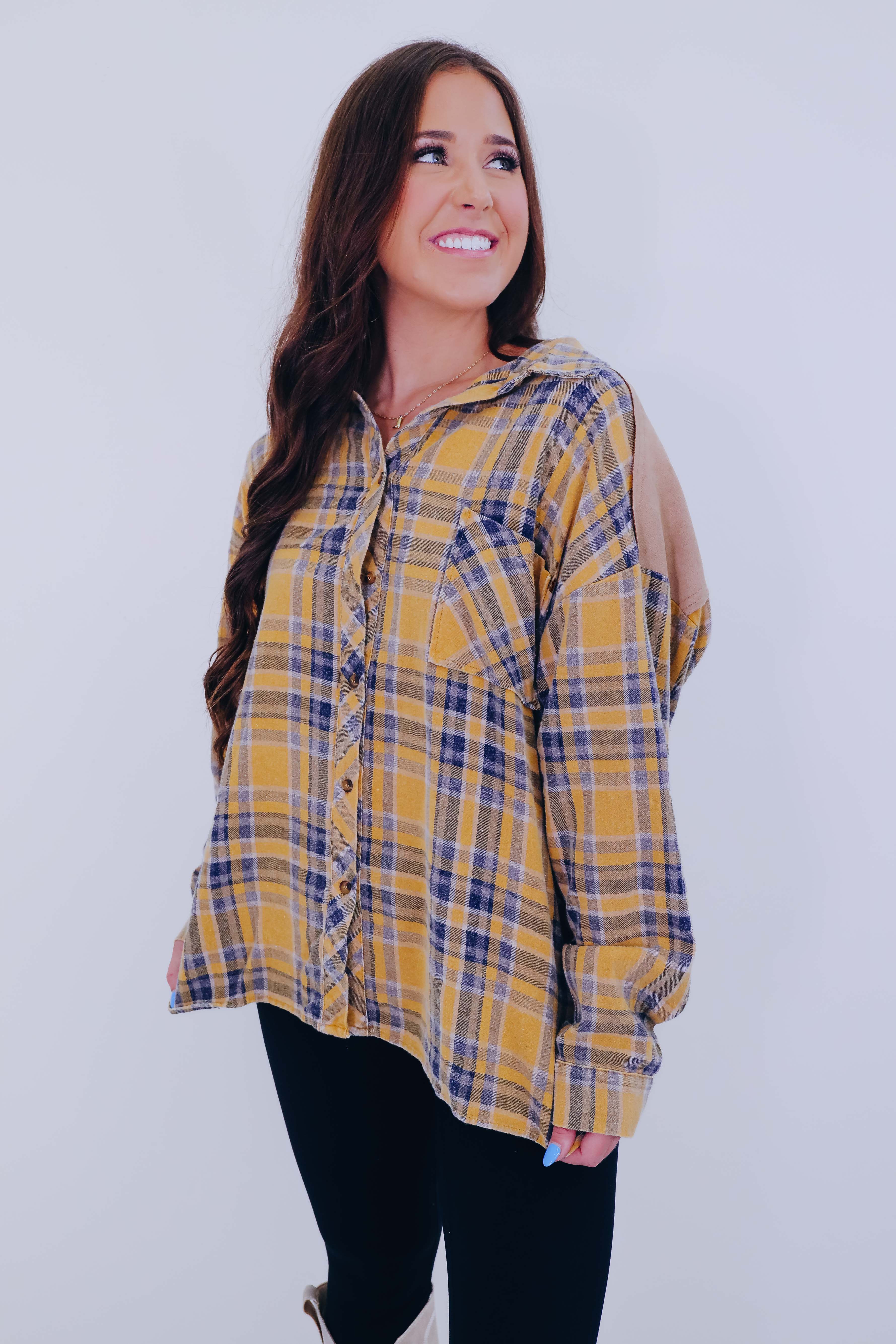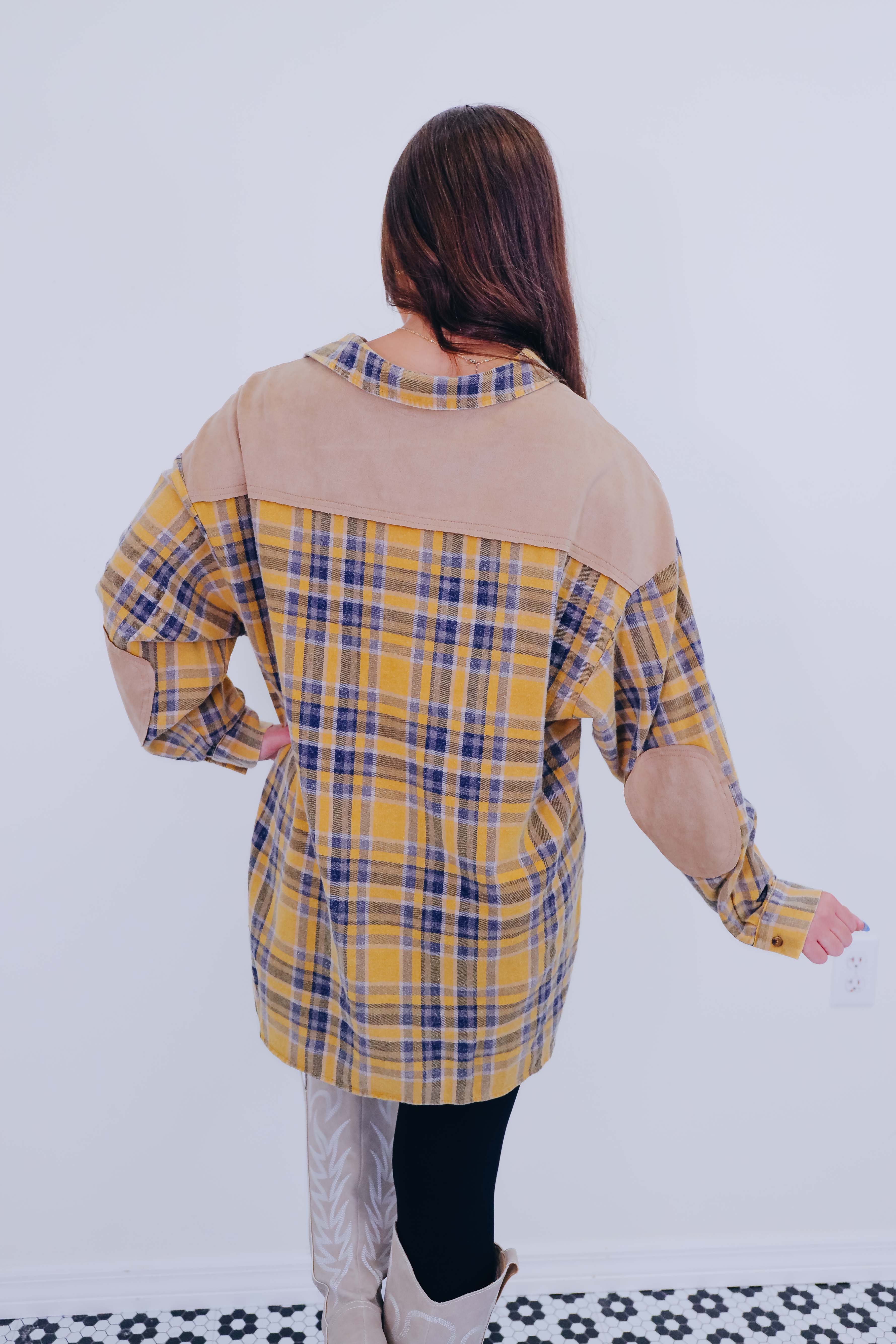 • Features a super soft poly cotton blend, button front, drop shoulder, full length sleeves with a button cuff, faux suede elbow patches and yoke, front pocket, and a high-low slit hem.