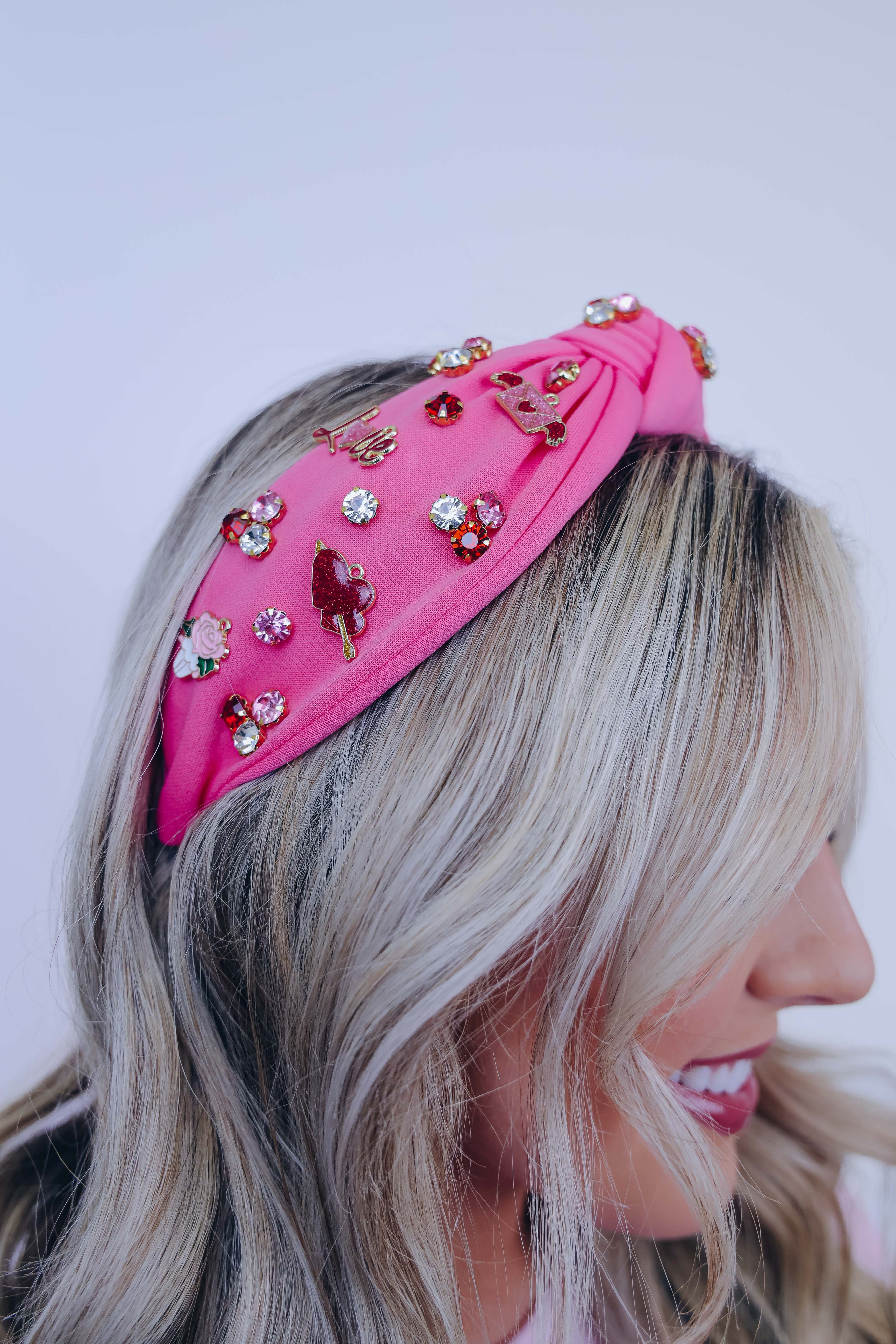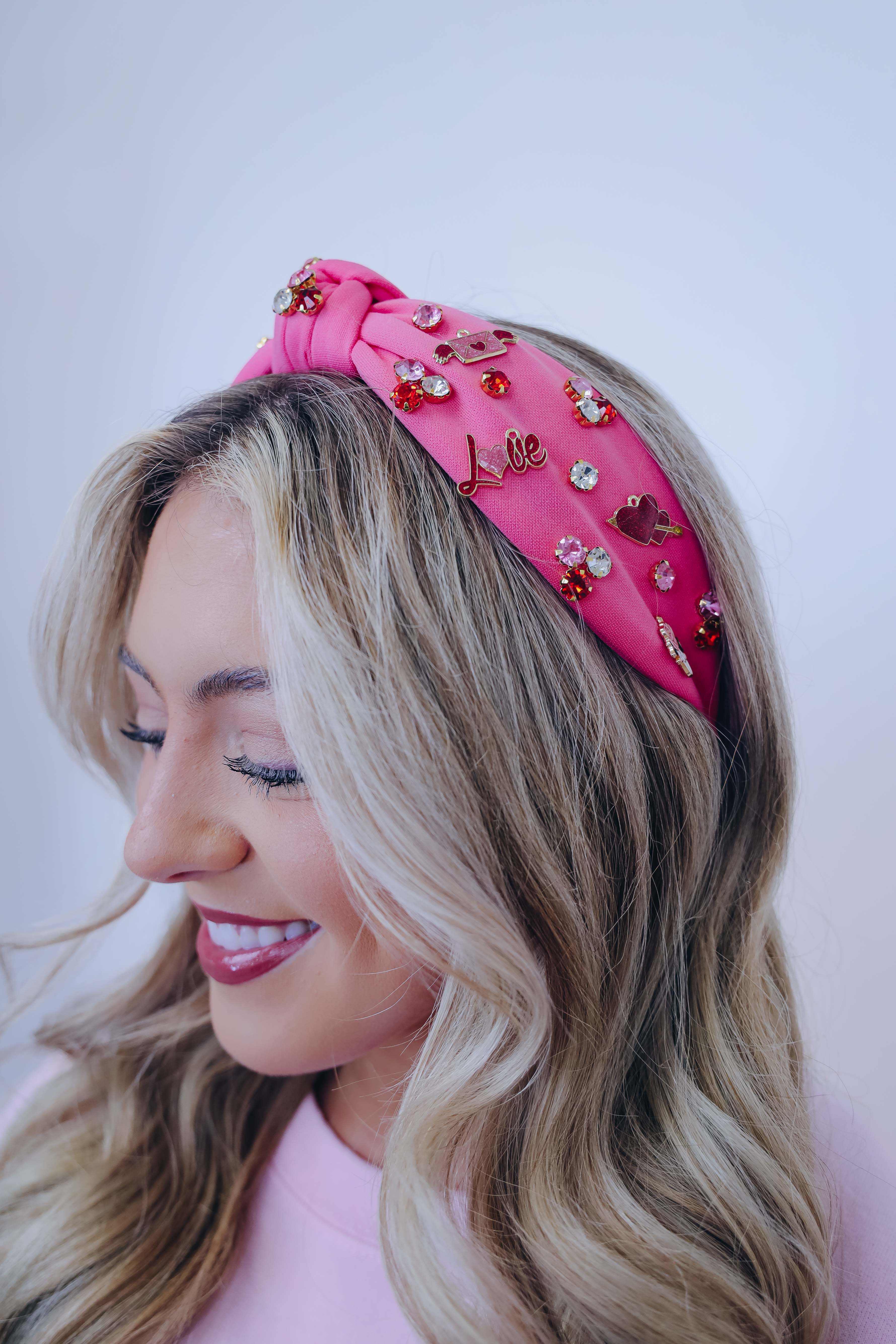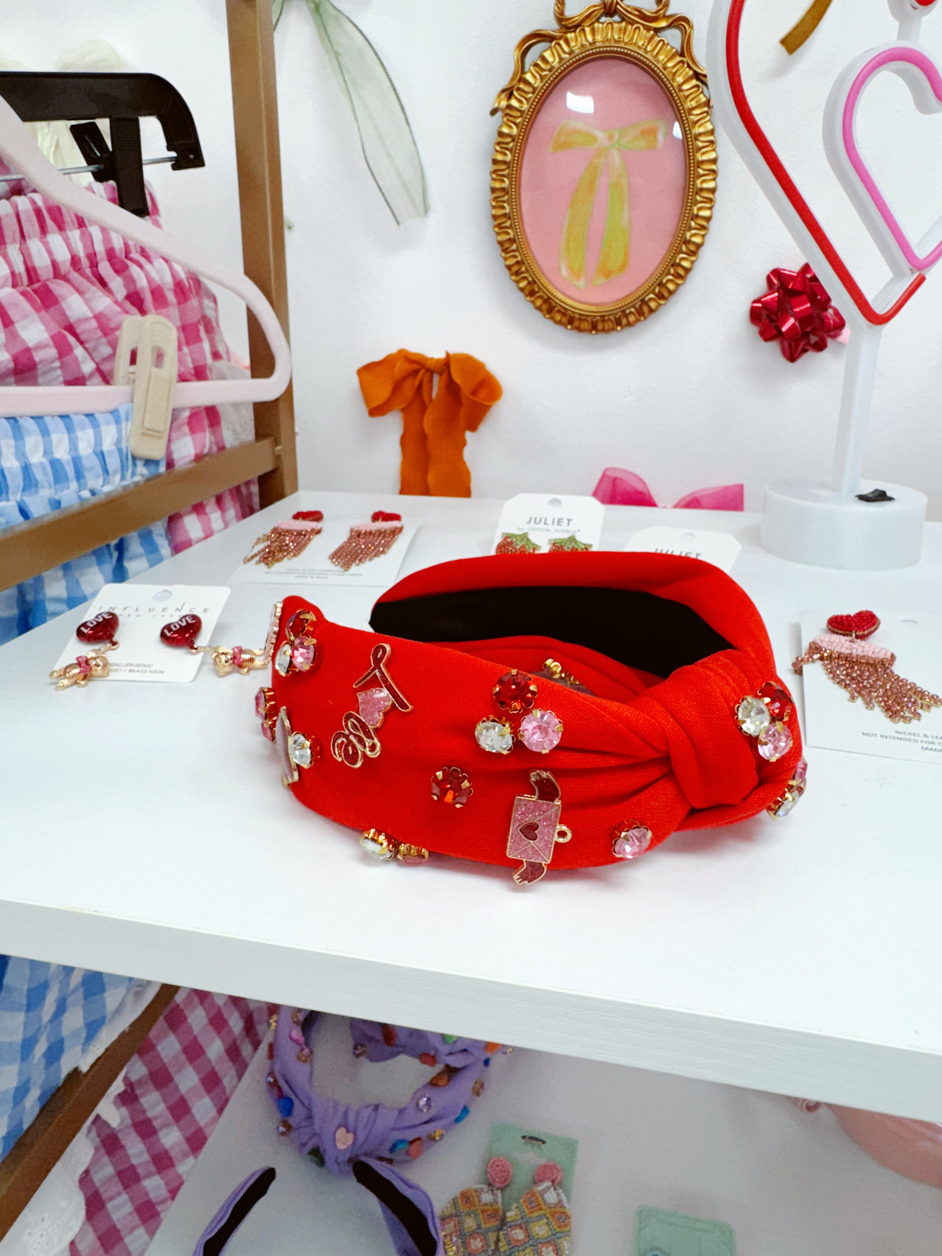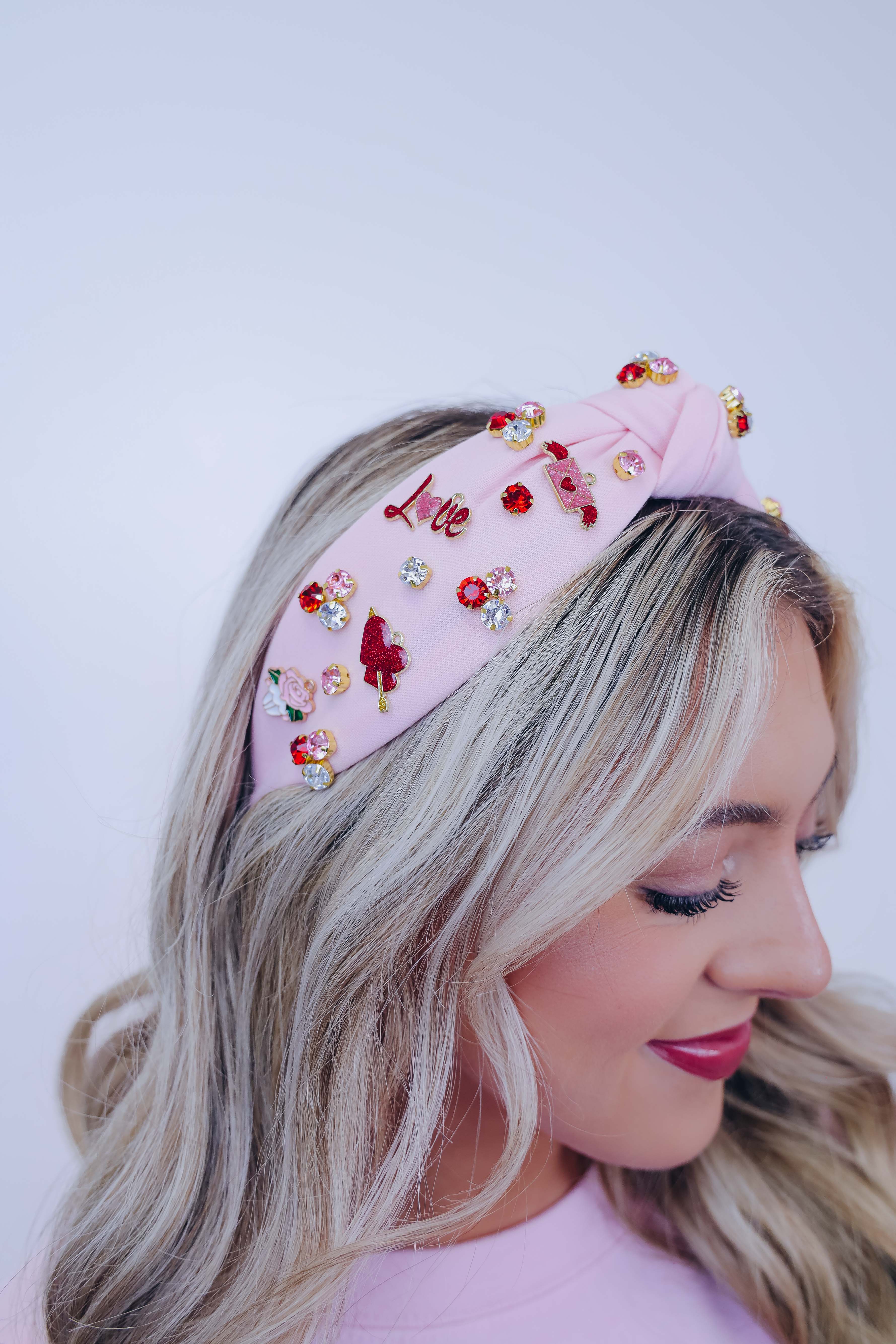 - Featuring a knotted headband adorned with colorful stones and charms including hearts with a arrow through it, roses, "love", and a love letter.