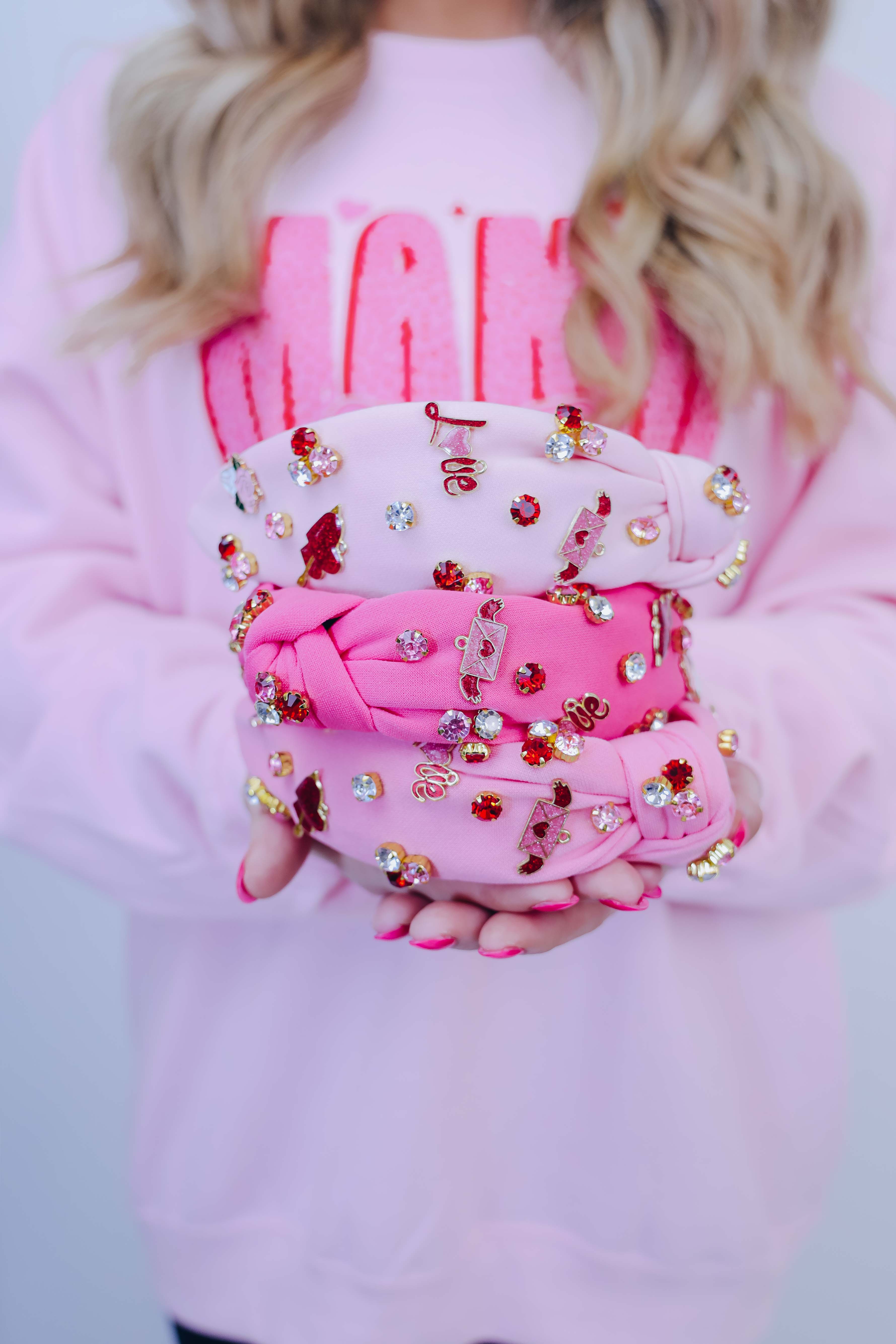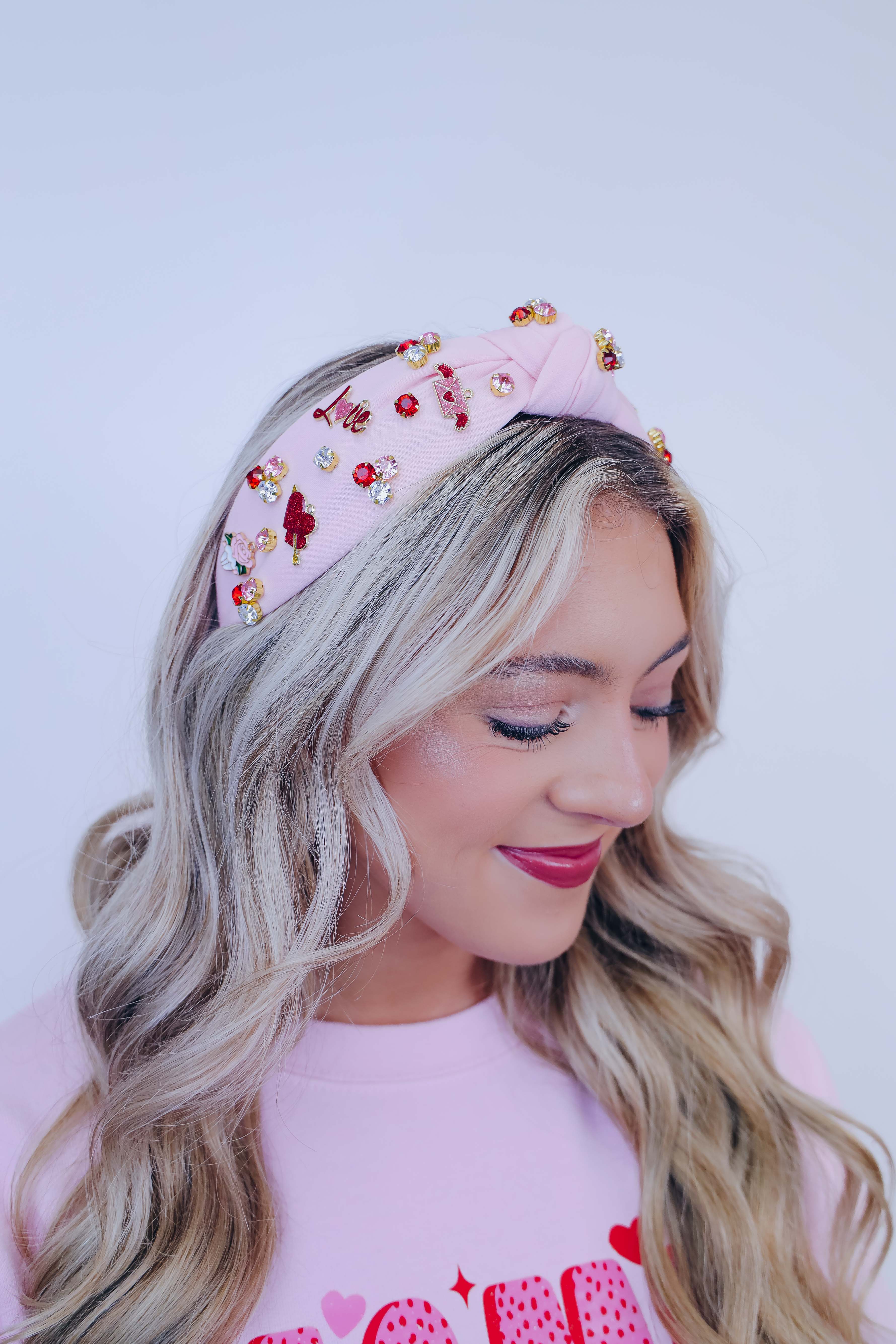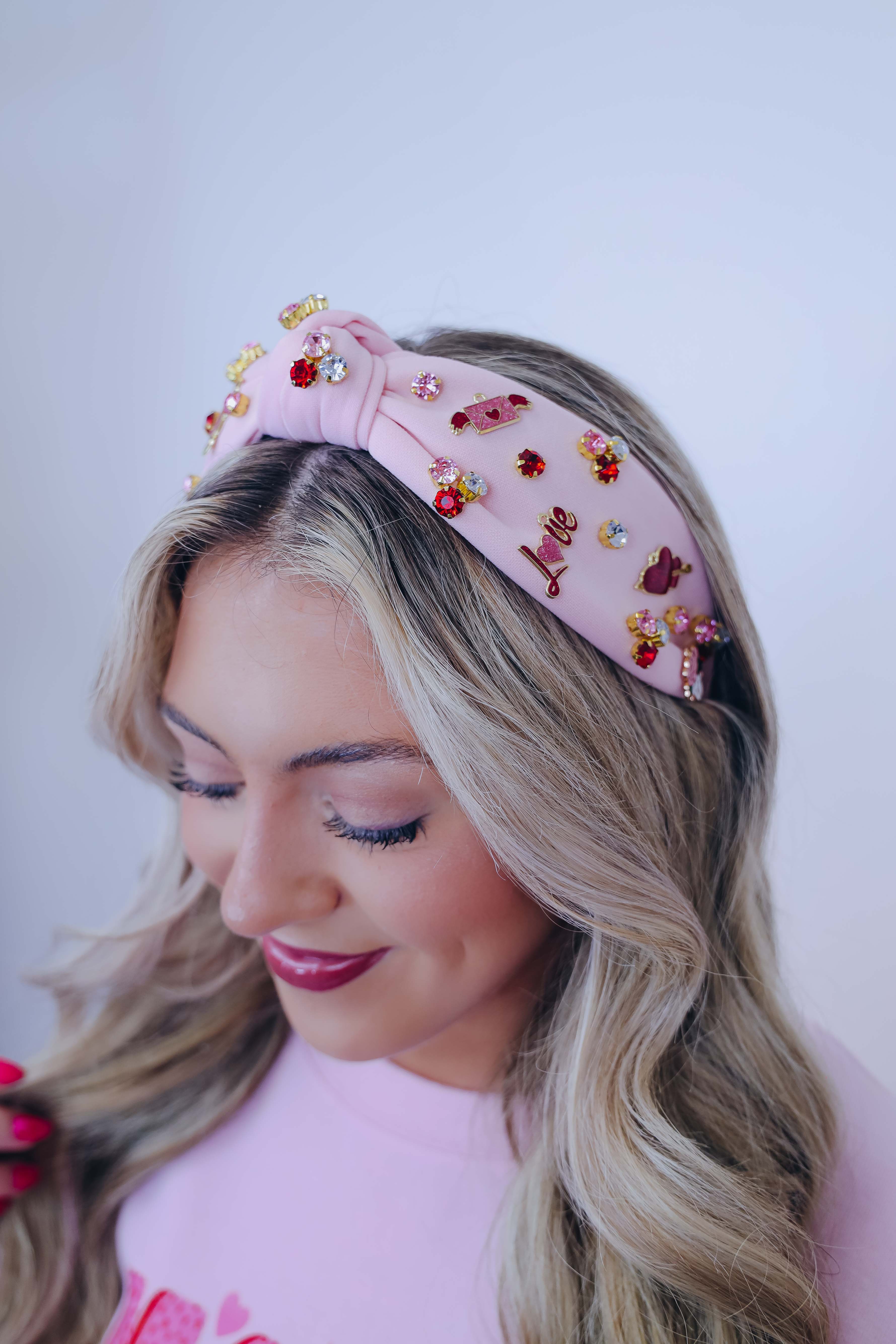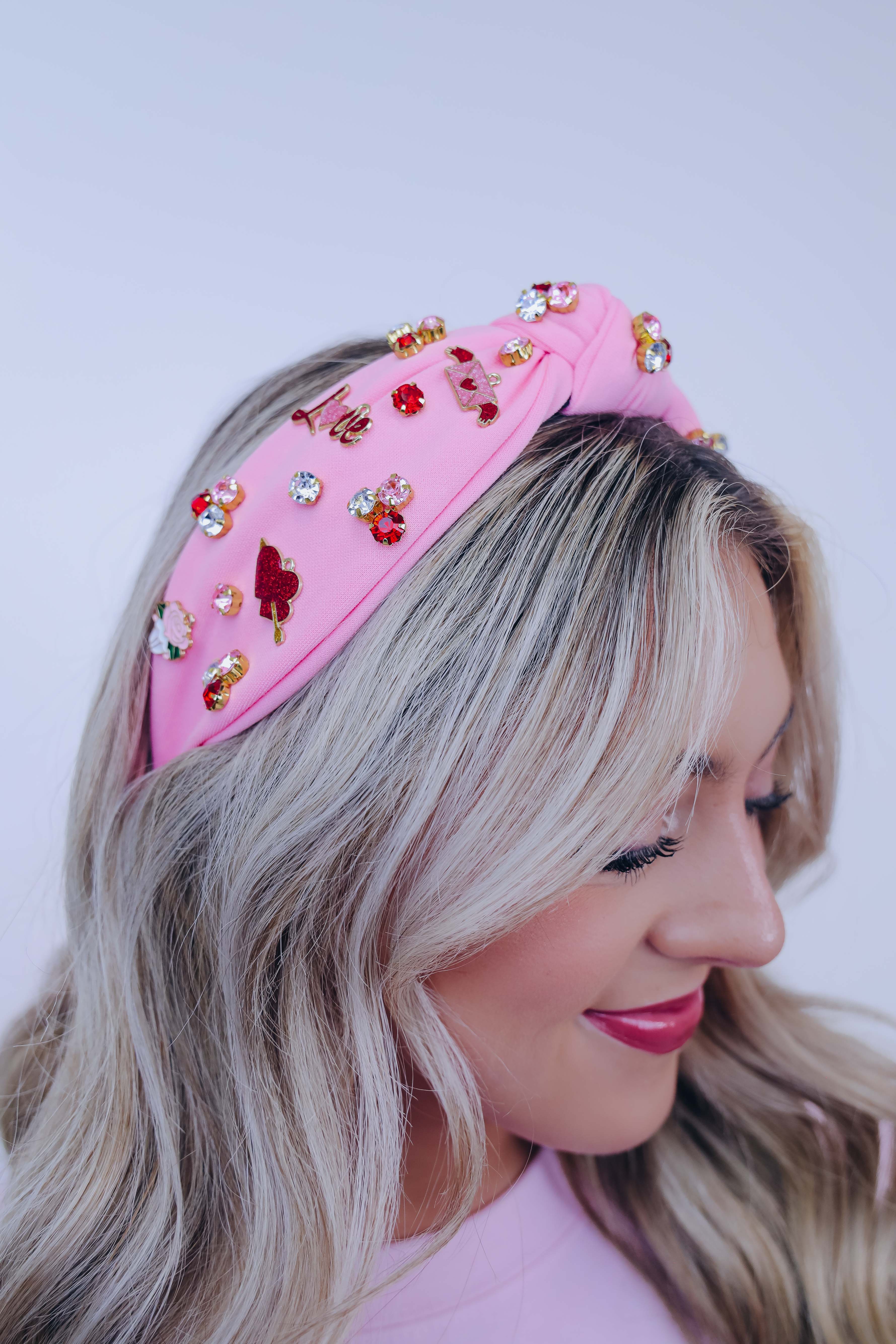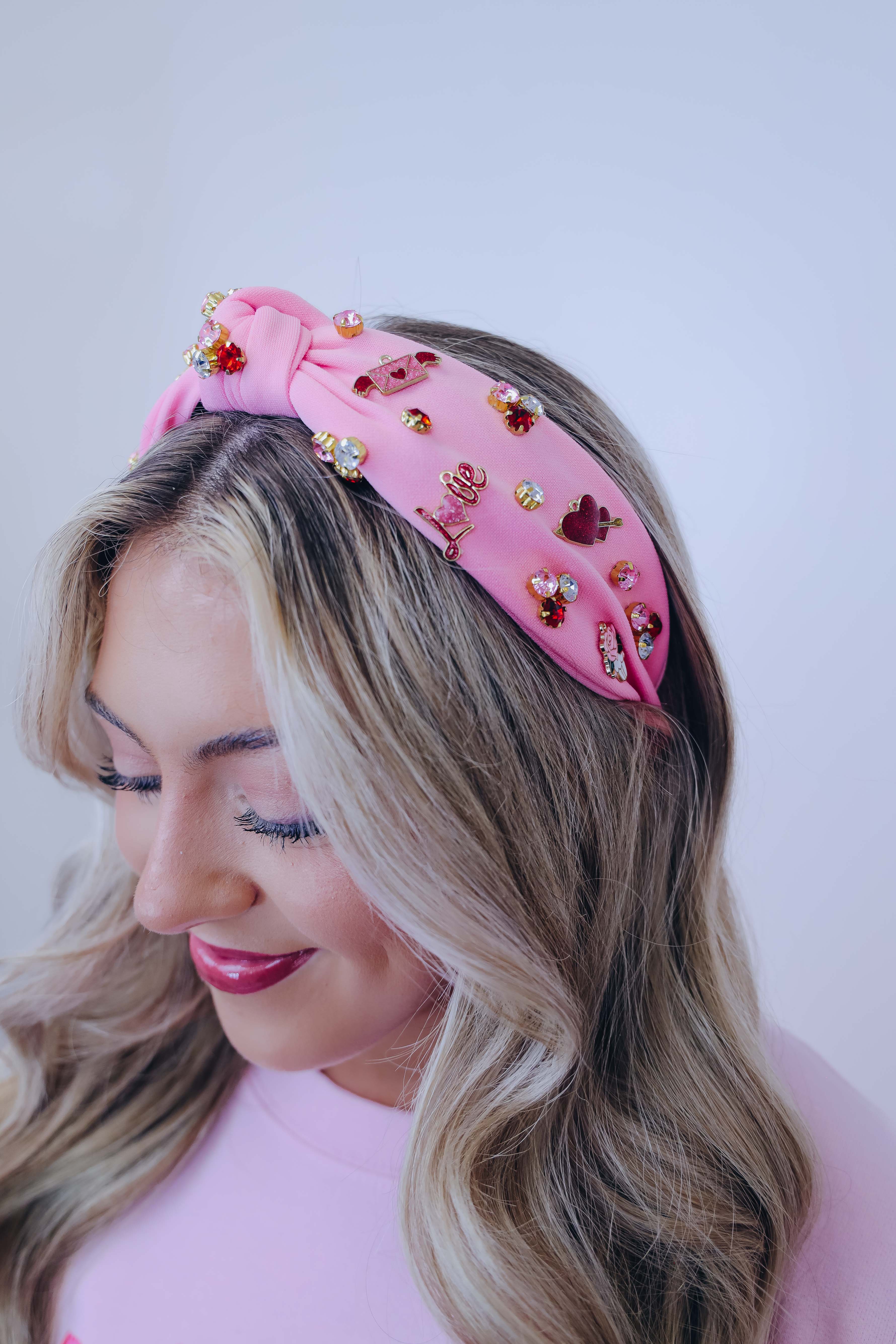- Featuring a knotted headband adorned with colorful stones and charms including hearts with a arrow through it, roses, "love", and a love letter.