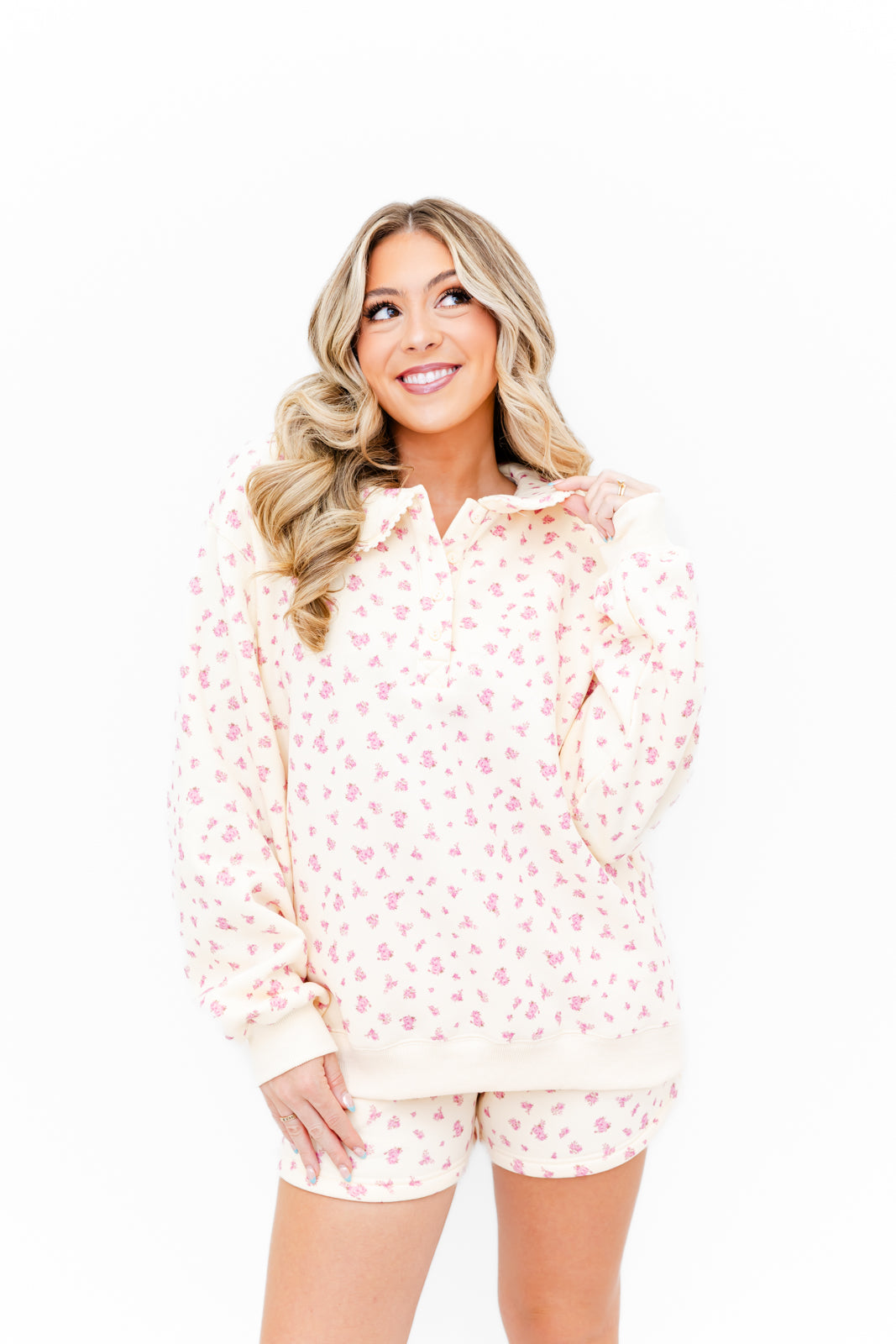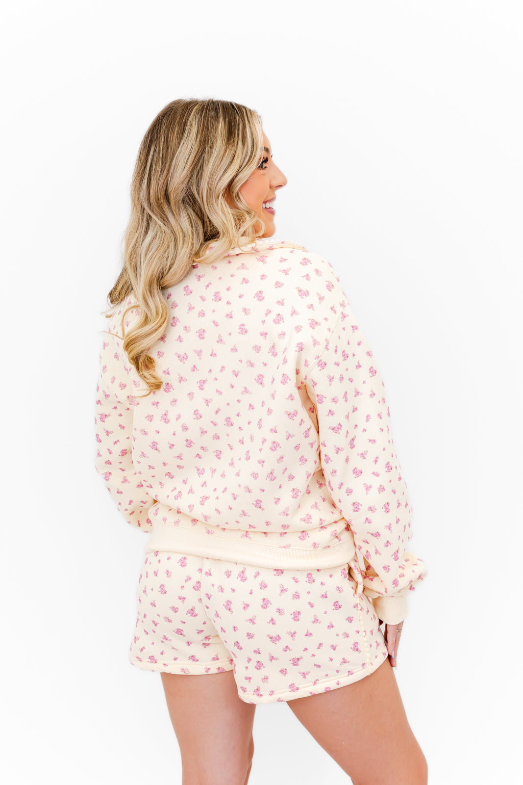 - This set features a super soft fleece fabric, a pullover top with a peter pan collar, quarter-zip neckline, and balloon sleeves, while the matching shorts have a high-rise fit, elastic waistband, and the same allover floral print.