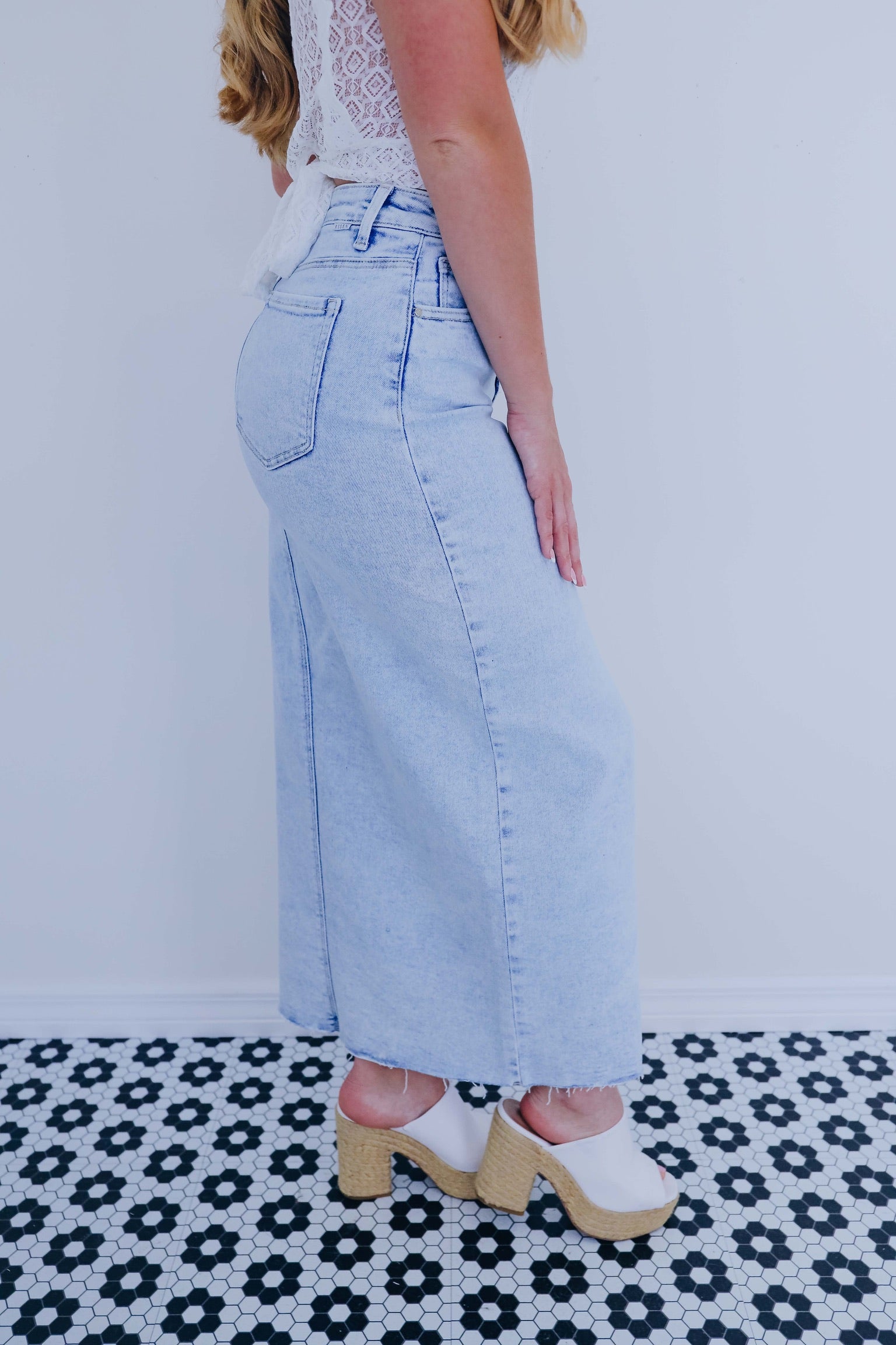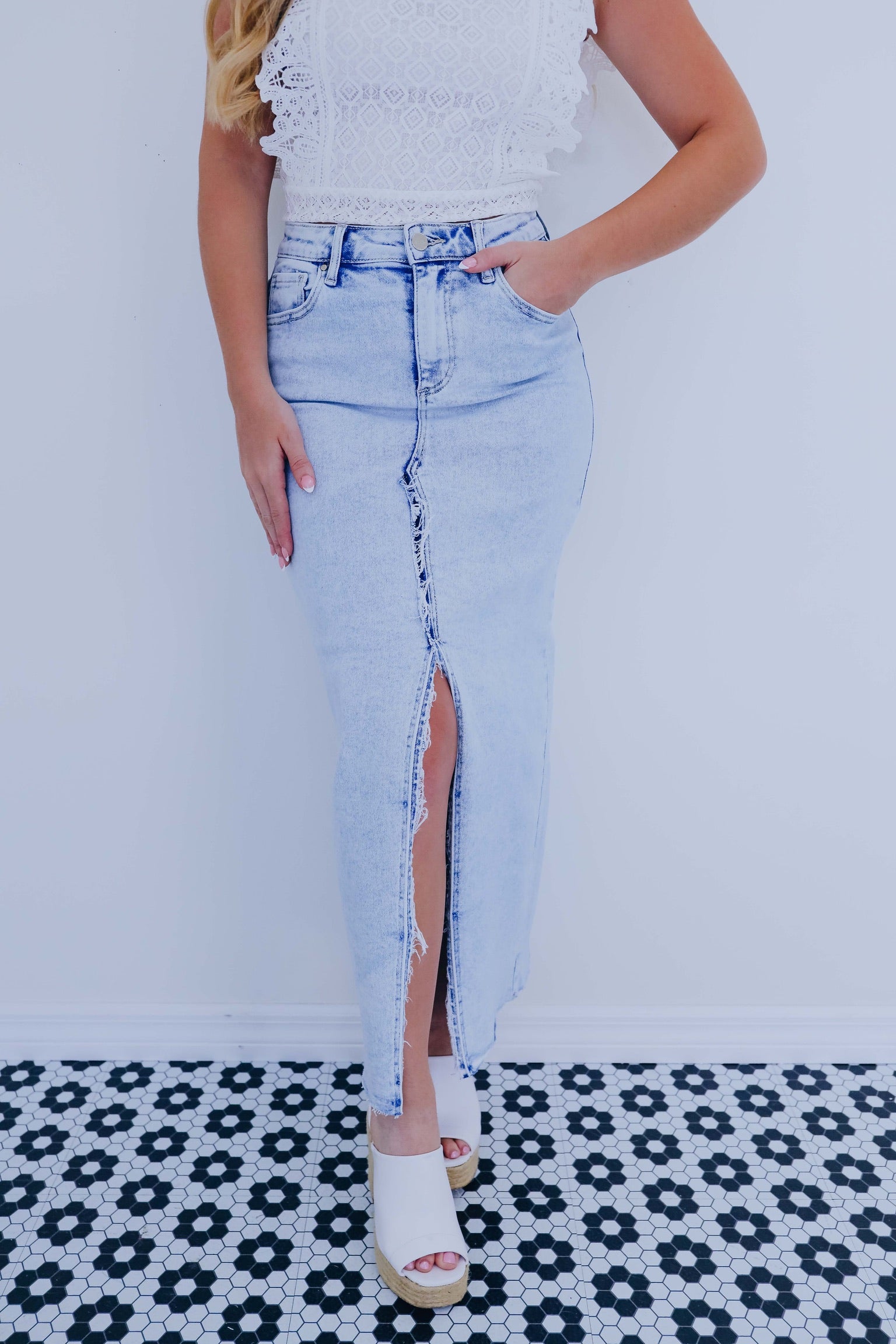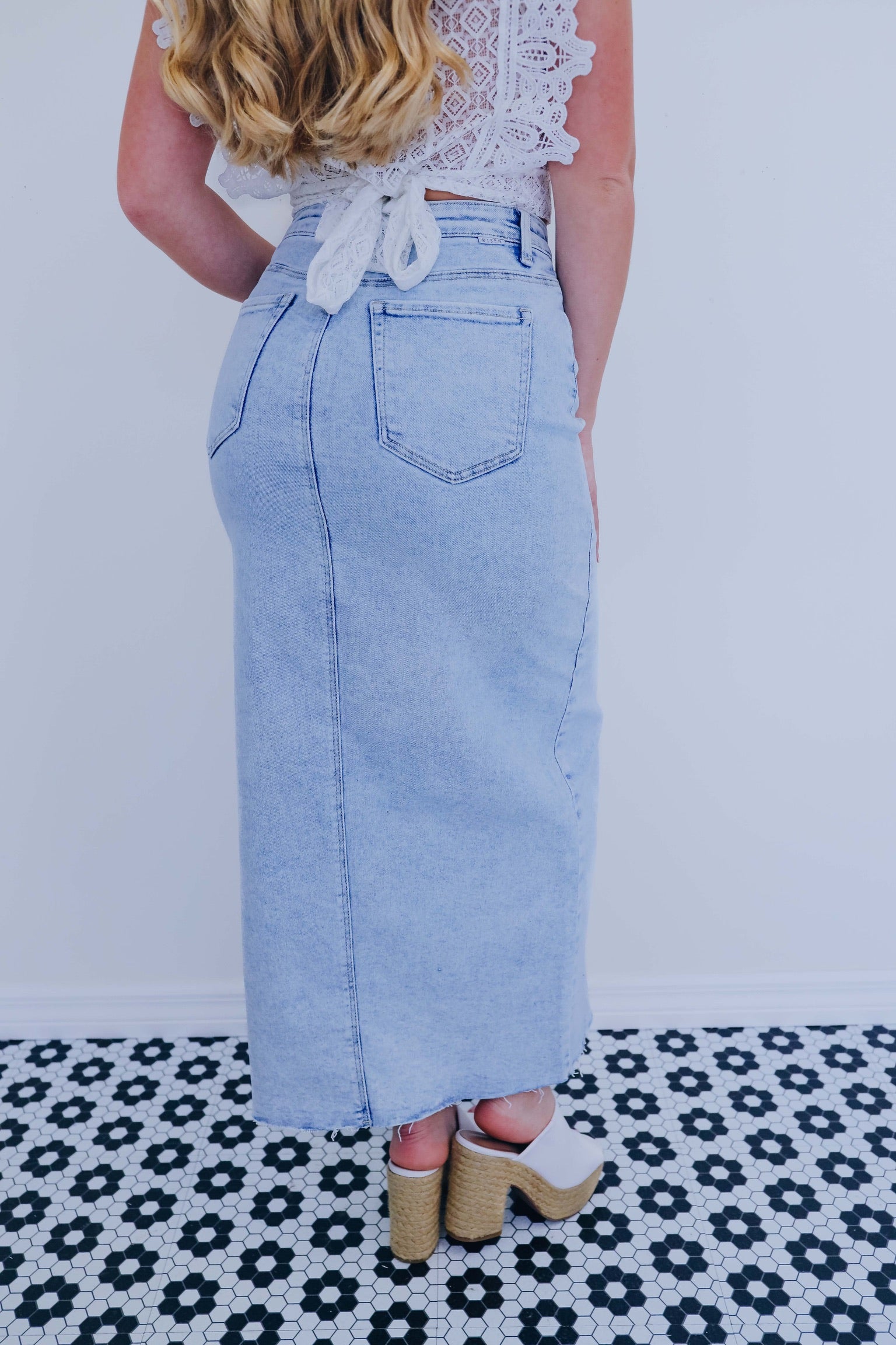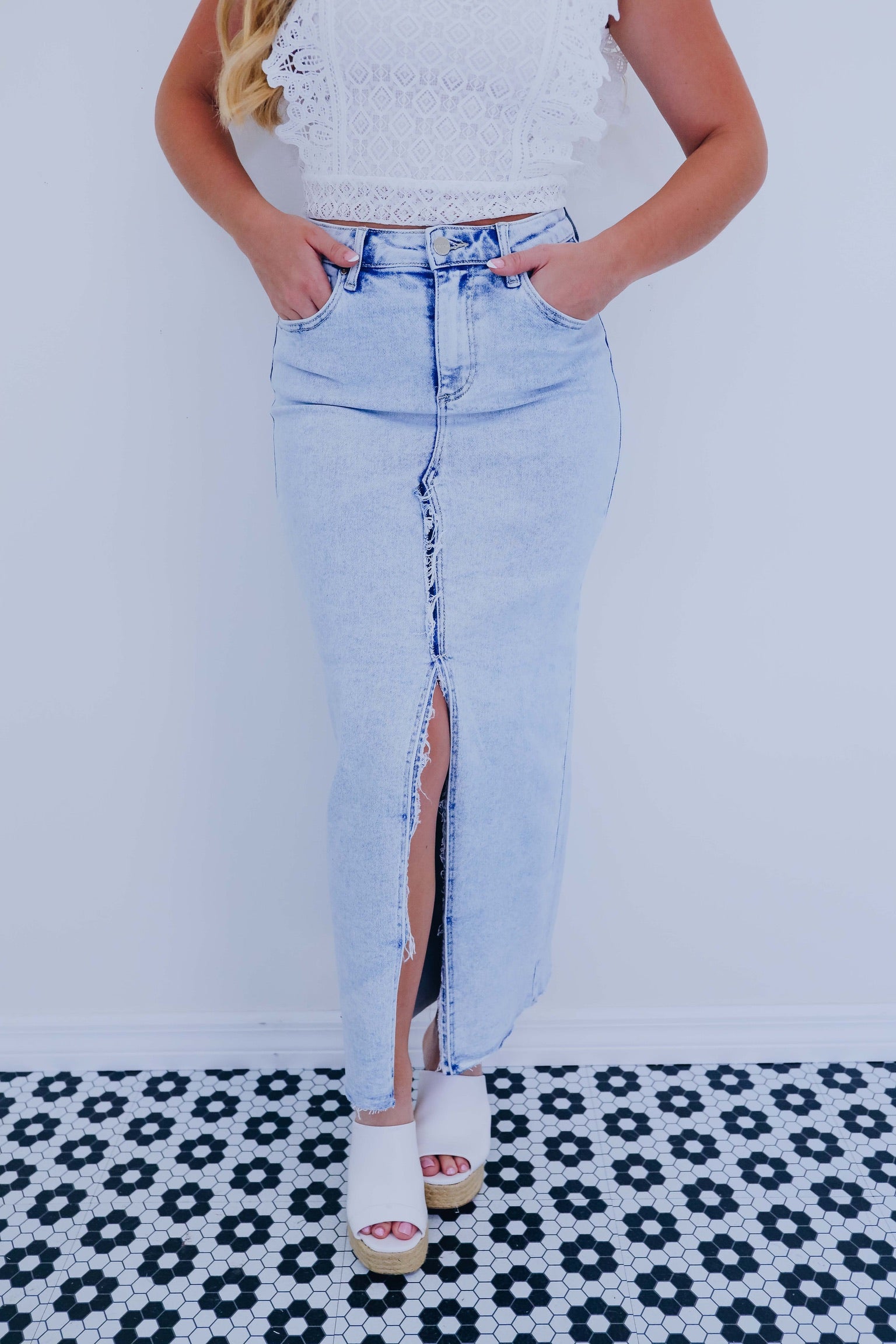 - The Covina Crossover Denim Maxi Skirt is a must-have for its flattering, versatile silhouette. Use it to create a chic and feminine look for a lunch date by pairing it with a blouse and kitten heels. Or, for a date night, style it with a crop top, western belt, and booties.