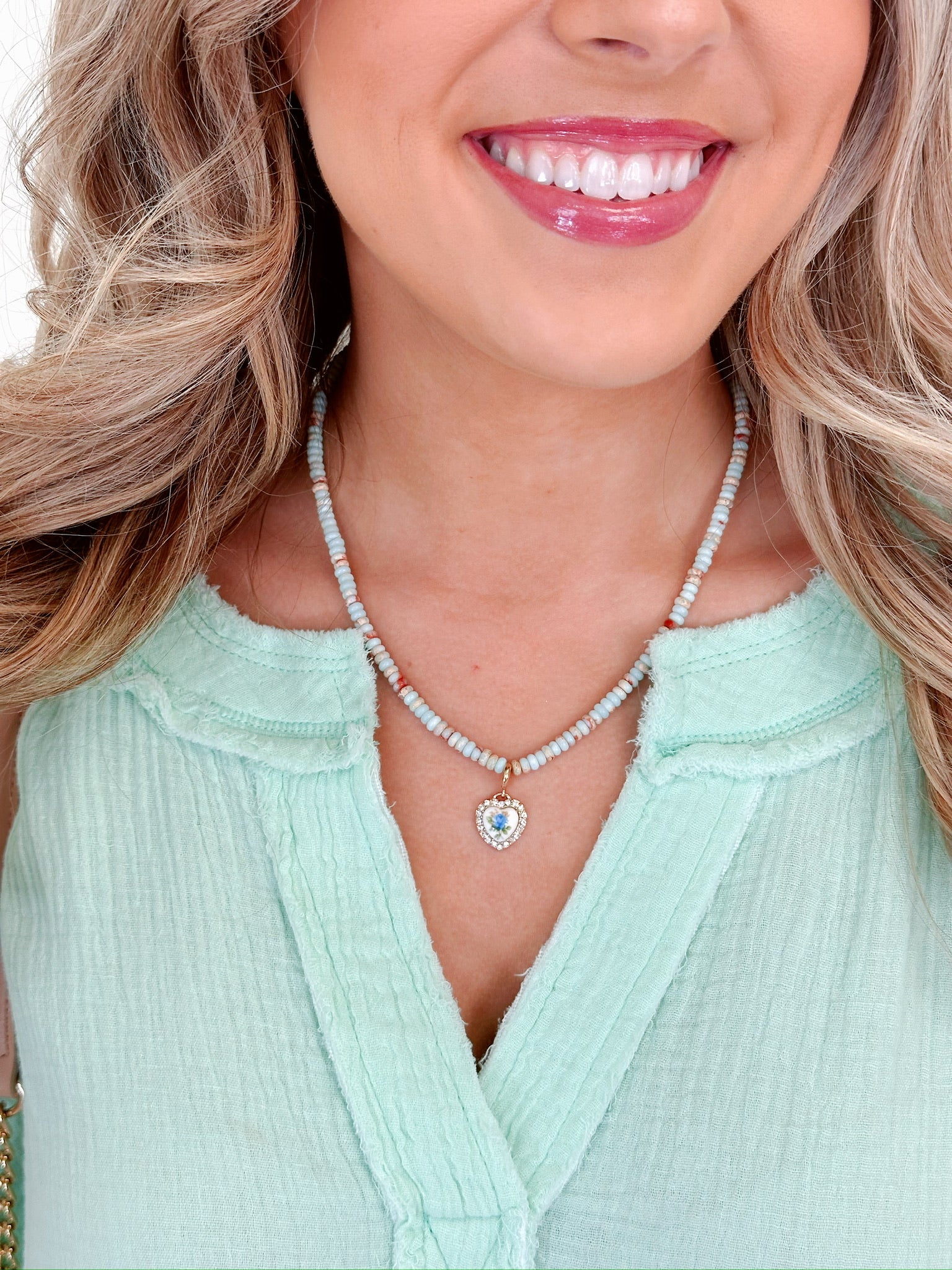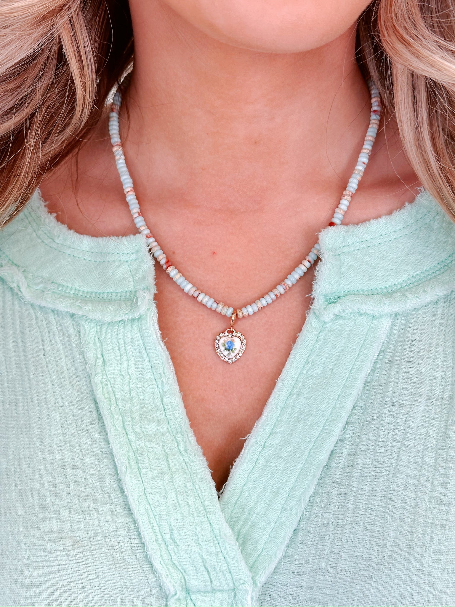 Our Rustic Romance Beaded Charm Necklace blends the beauty of textured blue/green disc beads and a dainty blue floral porcelain heart charm with a touch of sparkle. This must have piece is the perfect balance of natural beauty. Style with gauzy fabrics, linen, or flowy florals for that boho chic vibe.