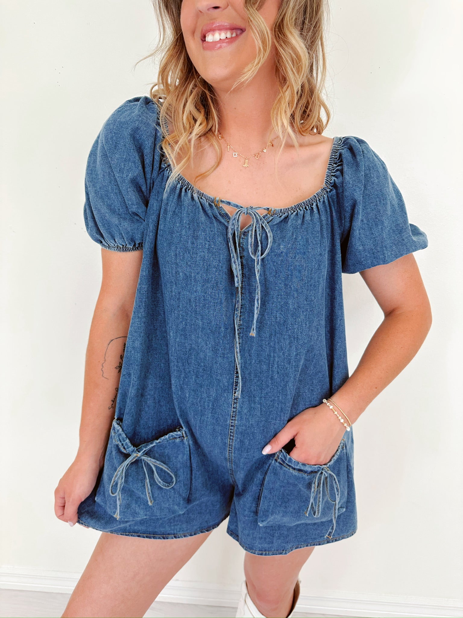 - Our Dakota Puff Sleeve Denim Romper brings effortless charm to every moment. Easily dress this cutie up with white cowgirl boots and layered gold jewelry for a Nashville-ready look, or keep it casual with sneakers and a messy bun for a day spent wandering the farmers' market.
