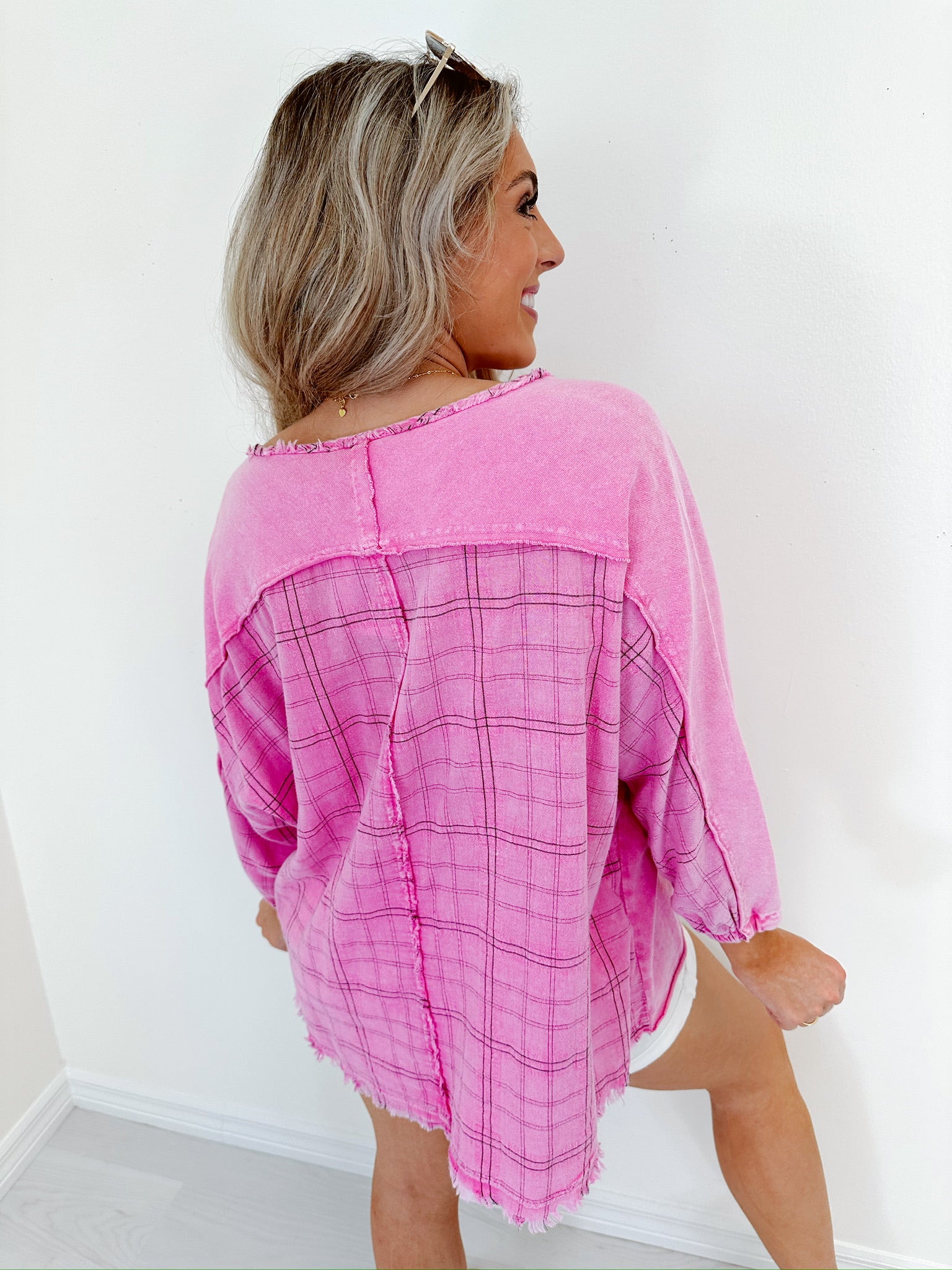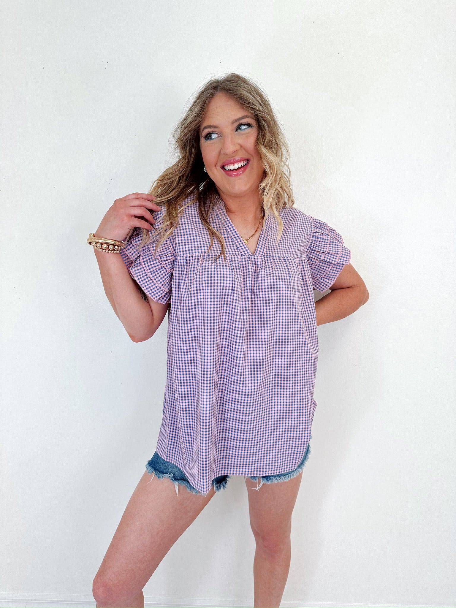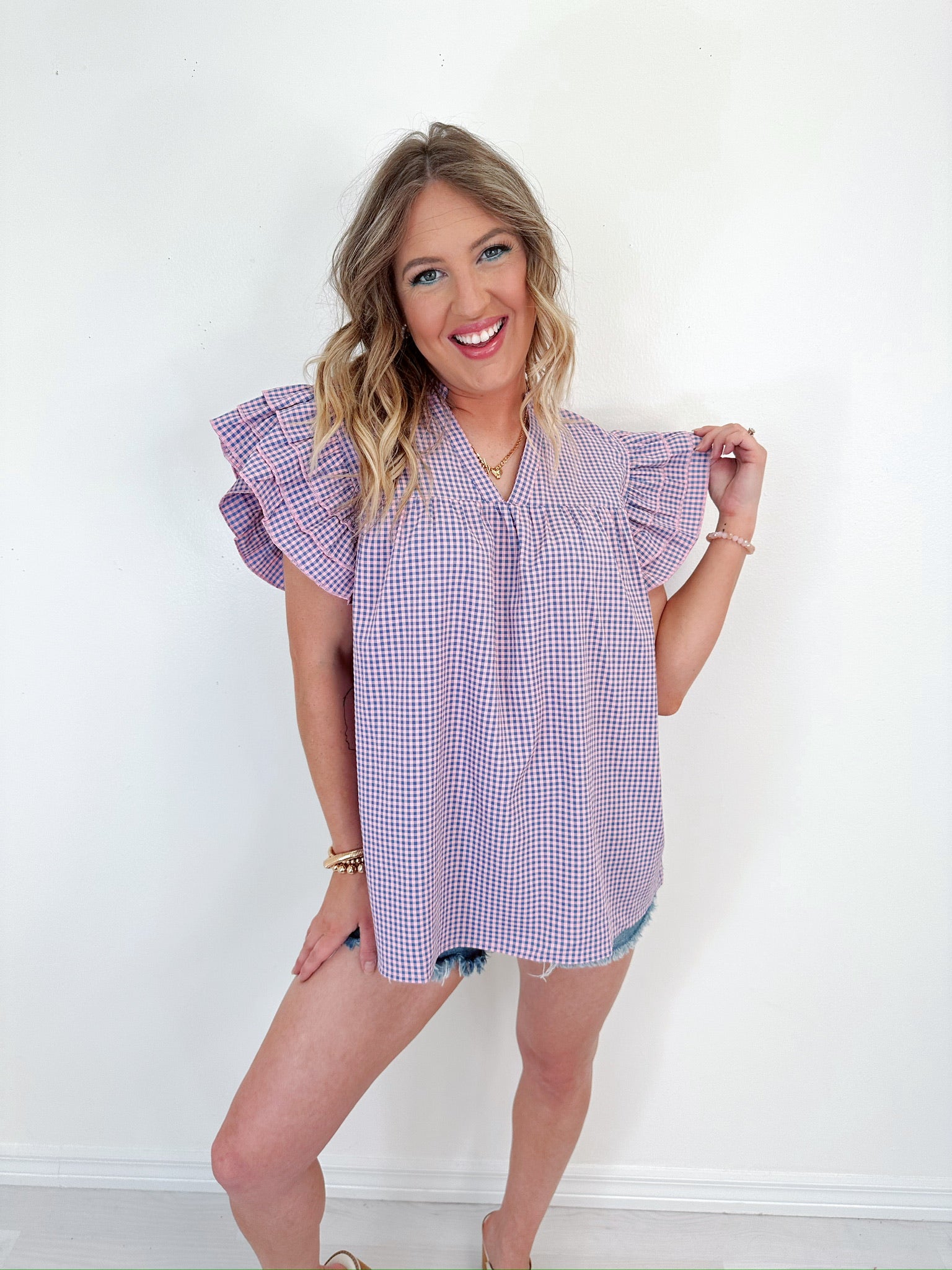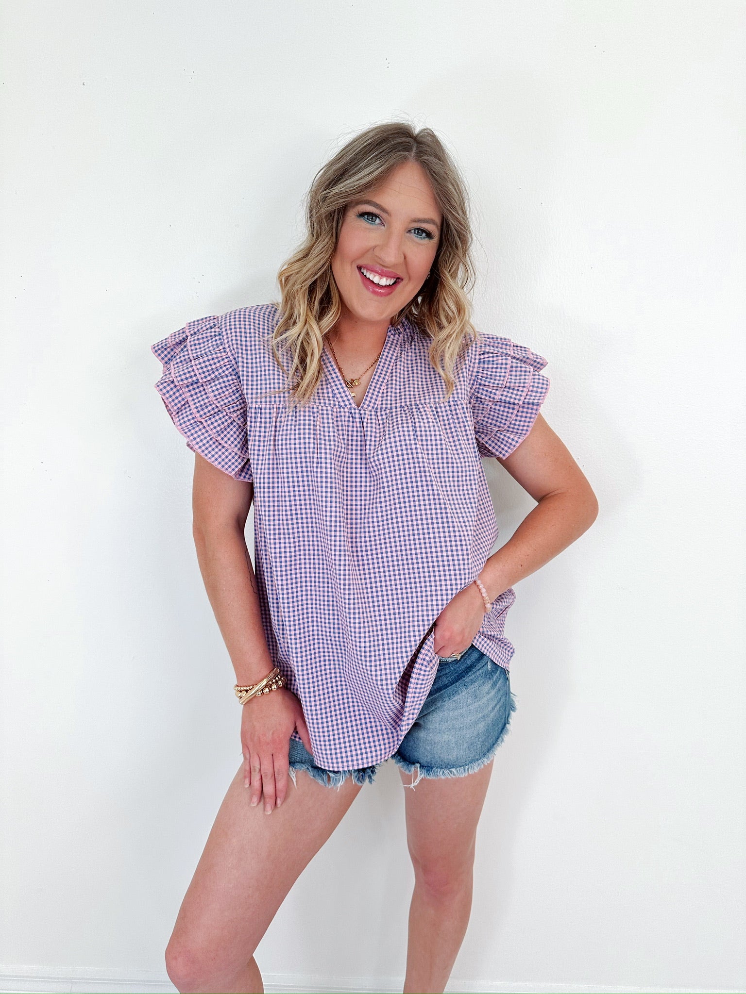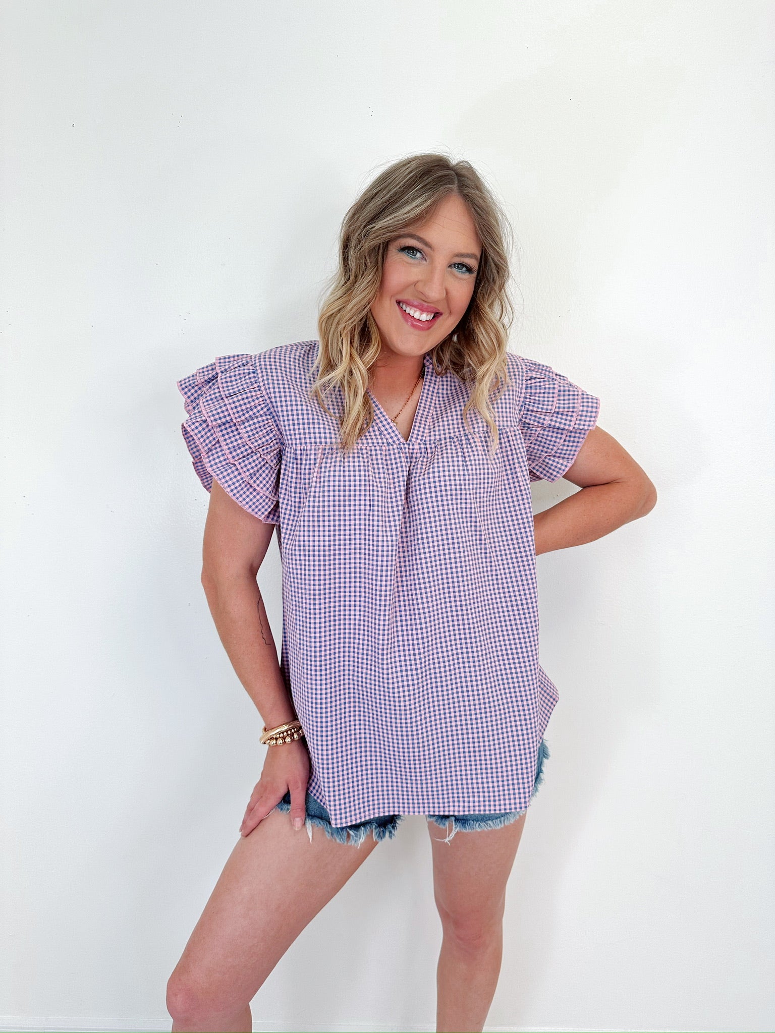 Charity Checkered Ruffle Sleeve Blouse - Pink/Blue