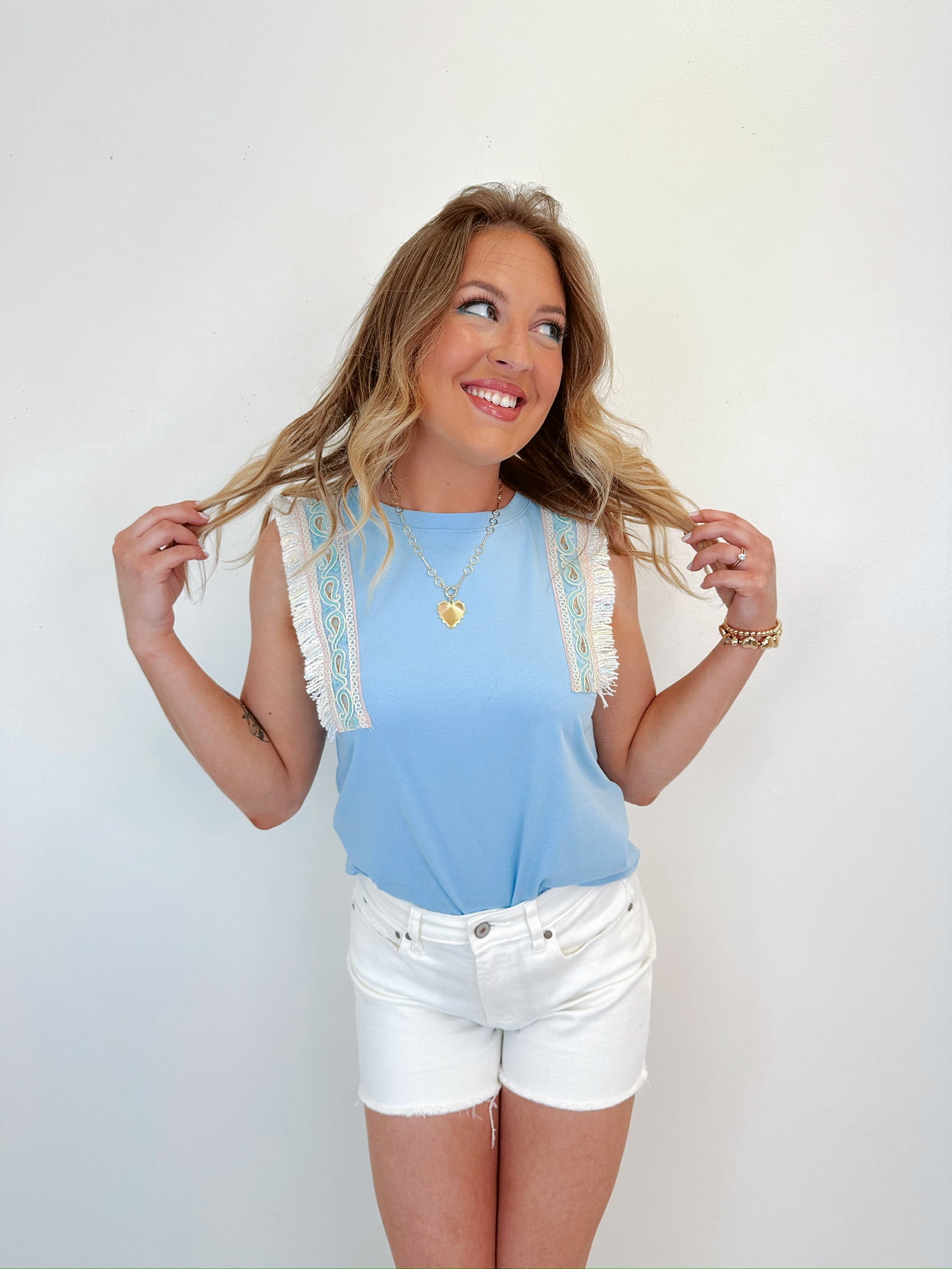 Elise Embroidered Trim Top - Light Blue