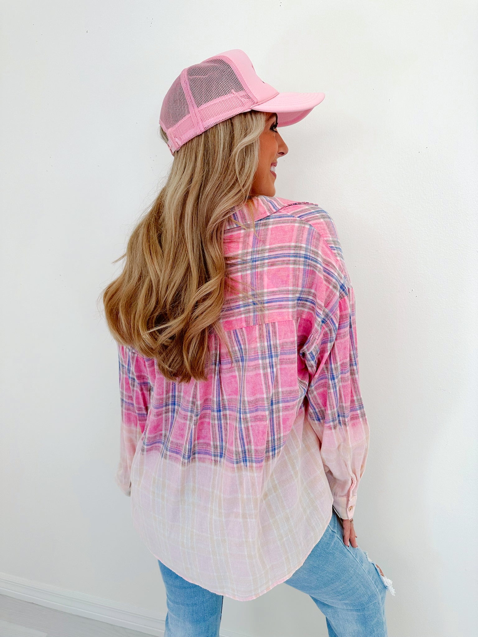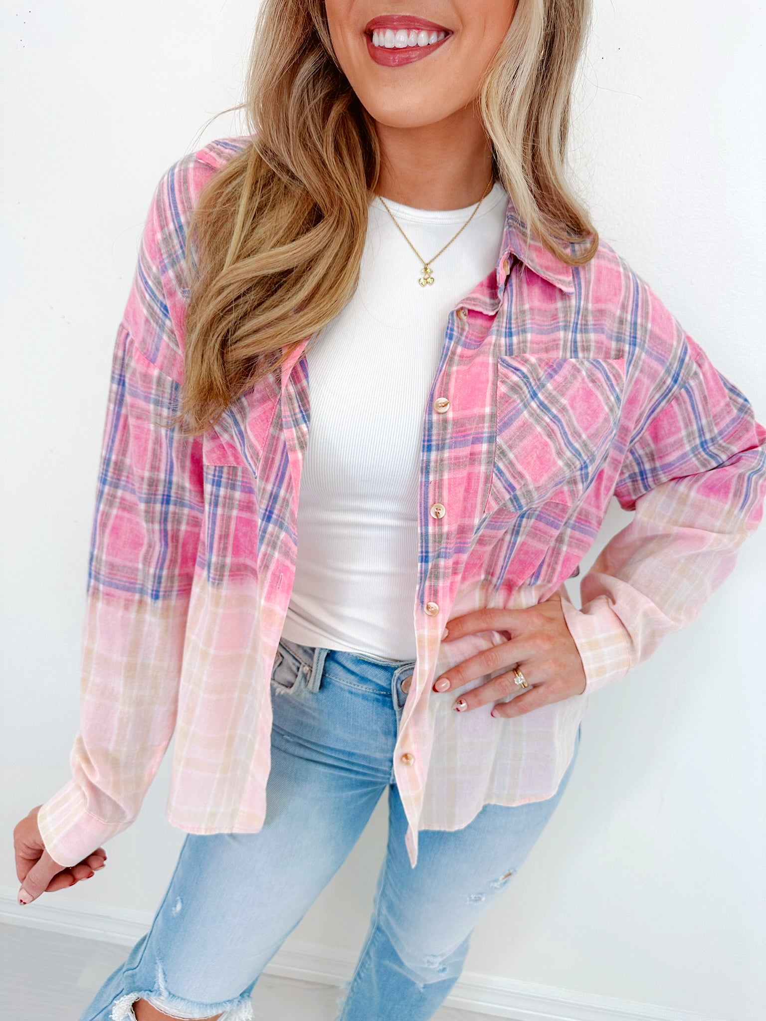 - Our Blushing Bleach Washed Plaid Shirt exudes both versatility and style. It will be super cute as a standalone piece or worn as outerwear paired with a trendy crop top. Style with your favorite denim for a comfy OOTD.
