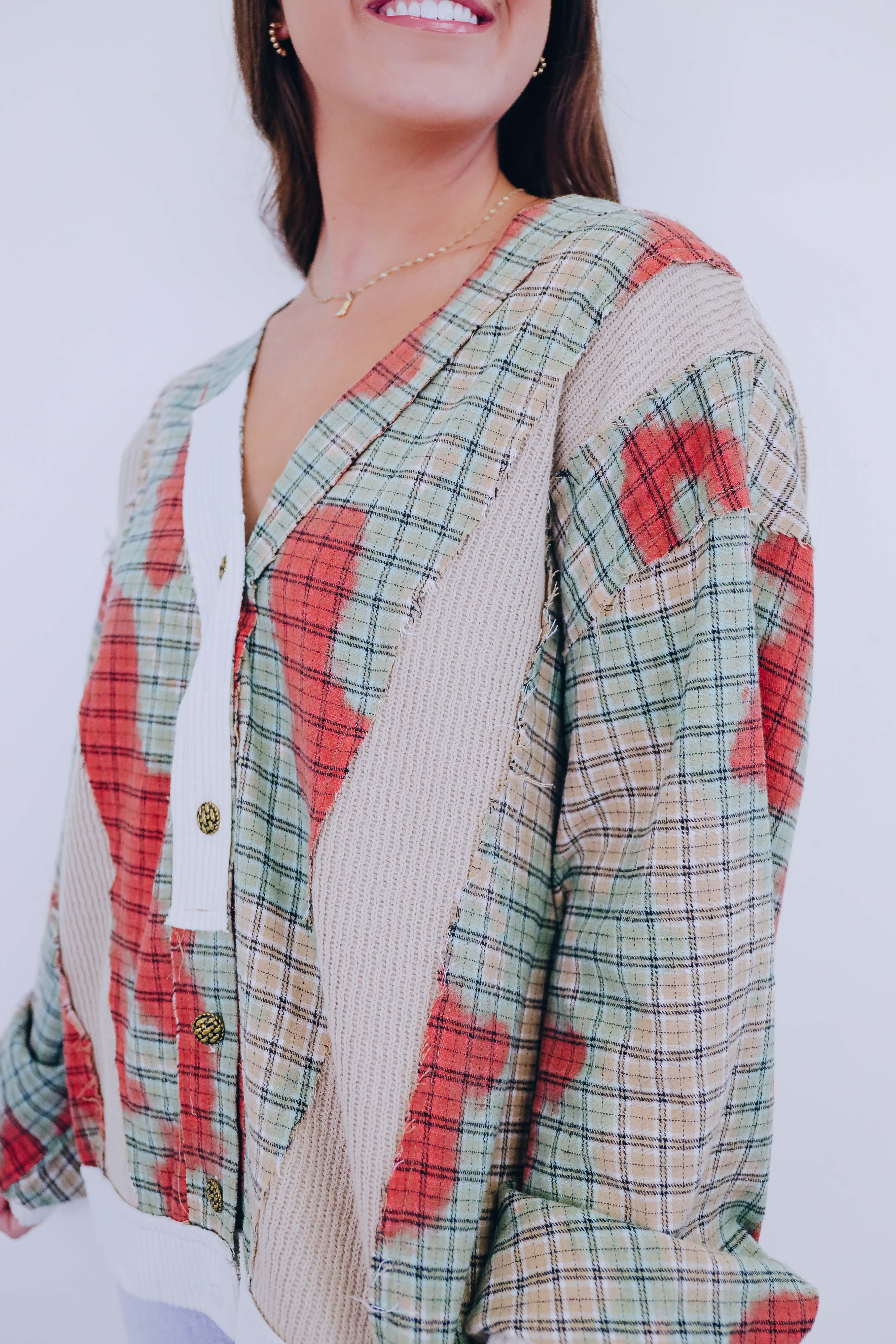 - Created with a combination of super soft fabrics that include a plaid flannel, waffle knit, and ribbed fabrics, a V-neck with button down front, drop shoulder long balloon sleeve with ribbed cuffs, and a straight hem with contrasting trim.