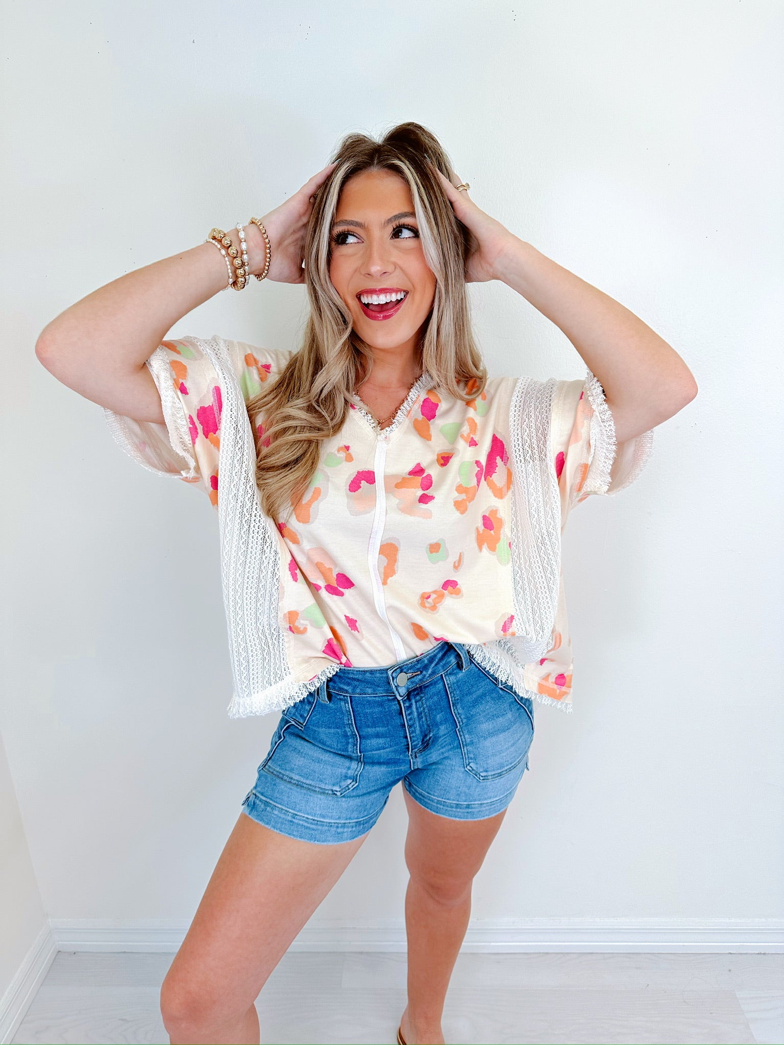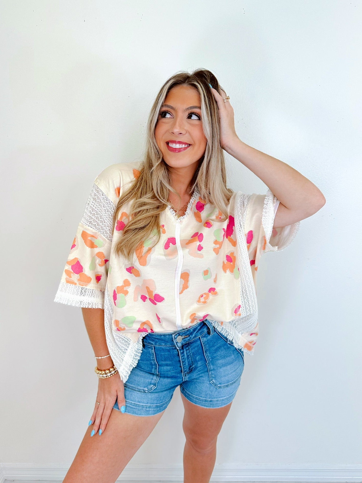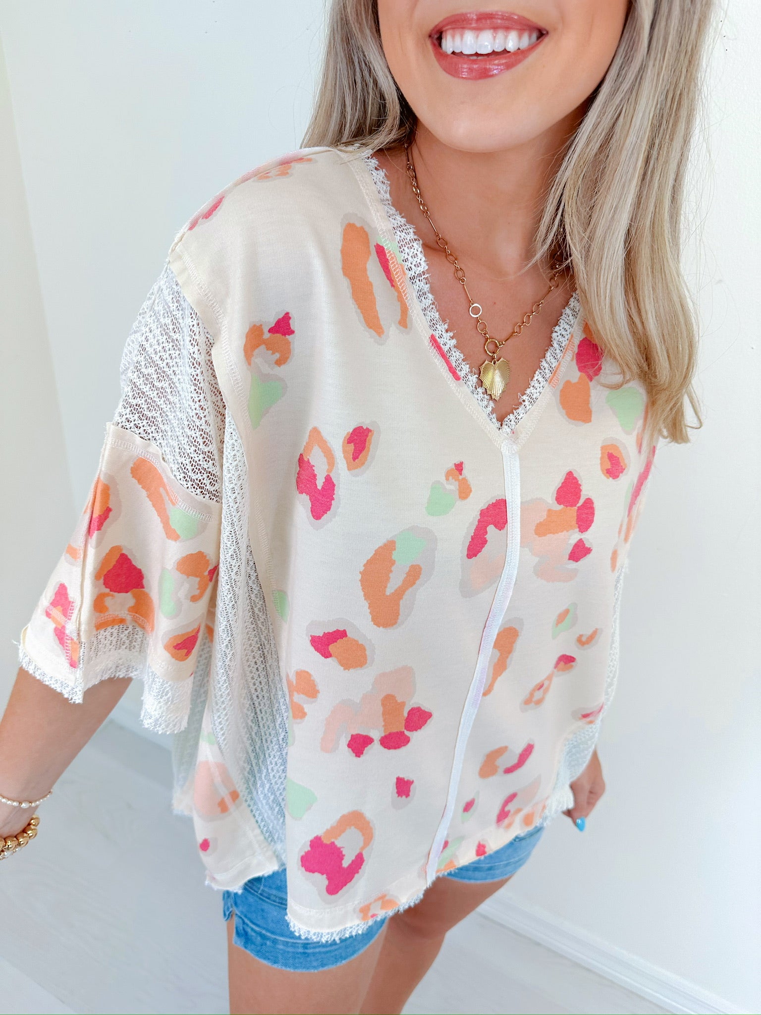 Featuring a soft pastel animal print fabric, a lace trim V-neck, a lace trim dolman sleeve, a mixed textile block design, outseam detailing throughout and a boxy straight hem.