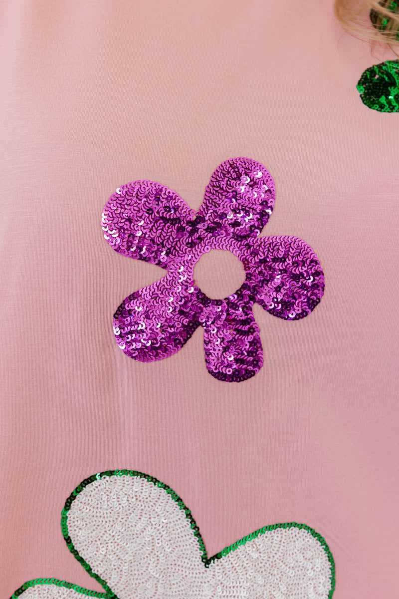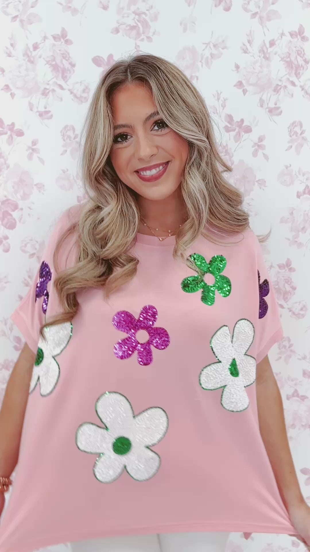 - Add a touch of whimsy to your spring wardrobe with our New Improved Mod Floral Sequin Patch Oversized Top! This top effortlessly pairs with your favorite denim, adding a bit of playful sparkle to your casual OOTD.