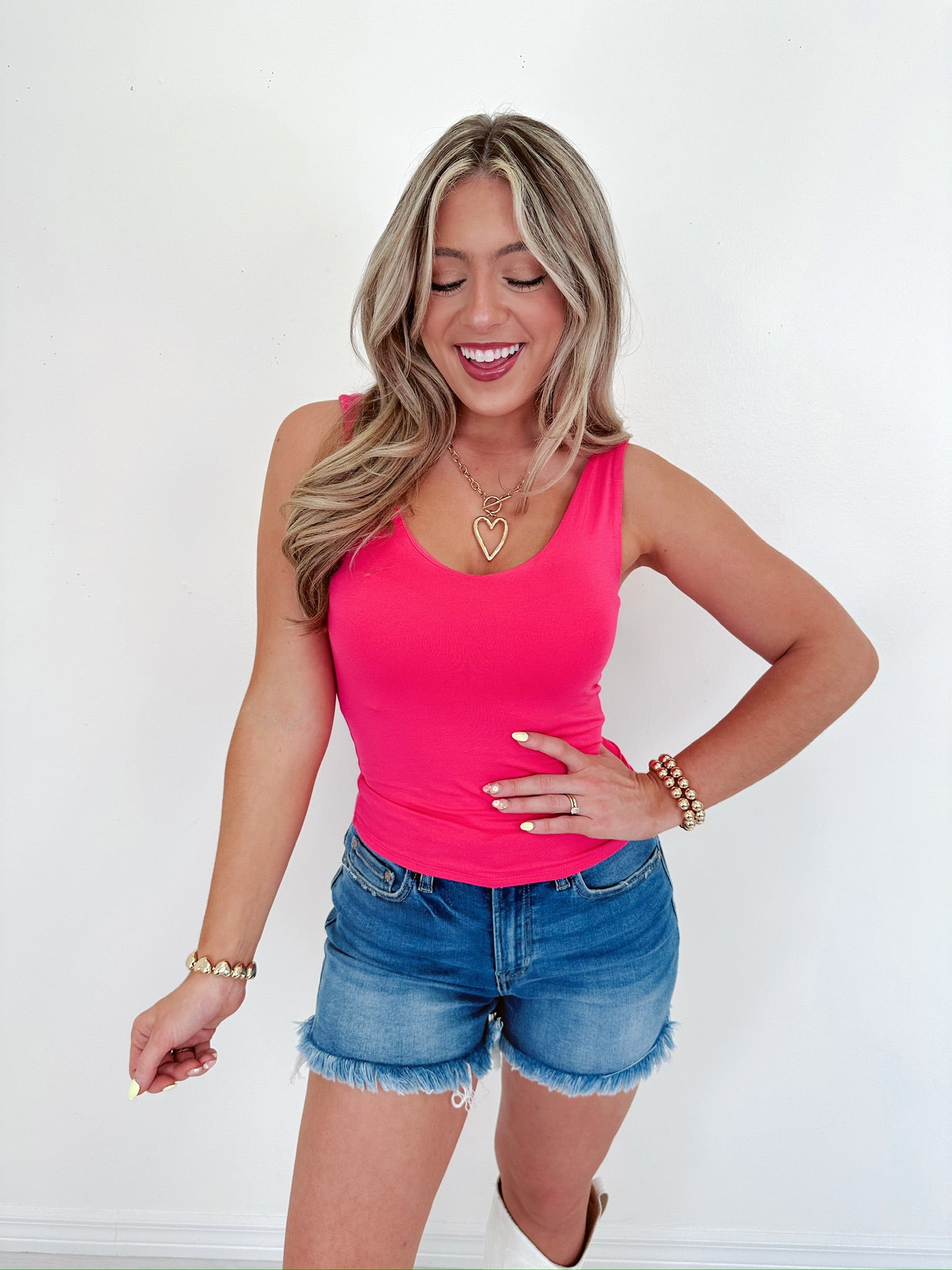 - Features a buttery soft double layer fabric, V-neck, tank straps, and a cropped length.