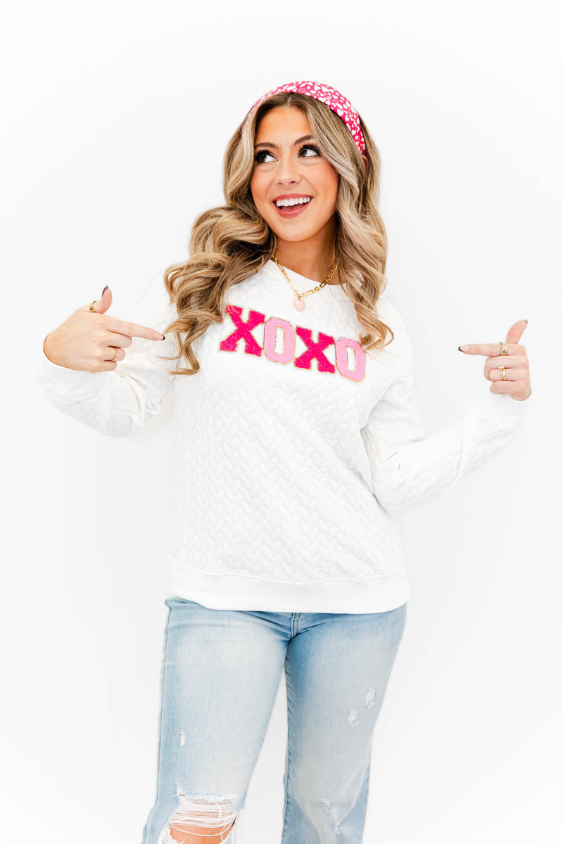 - Sweet, cozy, and full of love, the Hugs & Kisses Cozy Sweatshirt is the perfect feel-good layer for the season. Designed in a soft quilted knit, this sweatshirt features bold XOXO lettering with a touch of sparkle for that signature Whiskey Darling charm. The relaxed fit makes it easy to wear on its own or layered over your favorite top, while the cozy texture keeps you comfortable all day long.