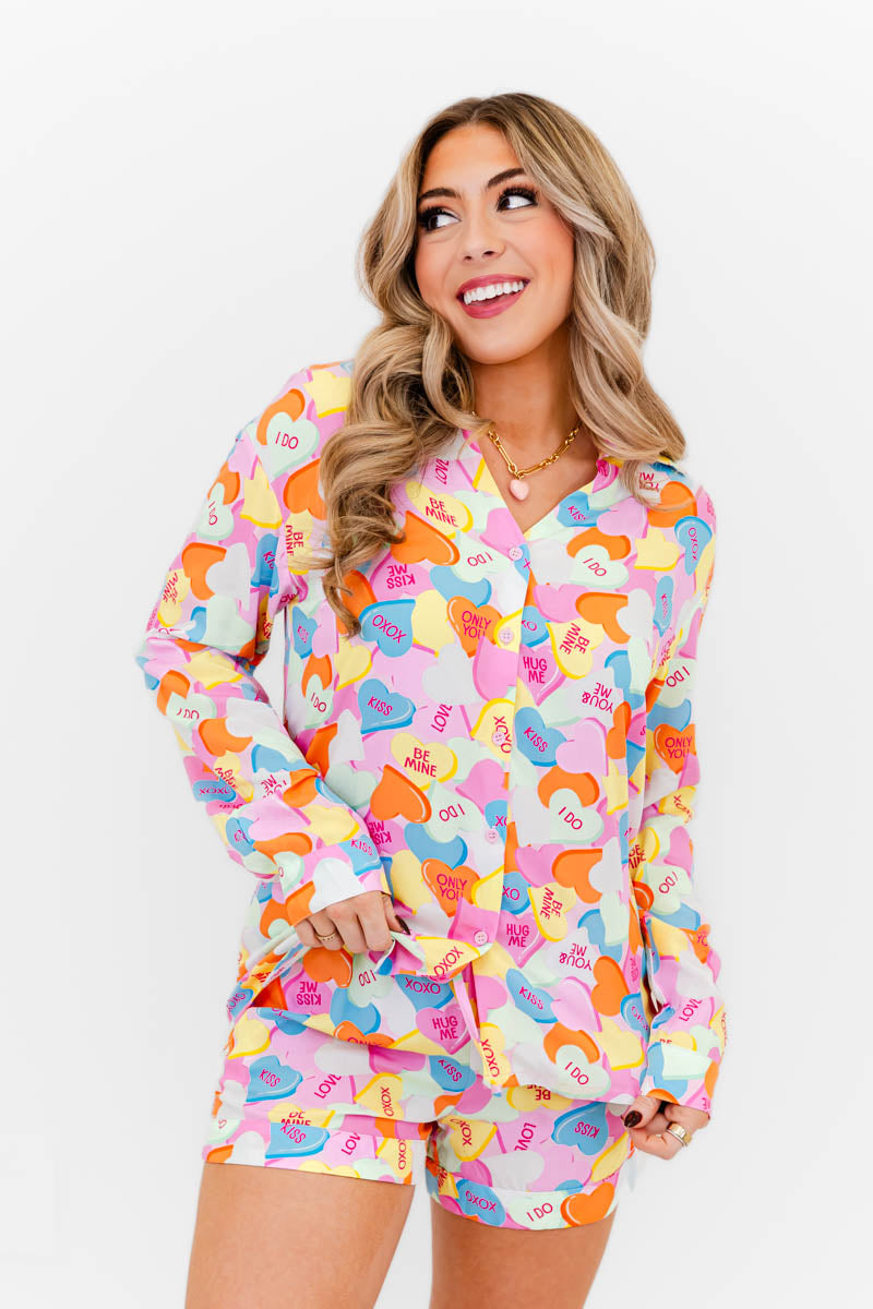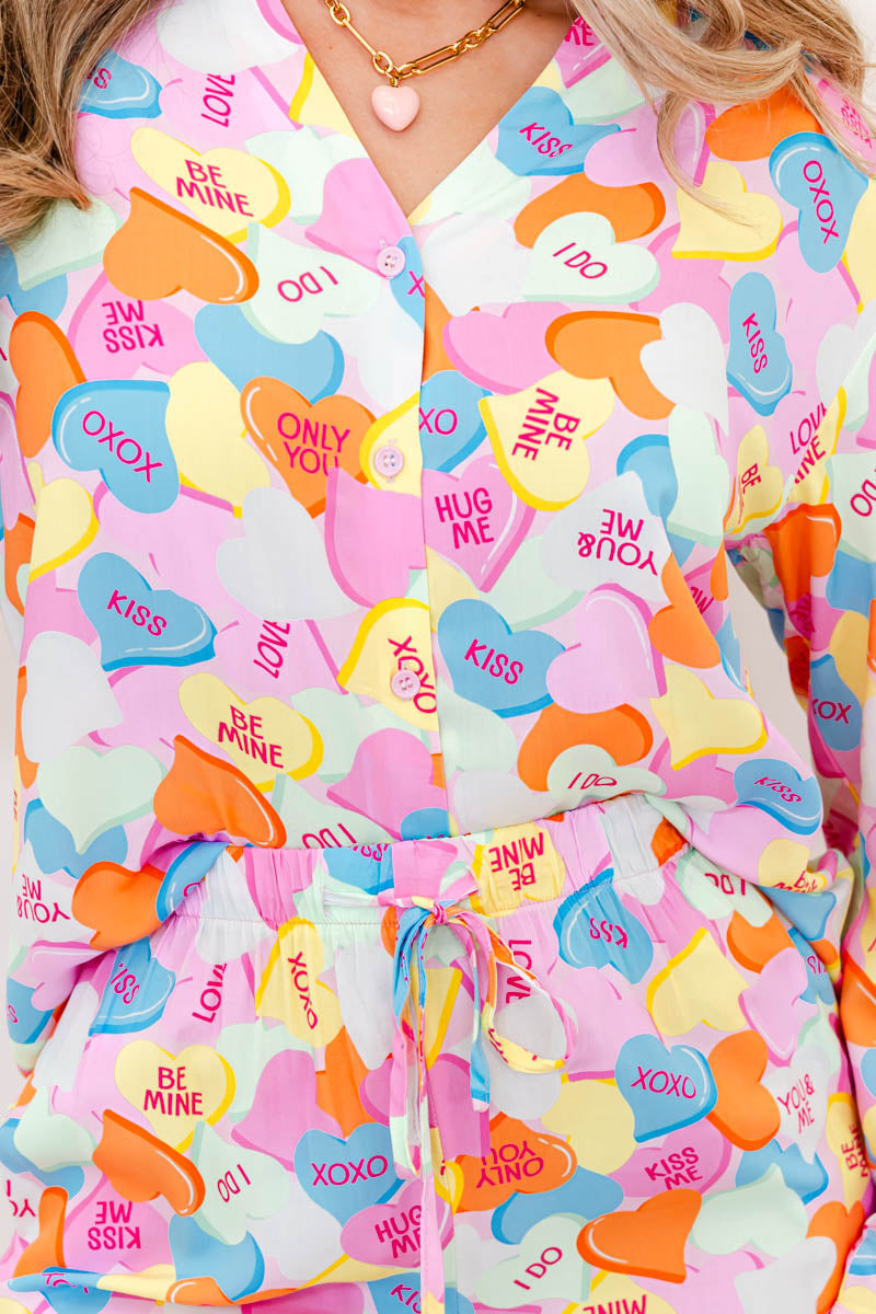- Sweet dreams start here .The Candy Crush Cutie PJ Set is the ultimate cozy-cute lounge look, featuring an allover conversation-heart print in the prettiest Valentine hues. Designed with a relaxed button-front top and matching shorts, this set is lightweight, breathable, and irresistibly soft—perfect for lounging, sleeping, or sipping your morning coffee in style.
