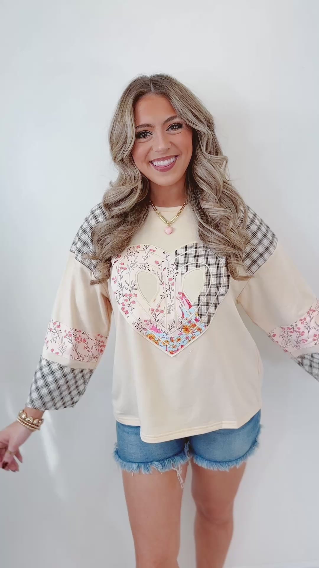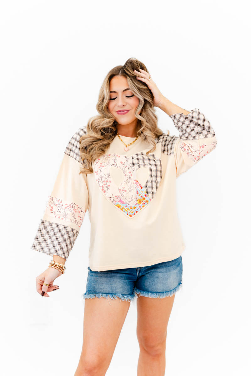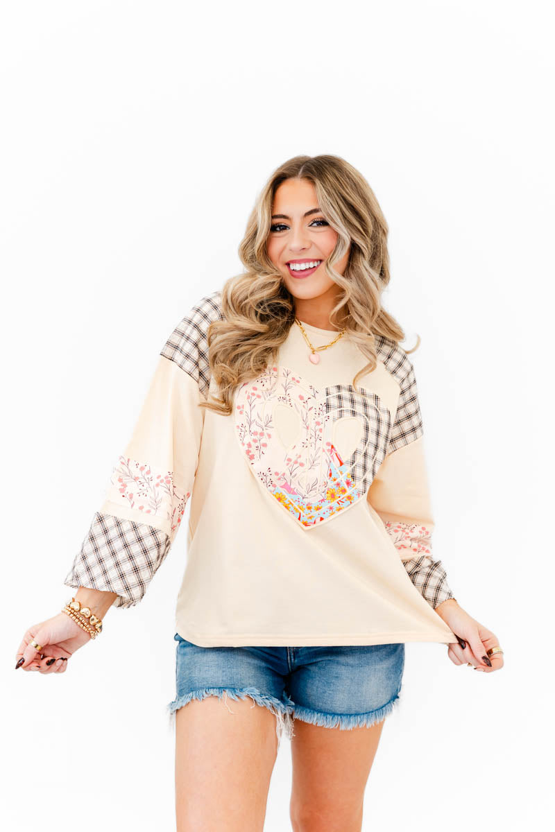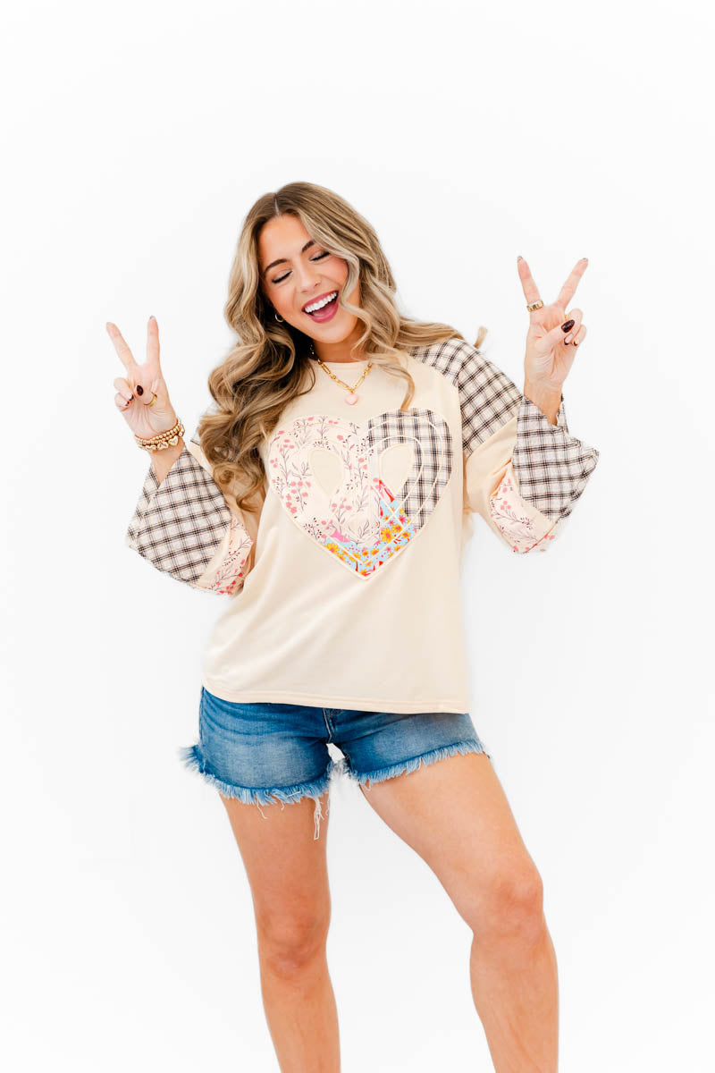 - Fall in love with effortless charm in our Sweet Patchwork Heart Tee. This soft, neutral raglan-style top features a statement patchwork heart made from mixed florals and classic plaid, creating the perfect blend of cozy and sweet. Coordinating floral and plaid accents on the sleeves add an extra touch of detail that makes this piece truly special.