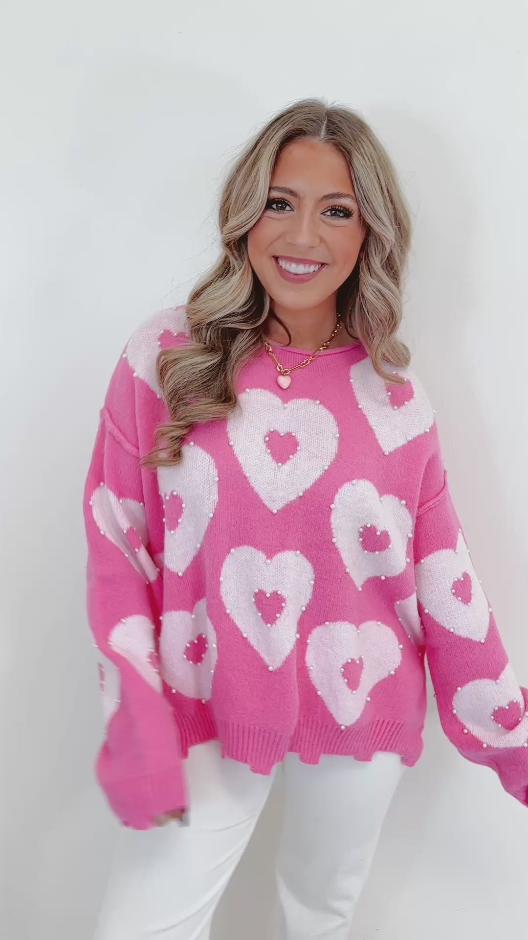 • Sweet, cozy, and full of charm — our Be Mine Pearl Heart Sweater is the ultimate Valentine-ready knit. Designed in a gorgeous pink hue, this sweater features oversized heart details throughout, each accented with delicate pearl embellishments that add the perfect touch of sparkle.