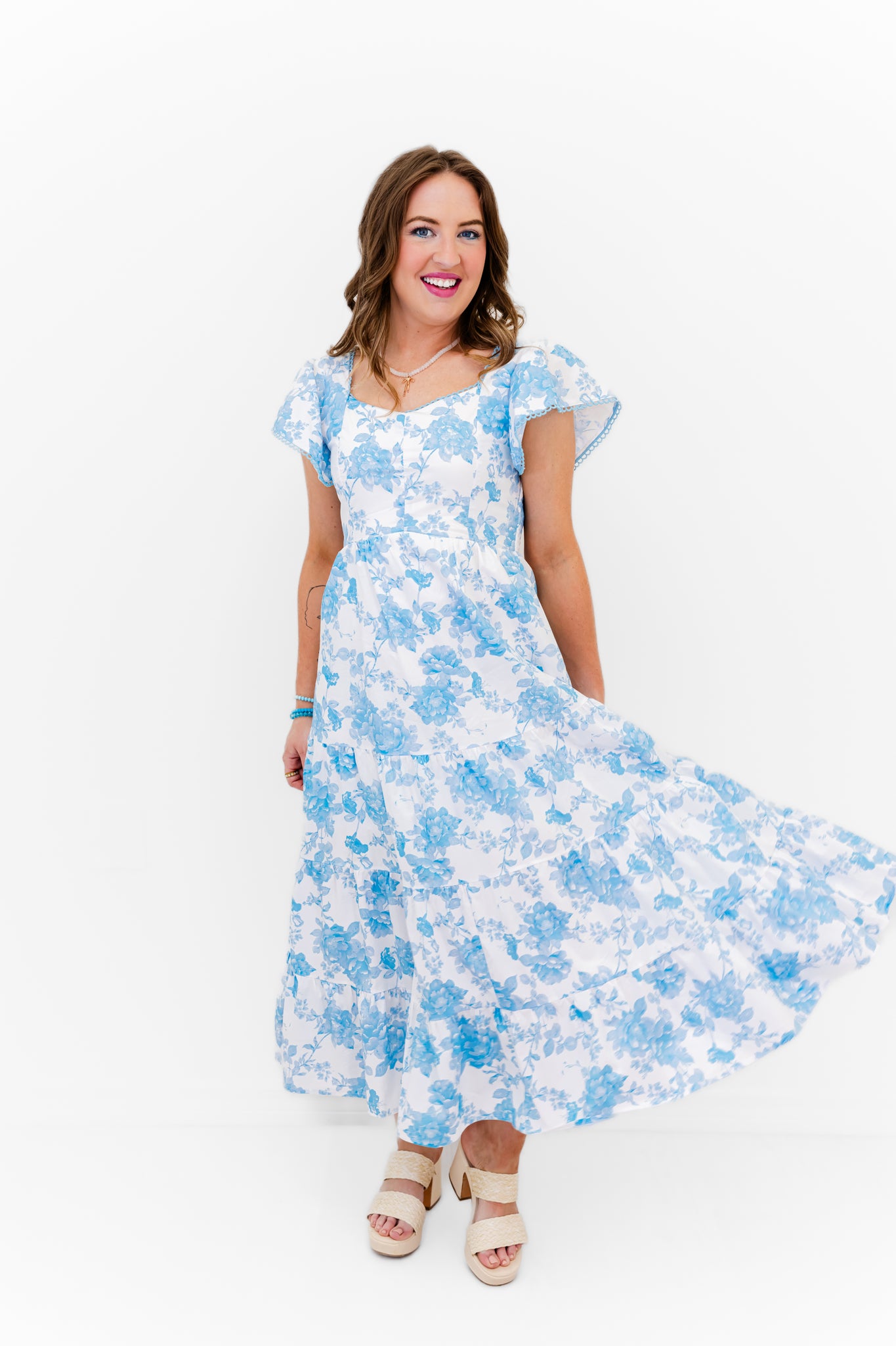 - Float through your day in our Cloud Nine Blossom Dress — the definition of soft, dreamy, and effortlessly feminine. Featuring a delicate blue floral print on a light, airy fabric, this tiered midi is designed to move beautifully with every step.