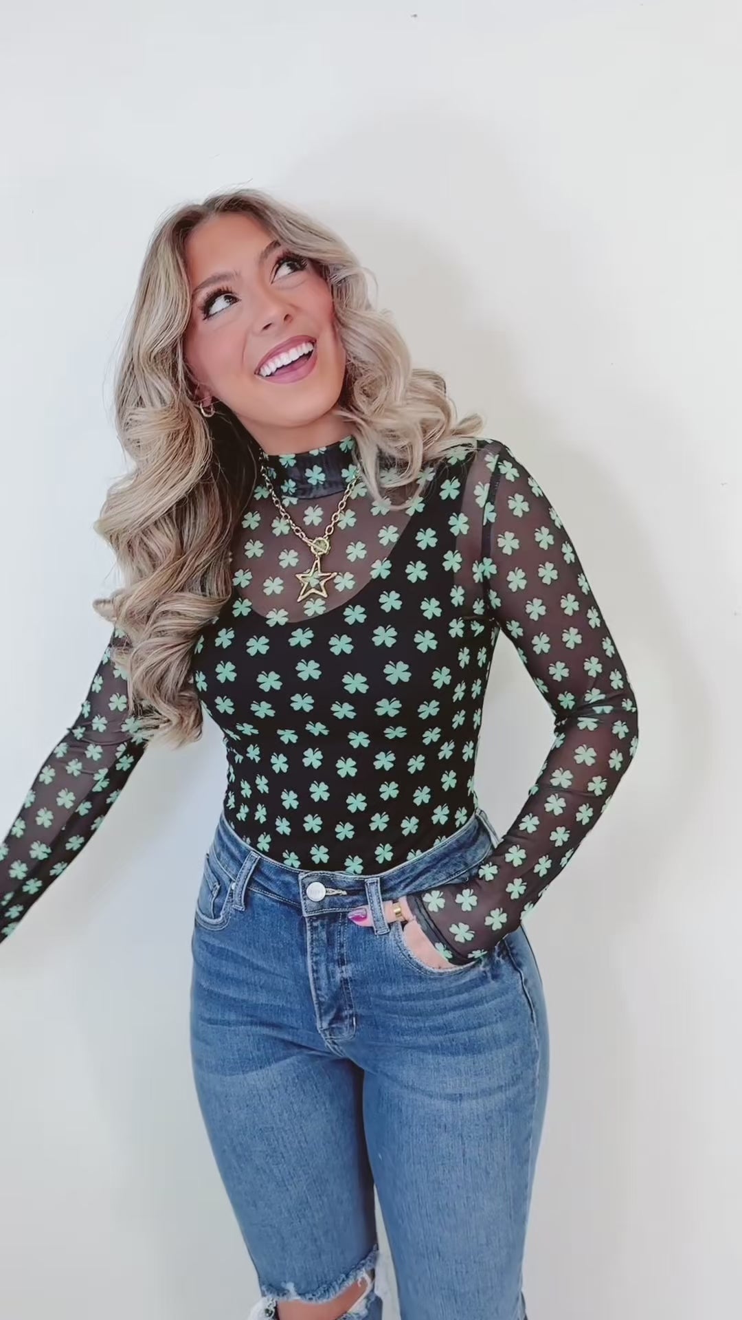 - Turn heads and test your luck in the Feeling Lucky Sheer Shamrock Bodysuit. Designed with a sheer mesh fabric and an allover shamrock print, this statement piece is equal parts playful and bold. The fitted silhouette layers perfectly under denim, skirts, or jackets while adding just the right touch of festive flair.