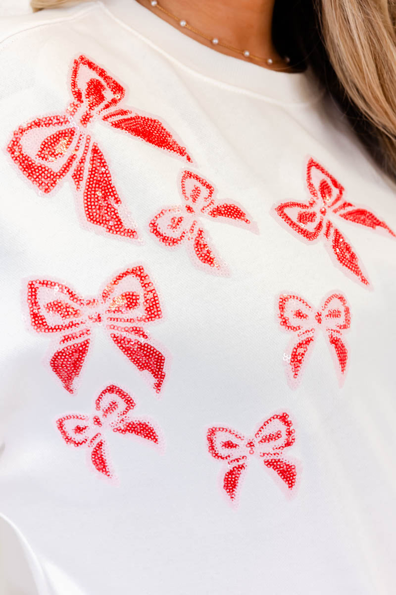 - Sweet, cozy, and full of charm — the Blush & Bows Cozy Sweatshirt is giving all the Valentine vibes. Featuring soft blush bow details scattered across a crisp white base, this pullover is the perfect mix of comfy and cute. Designed with a relaxed fit and lightweight cozy fabric, it’s easy to throw on while still looking effortlessly put together.