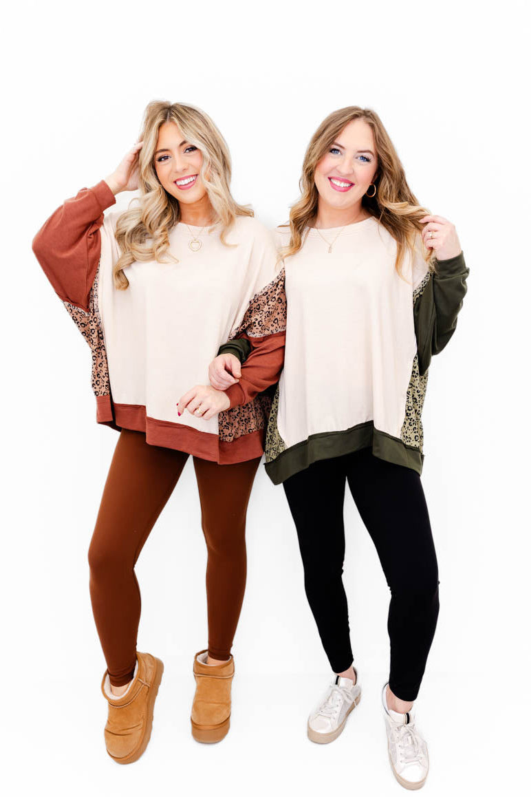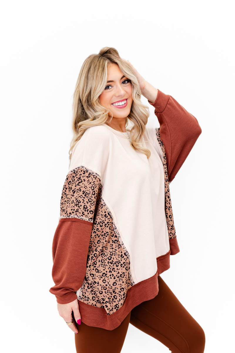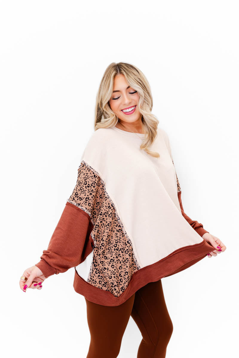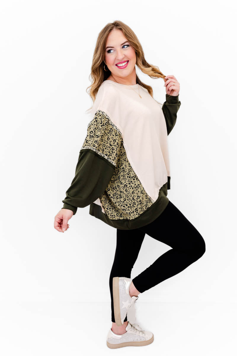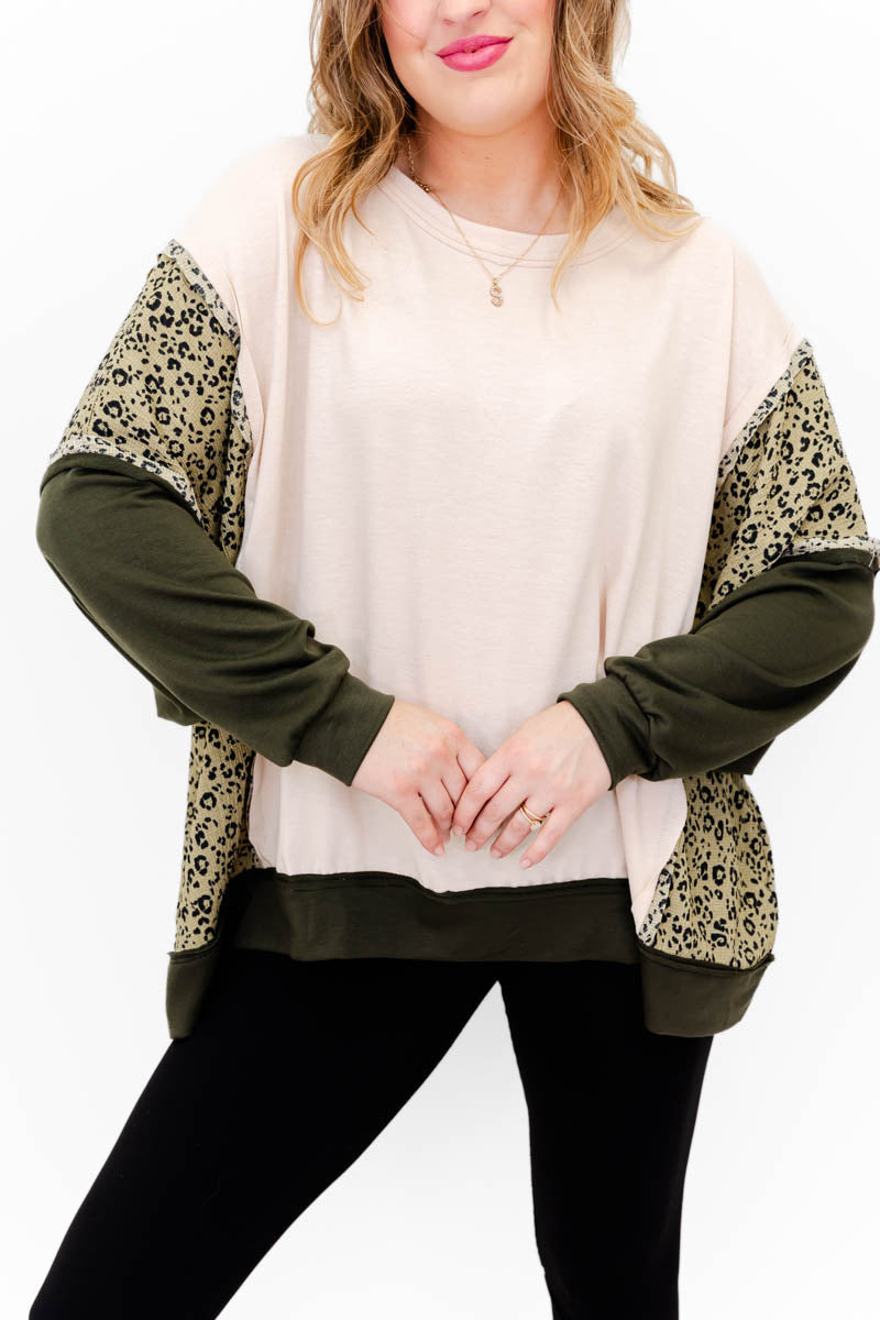 Bring a touch of wild to your everyday style with our Fierce Fusion Sweatshirt. Designed with a soft cream body and contrasted by bold animal print sleeve panels, this pullover blends cozy comfort with an elevated boutique look. The drop-shoulder silhouette and oversized fit give it an effortless, relaxed vibe, while the solid color blocking on the sleeves and hemline adds balance and structure.