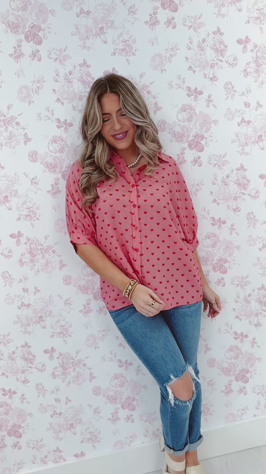 - Style it tucked into denim for a casual daytime look or wear it open over a tank for an easy layered vibe. Whether you’re headed to brunch, the office, or date night, this heart-filled button-down is one you’ll reach for again and again.