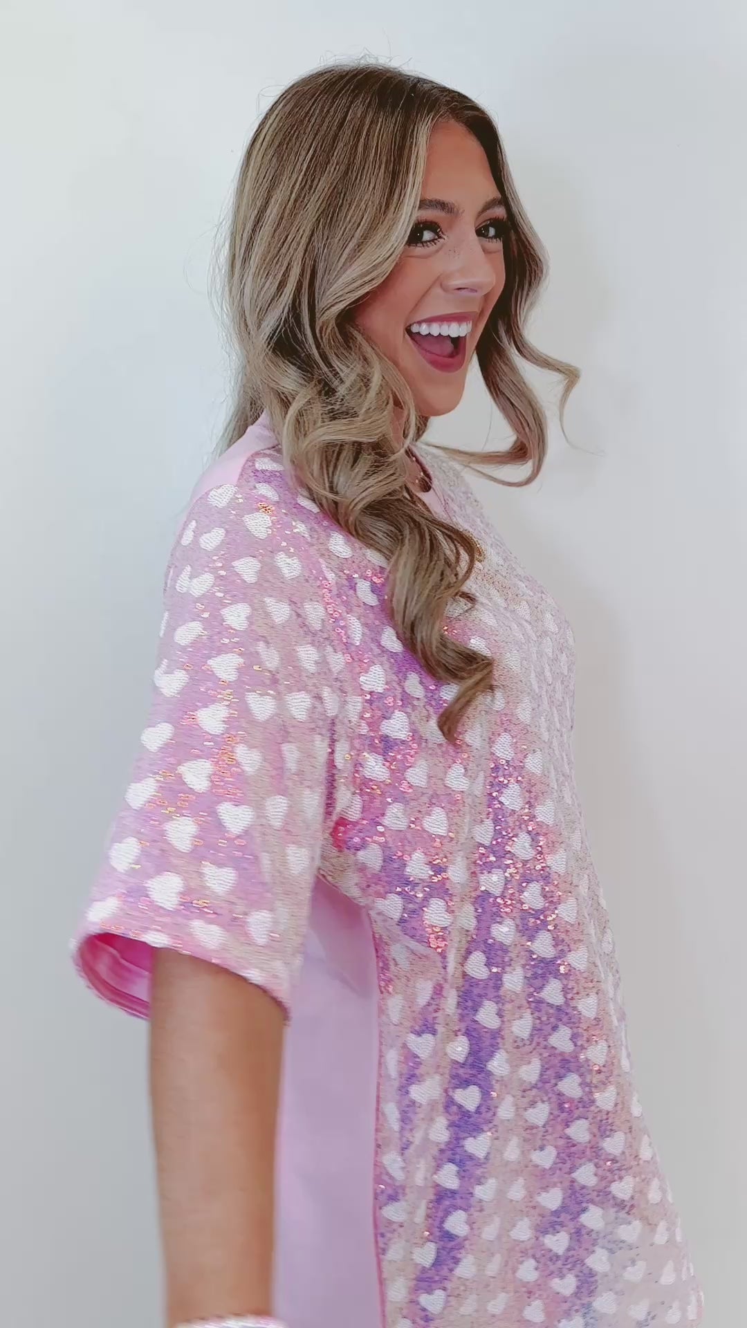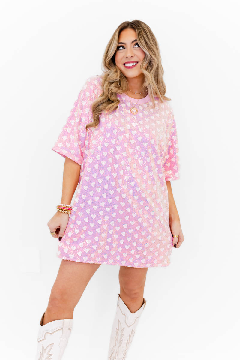 - Fall in love with effortless sparkle in the Pretty in Pink Heart T-Shirt Dress. Designed with an all-over sequin heart pattern, this tee dress brings the perfect mix of cozy comfort and Valentine-ready glam. The relaxed silhouette makes it easy to wear while still making a statement.
