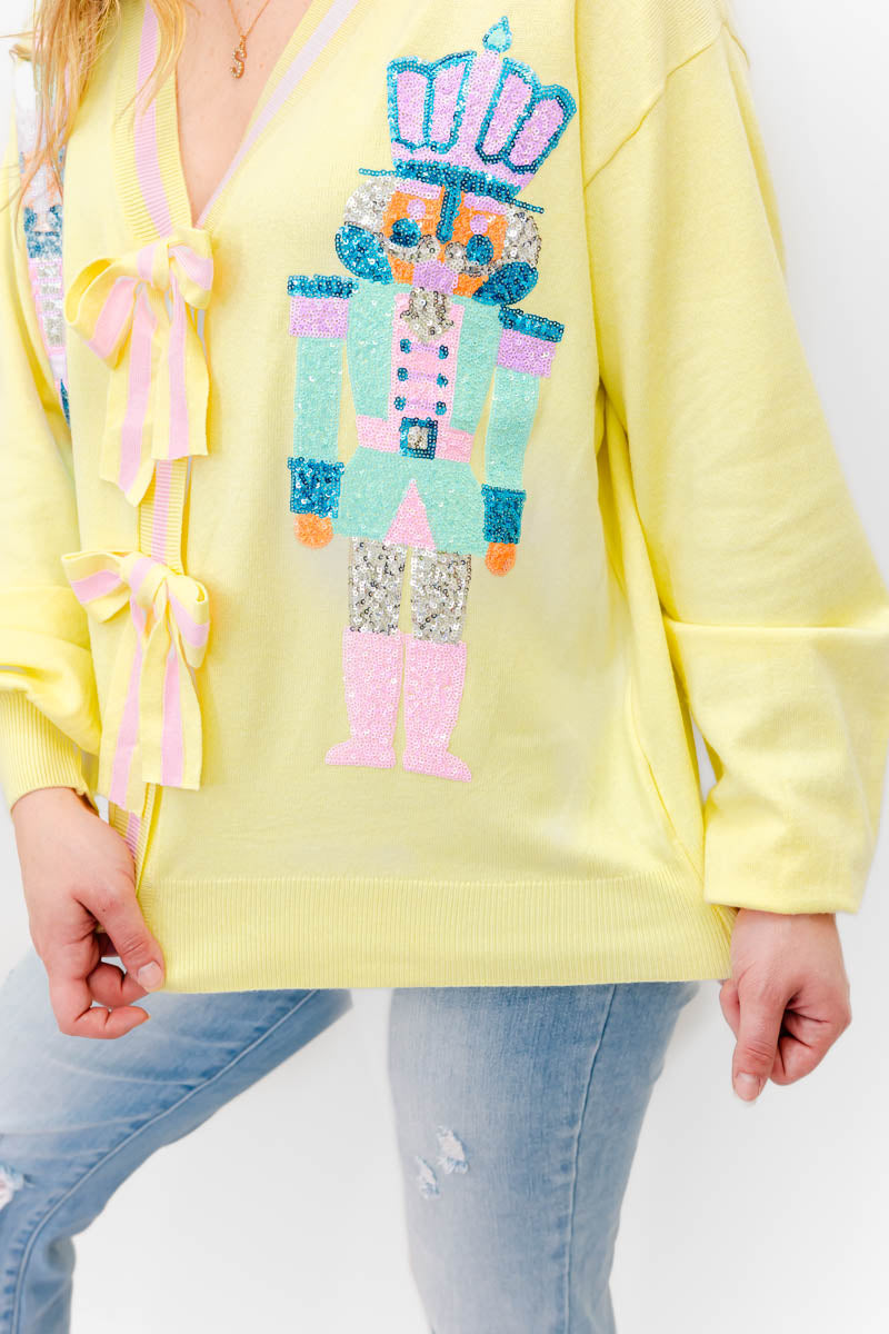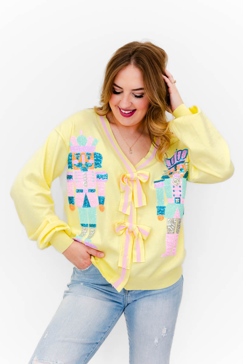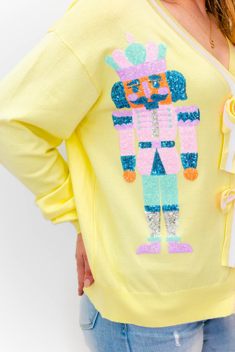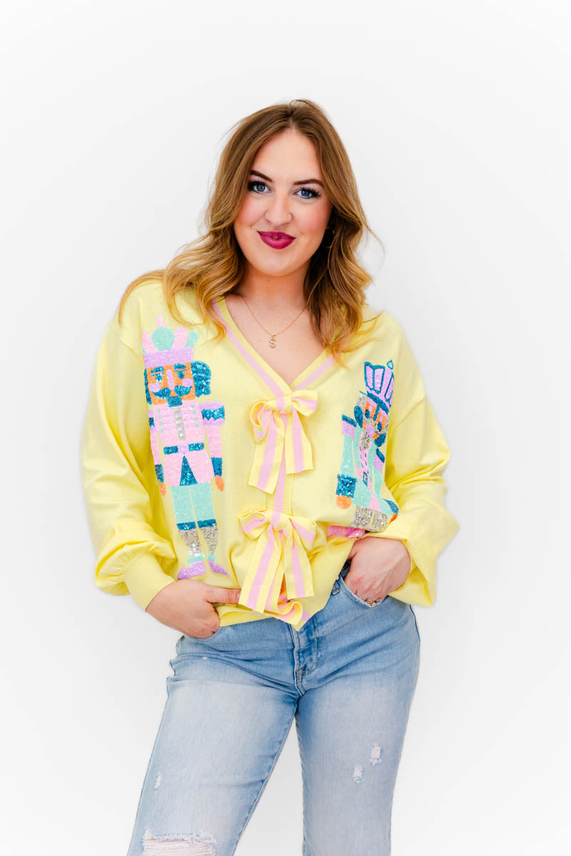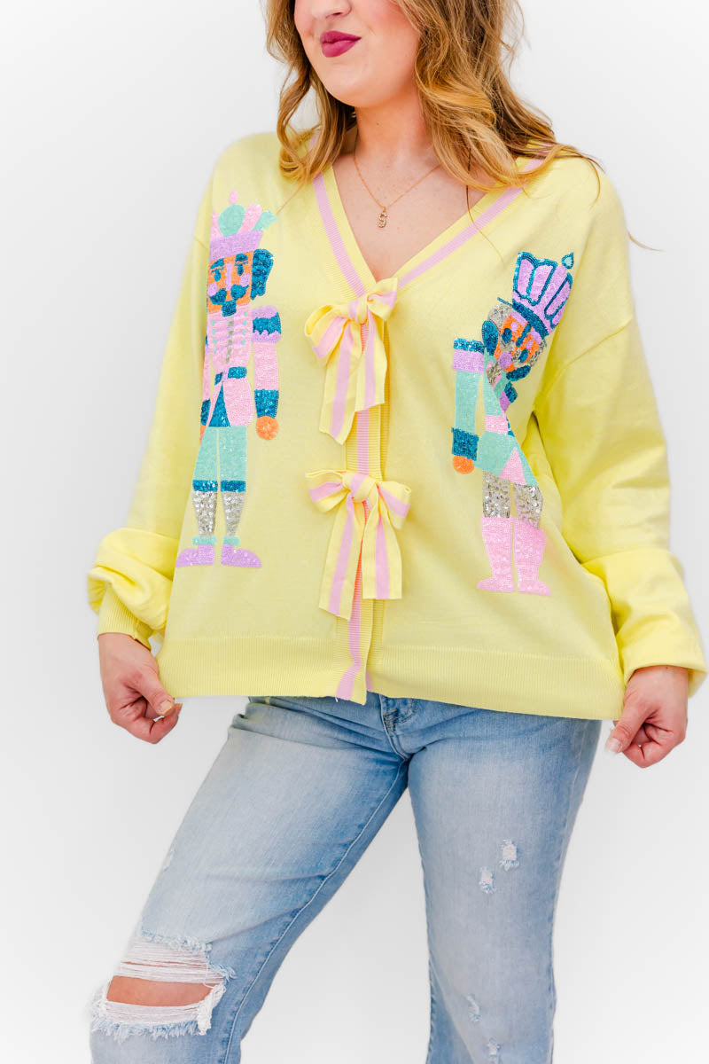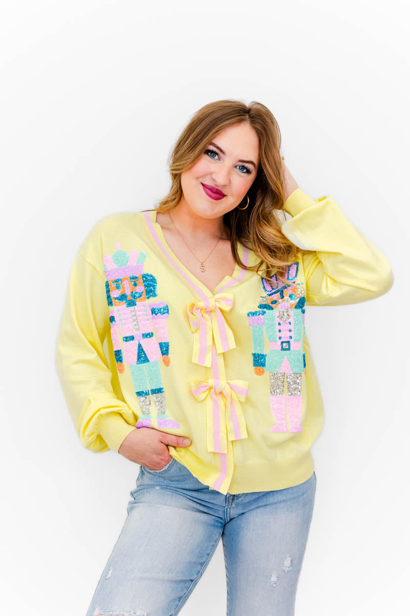 - Our Naiya Sequin Nutcracker N Bow Cardigan is super unique and will be the perfect holiday go-to. This cutie will pair perfectly with a graphic tee or turtle neck styled with your fav denim and boots.