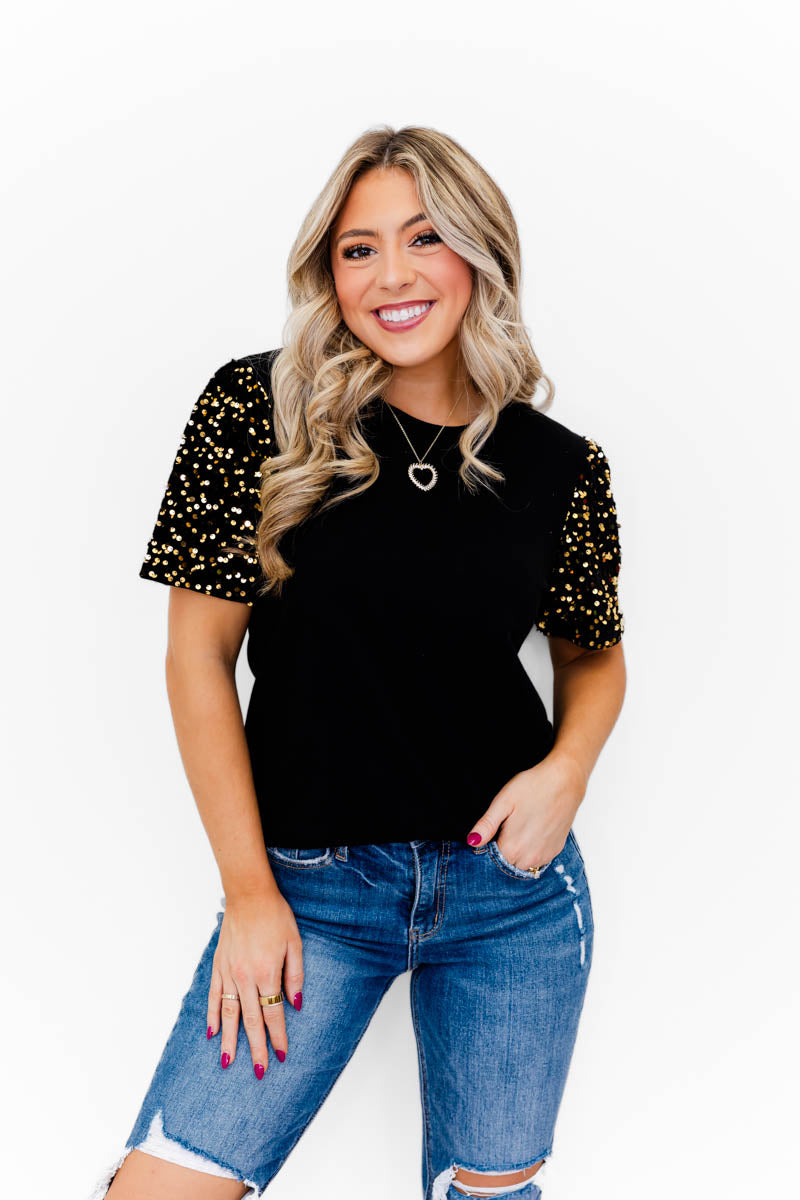 - Our Glitzy Girl Sequin Sleeve top combines classic style with a touch of sparkle courtesy of its sequin sleeves. Perfect addition to your holiday wardrobe for running around town, or a holiday party.