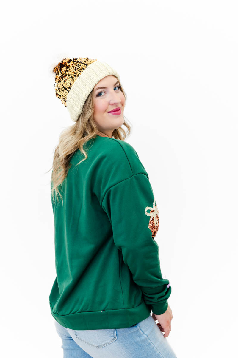 This festive green pullover is covered in colorful sequin gift boxes that shimmer with every move — the perfect mix of cozy and glam. Whether you’re wrapping presents, sipping cocoa, or heading to a holiday party, this sweatshirt keeps the vibes merry and bright!