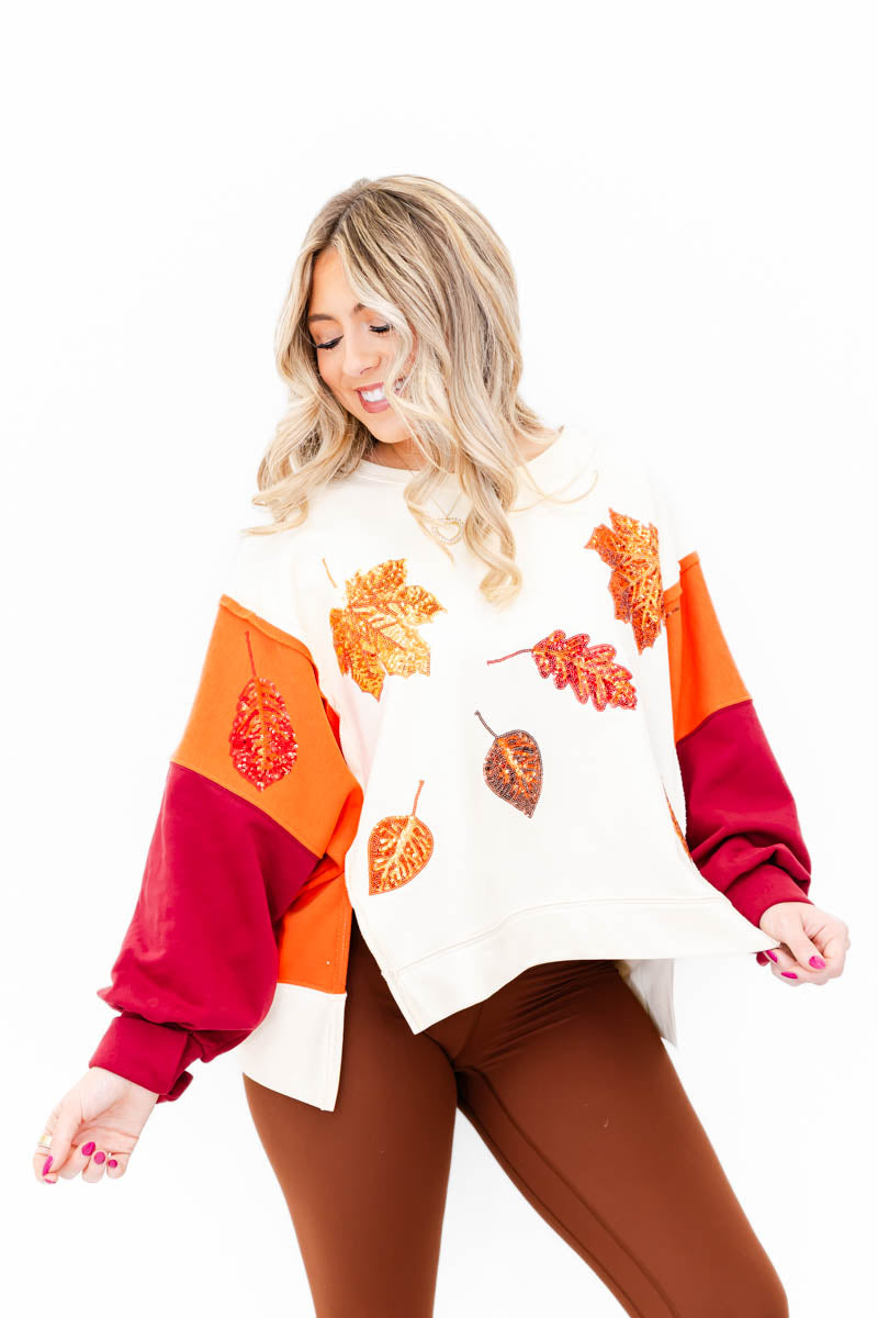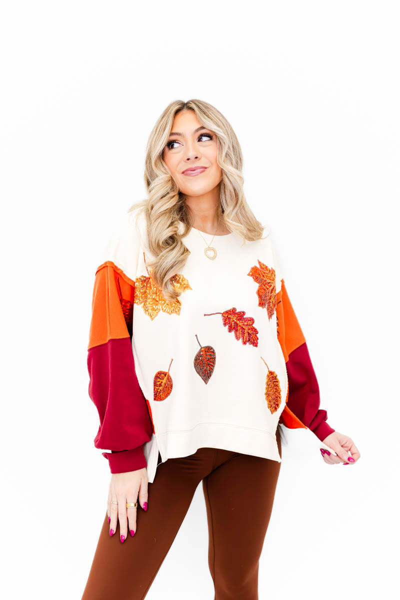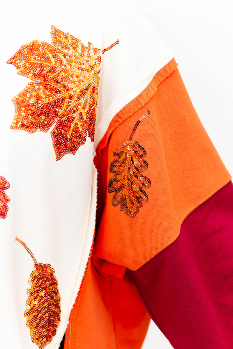 • Features include a super soft cotton fabric, a cream body with rust and  burgundy  colorblock drop shoulder full length sleeve with wide slit cuff and raw edge detail, a banded step hem, and is completed with sequin patches of leaves, in fall hues adorning the front.