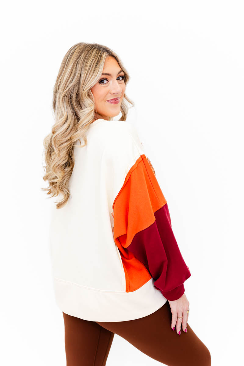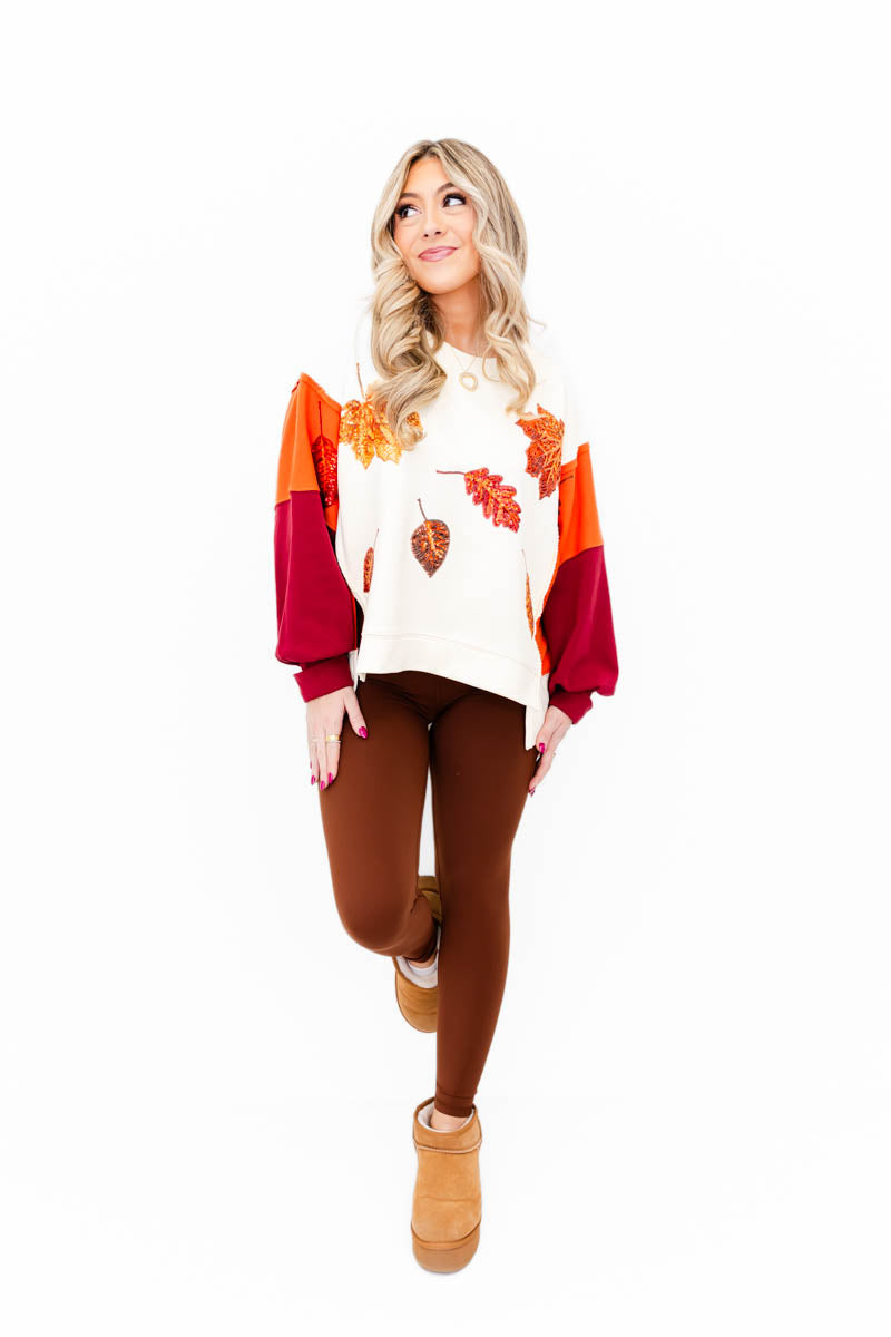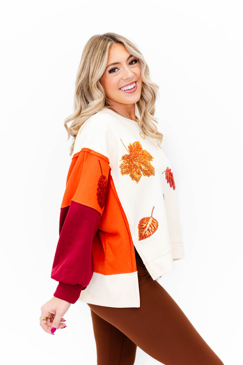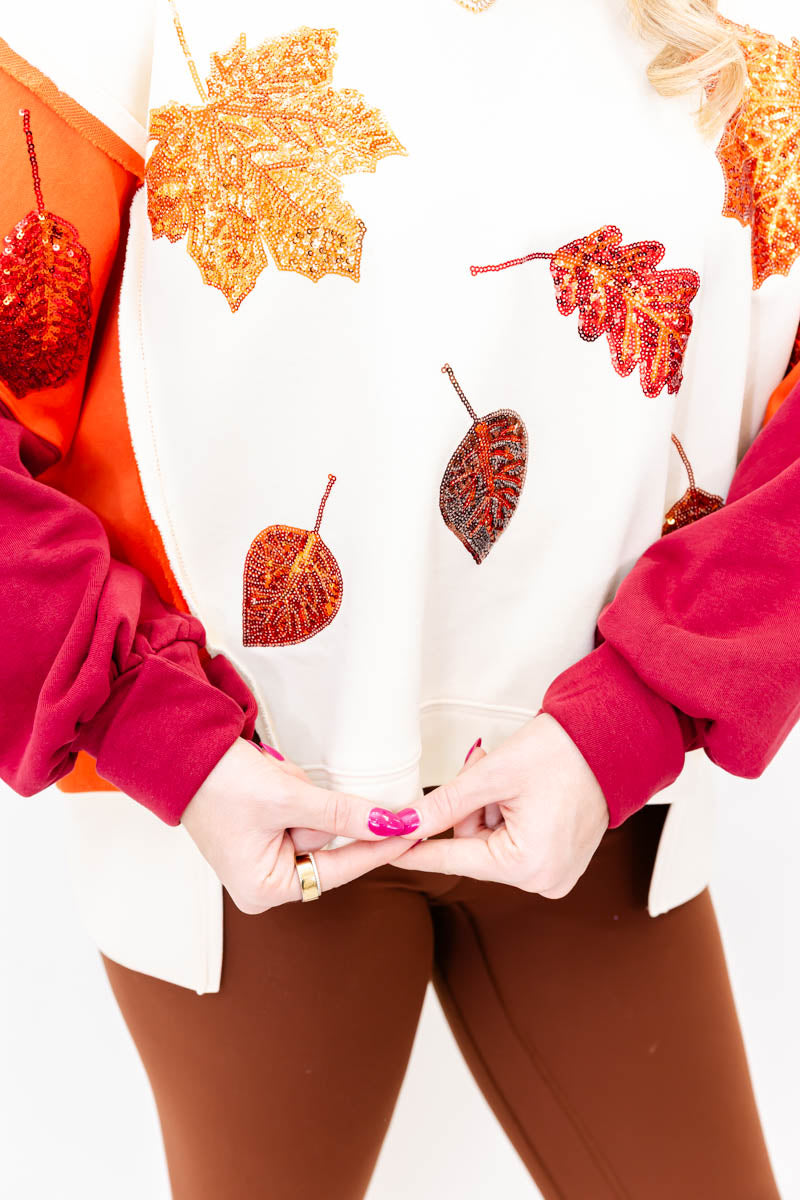 • Features include a super soft cotton fabric, a cream body with rust and  burgundy  colorblock drop shoulder full length sleeve with wide slit cuff and raw edge detail, a banded step hem, and is completed with sequin patches of leaves, in fall hues adorning the front.