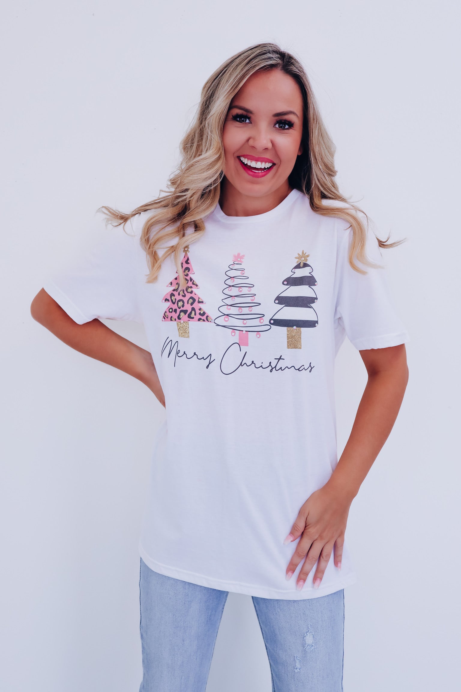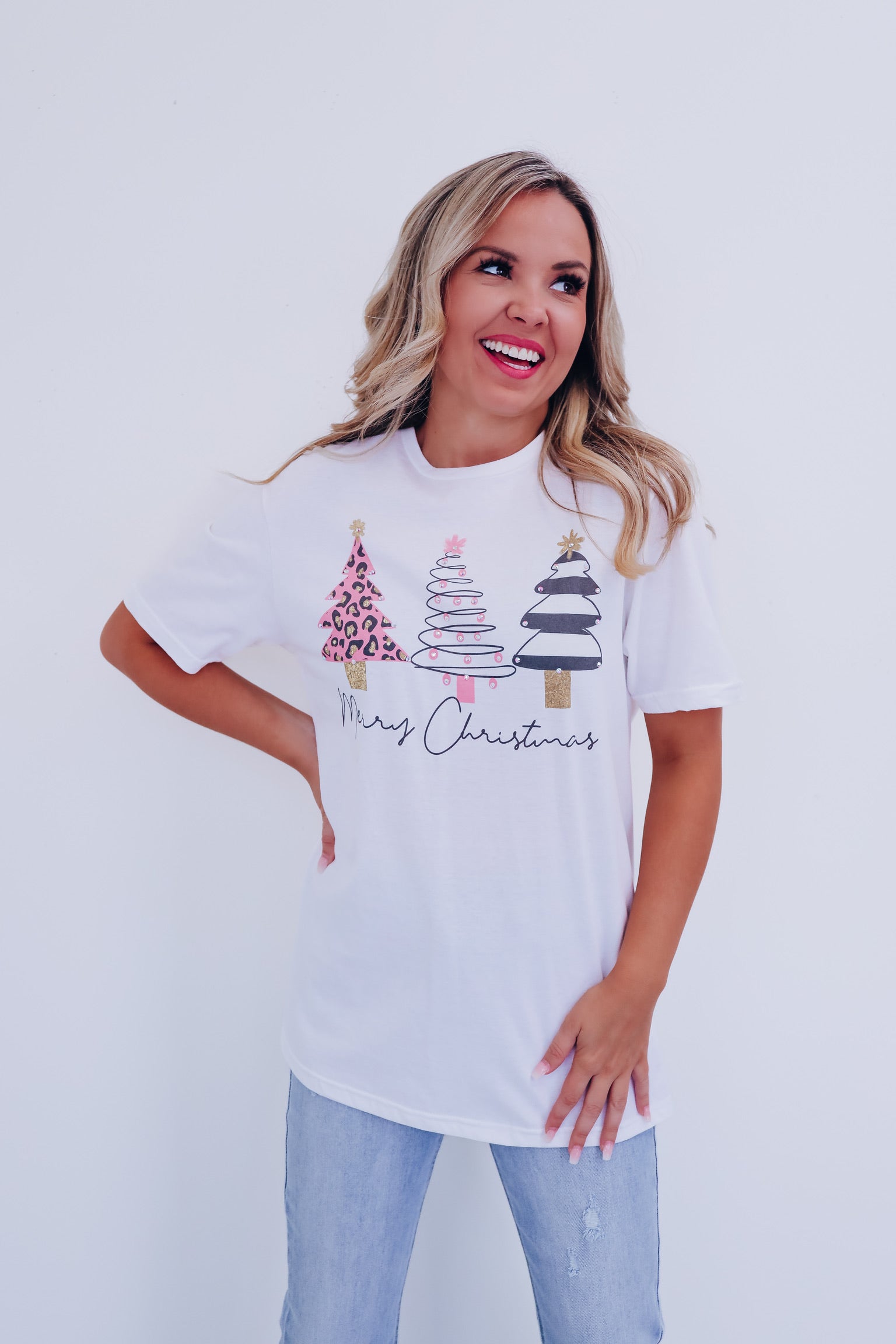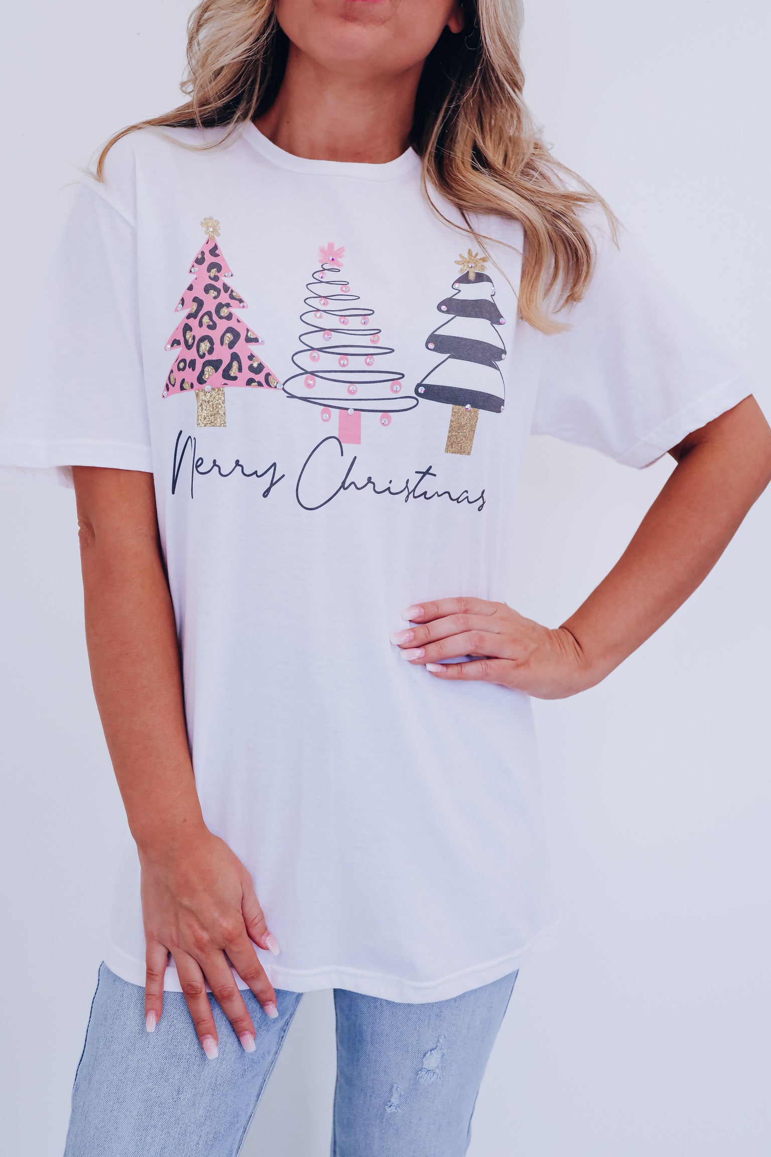 - Features a natural cotton base, a crew neck, short sleeves, graphics of 3 Christmas trees in a leopard print, a swirl design, and a black and white tree all adorned with iridescent stones.
