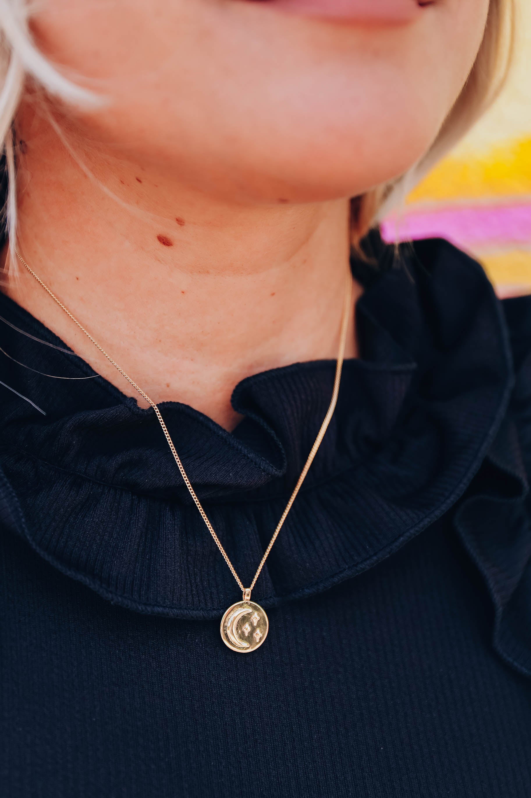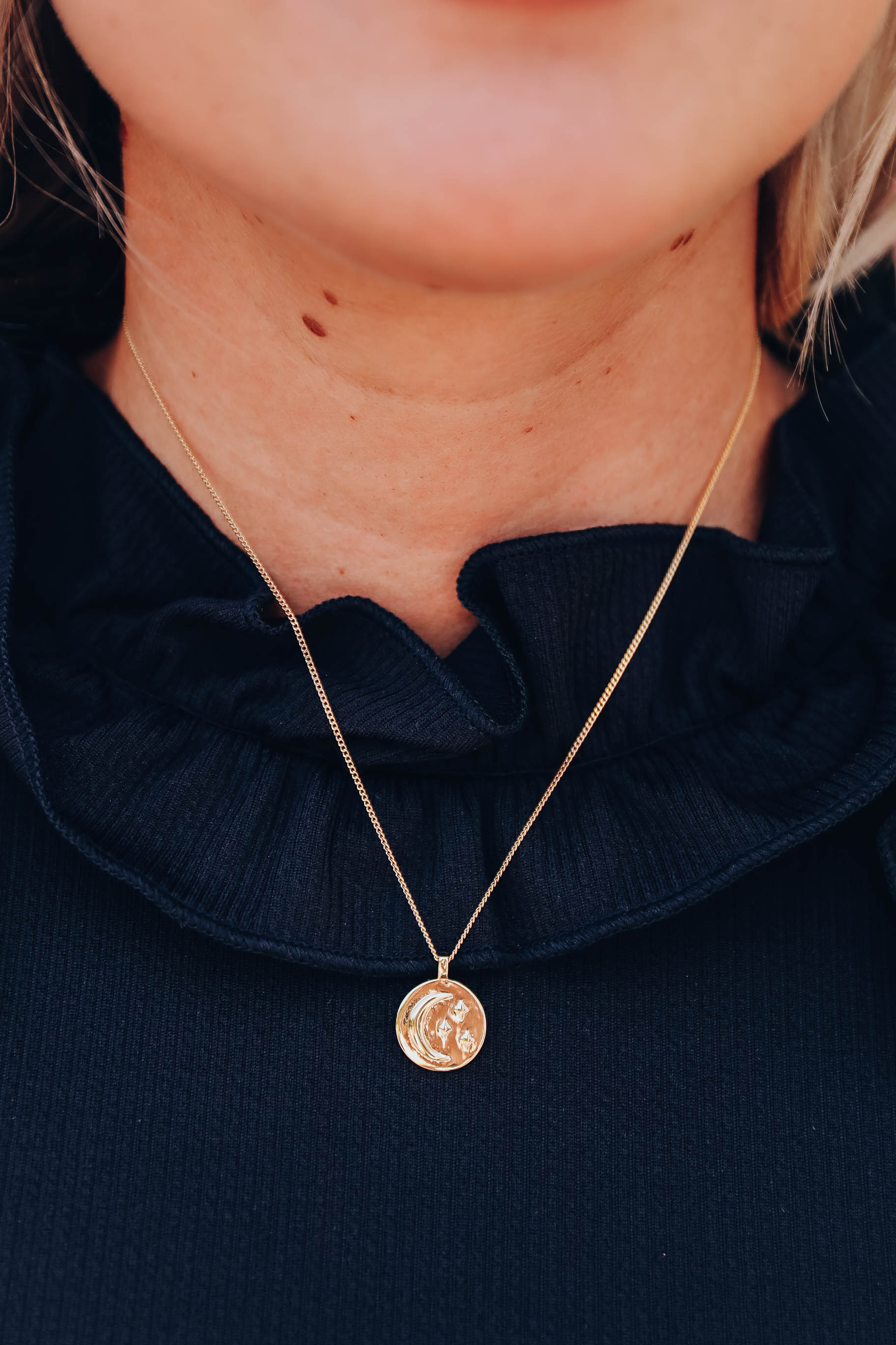 - A celestial charm with a 1/4 moon and stars embossed on it with it's dainty chain makes this perfect for everyday wear.