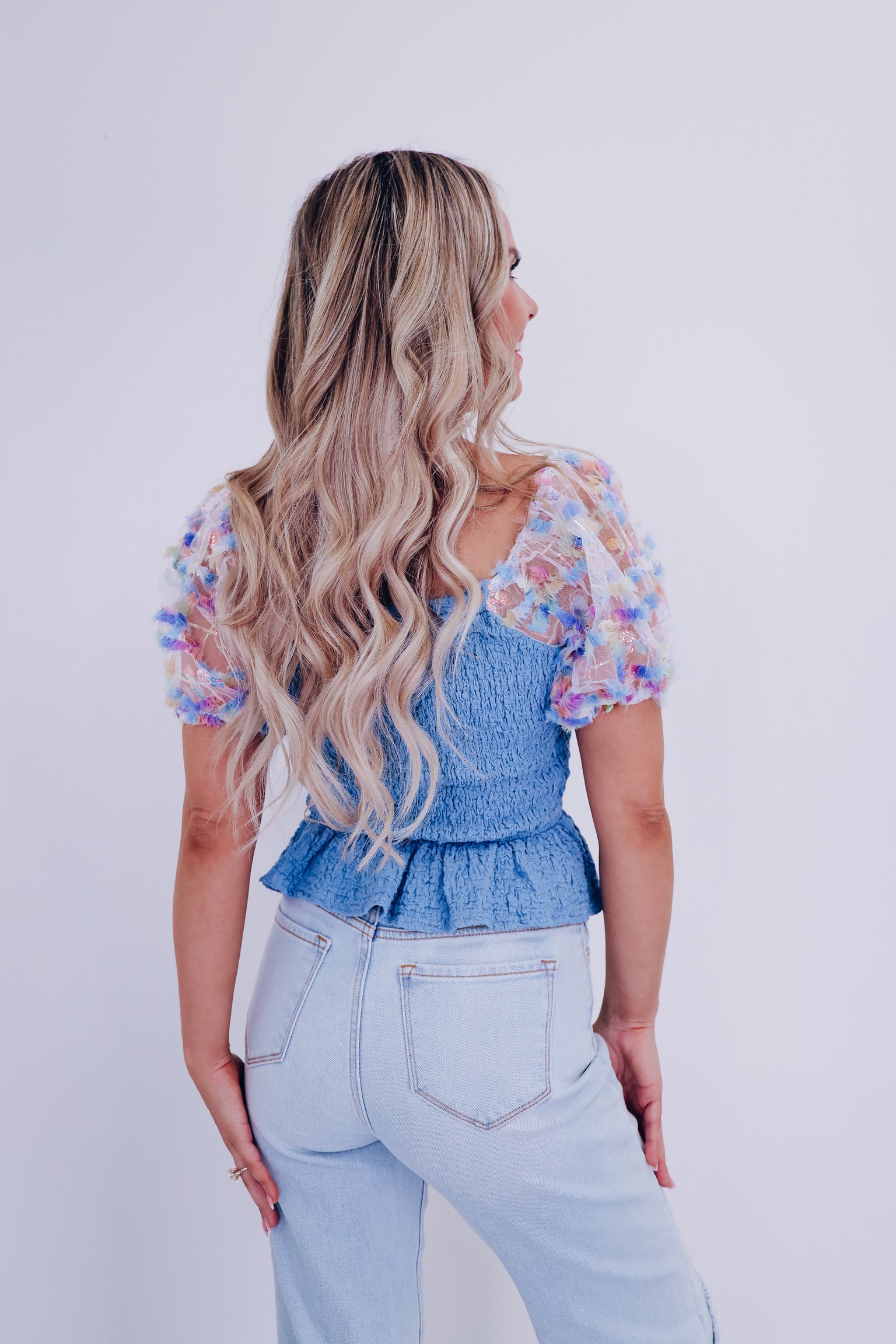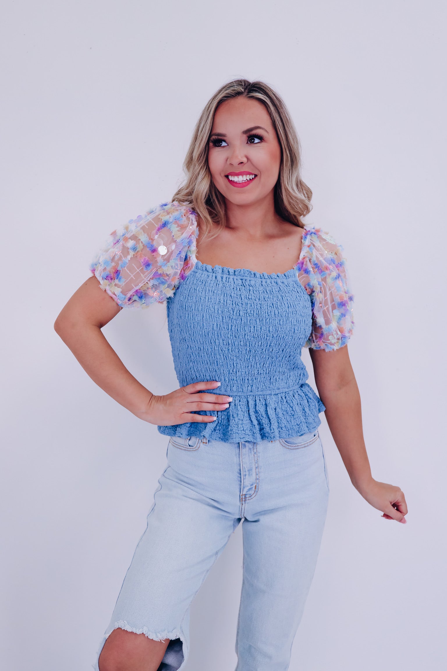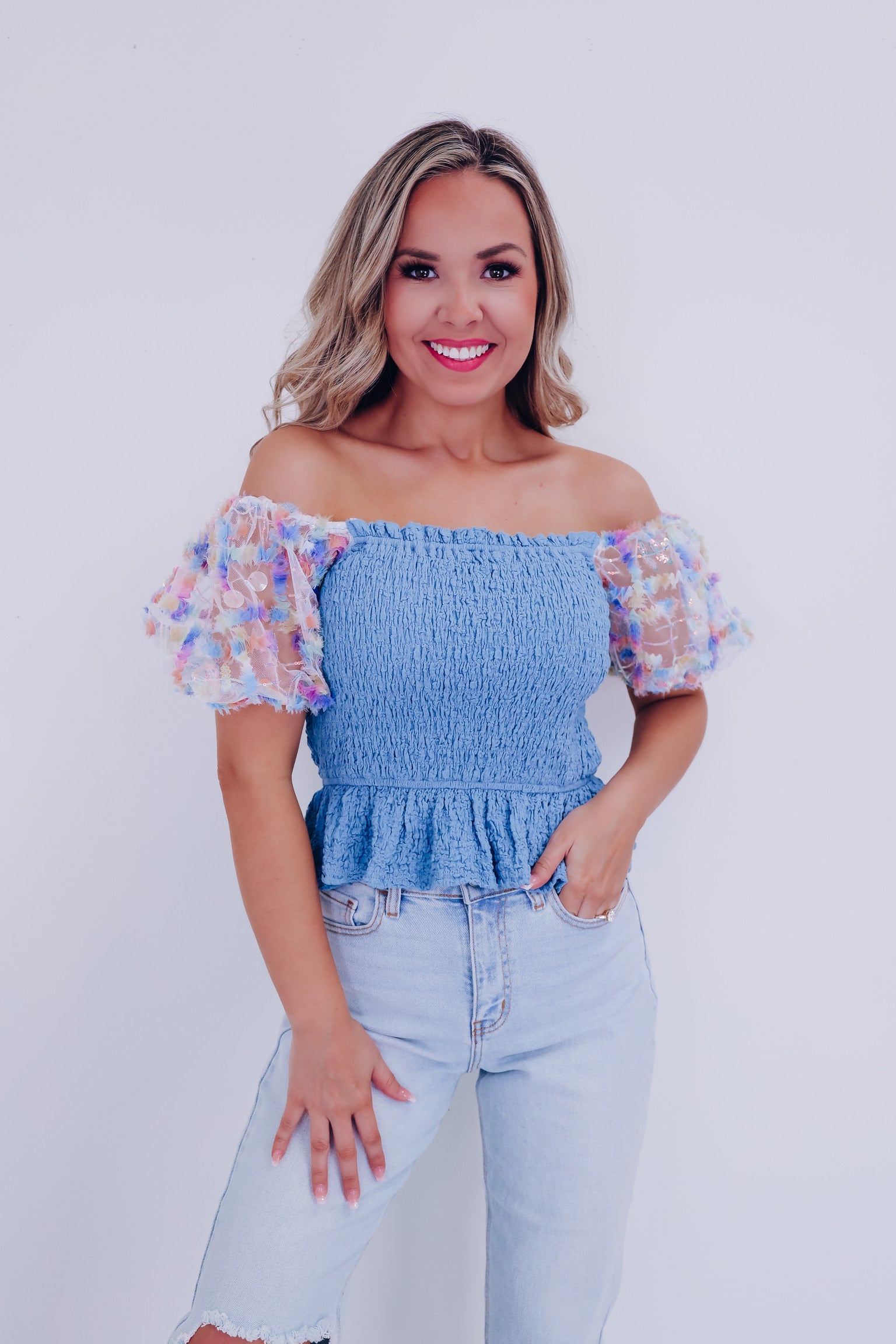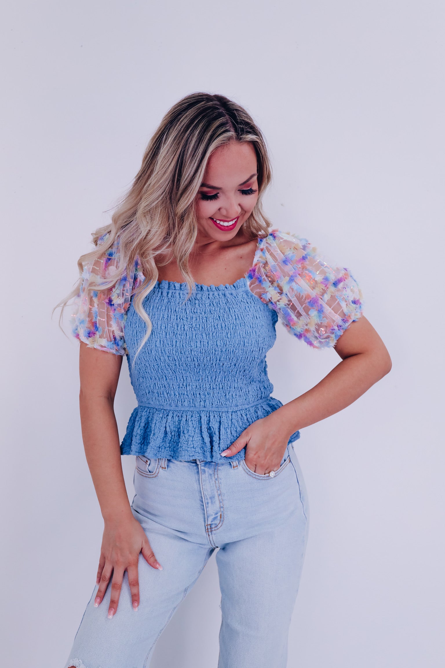 - This smocked body crop top features a square neck, a ruffled hem, and a short puff mesh sleeve adorned with small and large round iridescent sequins and bits of multi-color furry fabric.