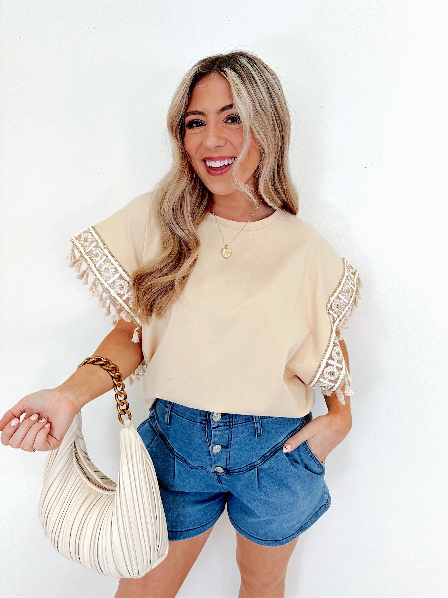 Our Amelia Embroidered Tassel Trim Top exudes a chic classy vibe that can be effortlessly styled for any occasion. Its comfy boxy design pairs perfectly with your favorite bottoms, creating a stylish option for a trendy OOTD.