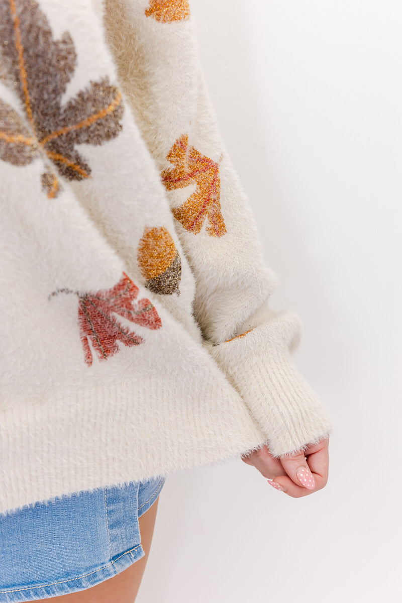 - Featuring a super soft nylon fabric, a ribbed crew neck, autumn leaves throughout with metallic tinsel, drop shoulder long sleeves, ribbed cuffs, and a straight ribbed hem.
