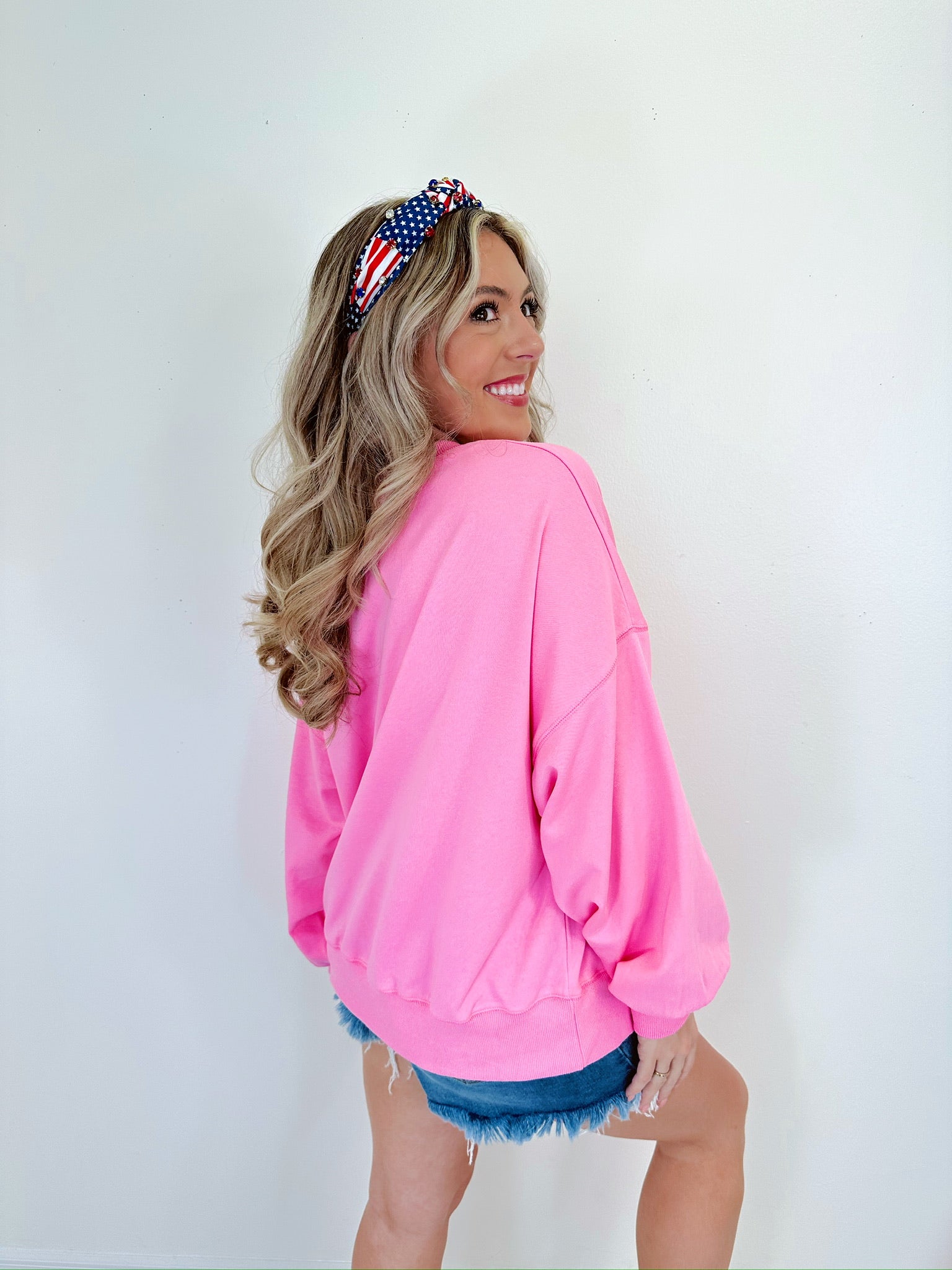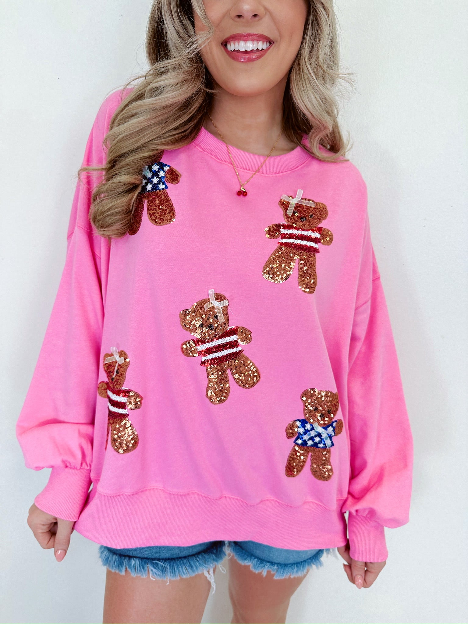 - Festive and snuggly our Bear-y Patriotic Sequin Sweatshirt is so stinking cute! We couldn't resist the sparkling combination of bears and the classic red, white, and blue colors. Pair with your favorite denim or even a frilly skirt for a trendy OOTD.