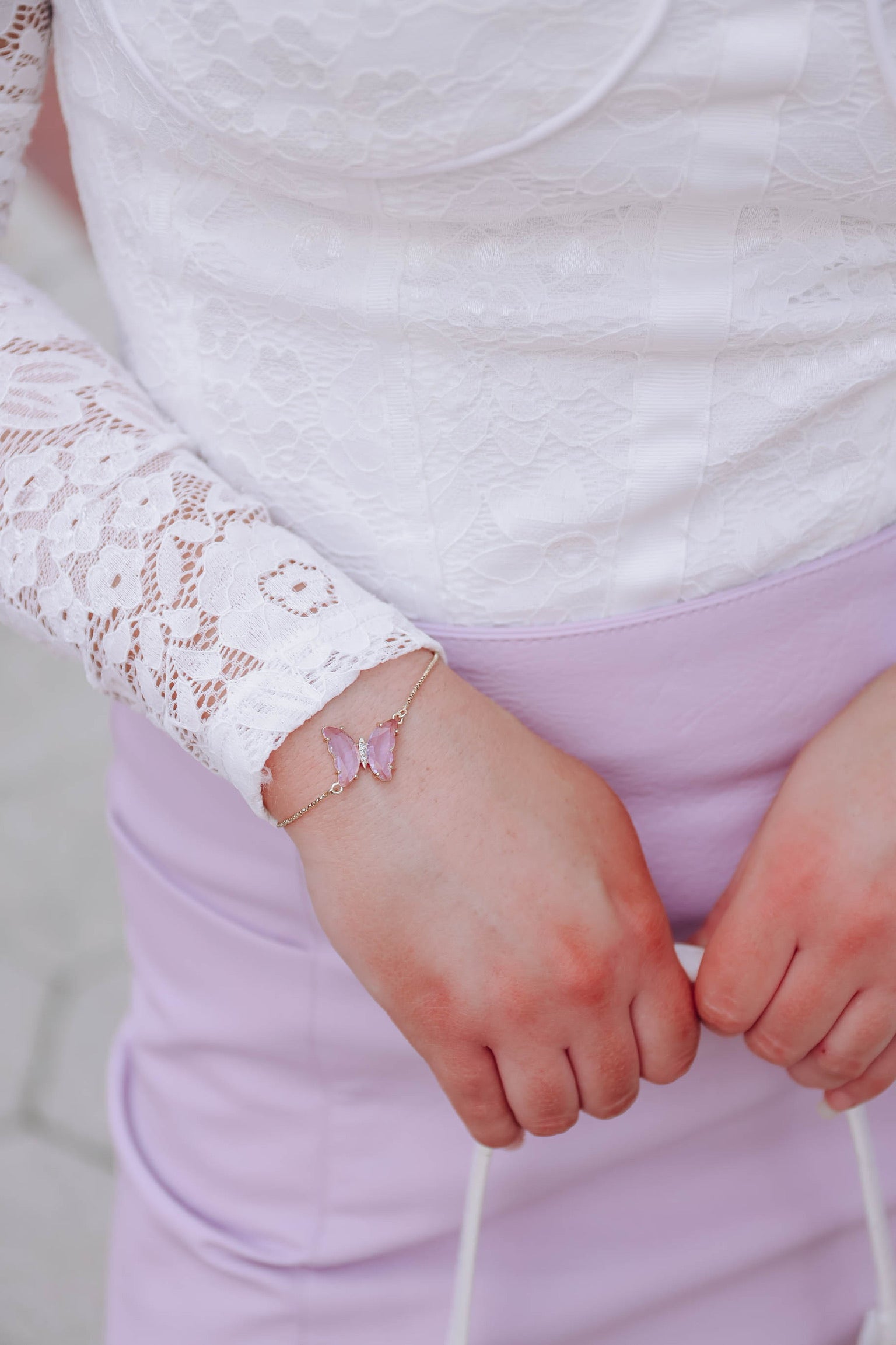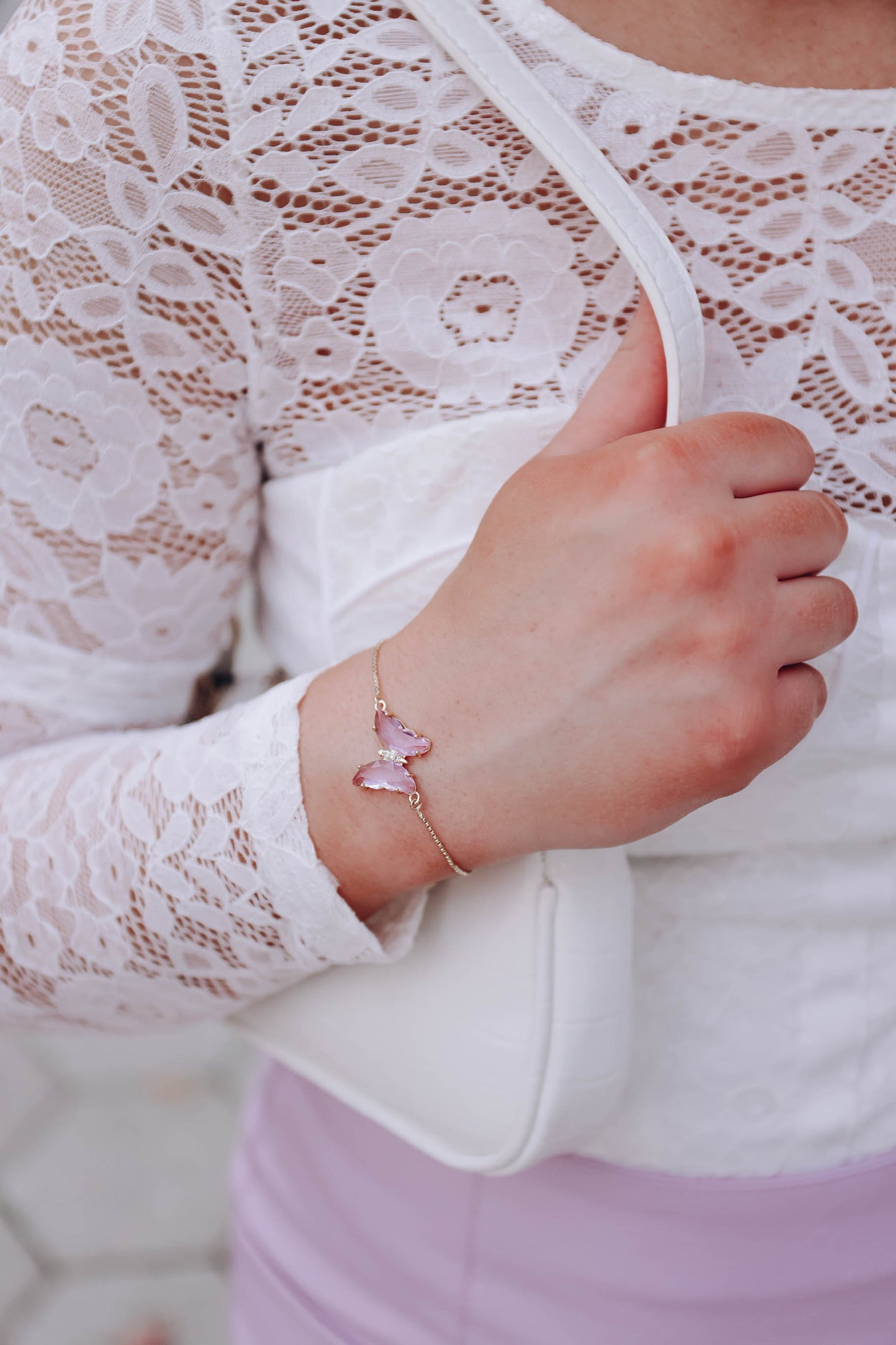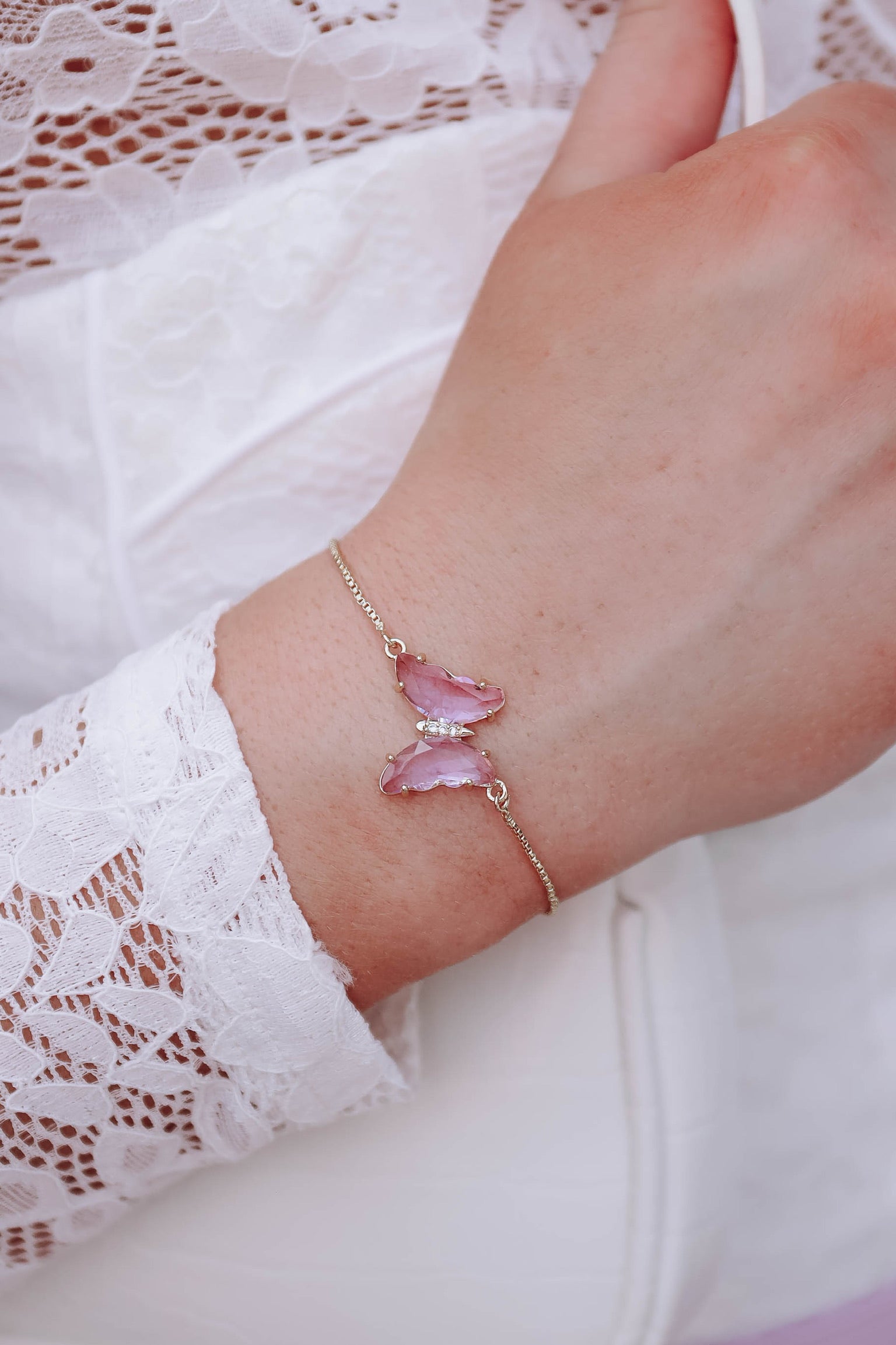 - Add a girly touch to your OOTD with our adjustable bracelet with a dainty purple crystal butterfly pendant.