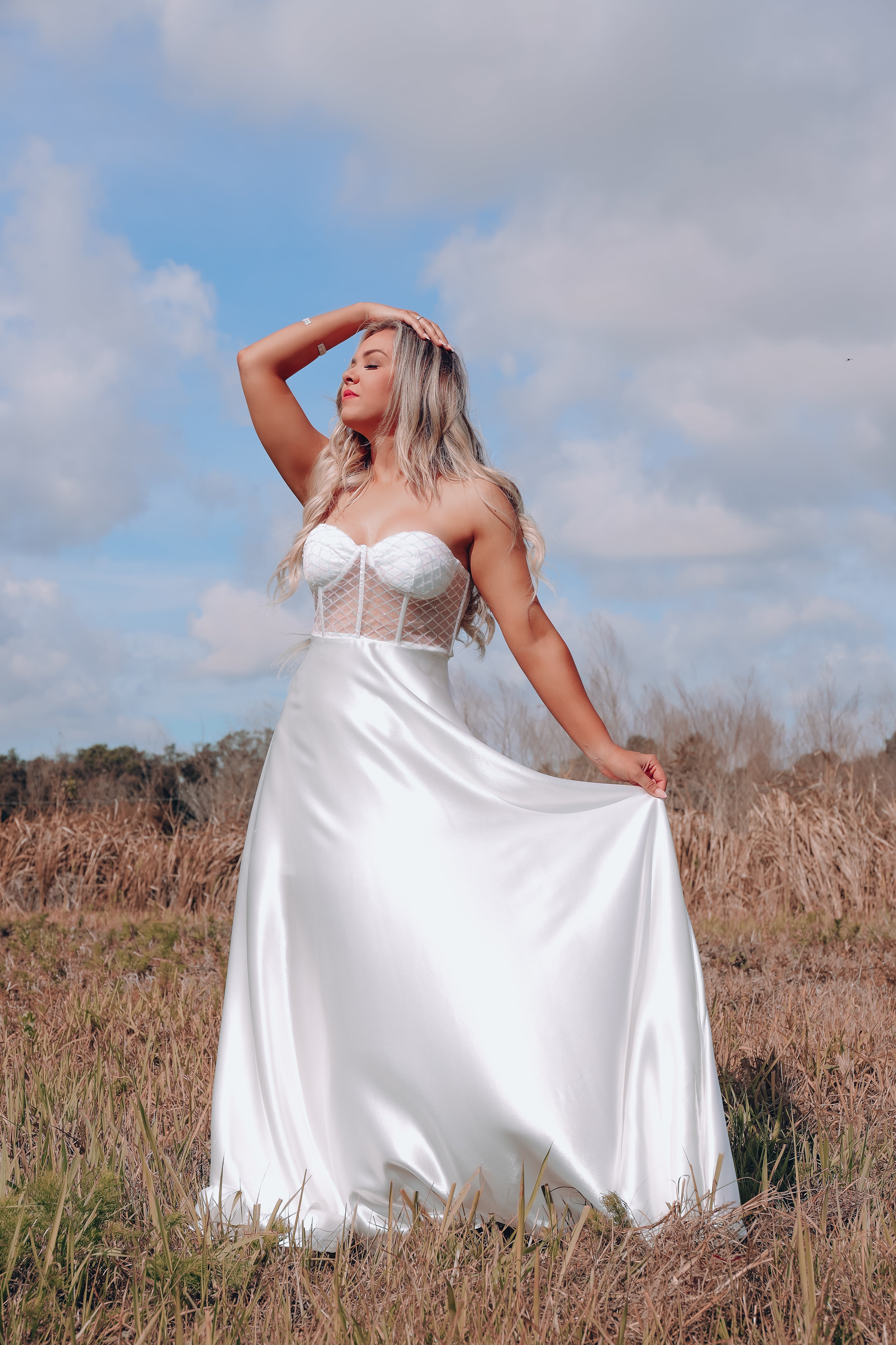 - Cheers to the new bride!! This beauty will be the perfect after dress or a minimalistic bridal gown. We added a pop of bling with our stunning Crystal Open Cuff Bracelet